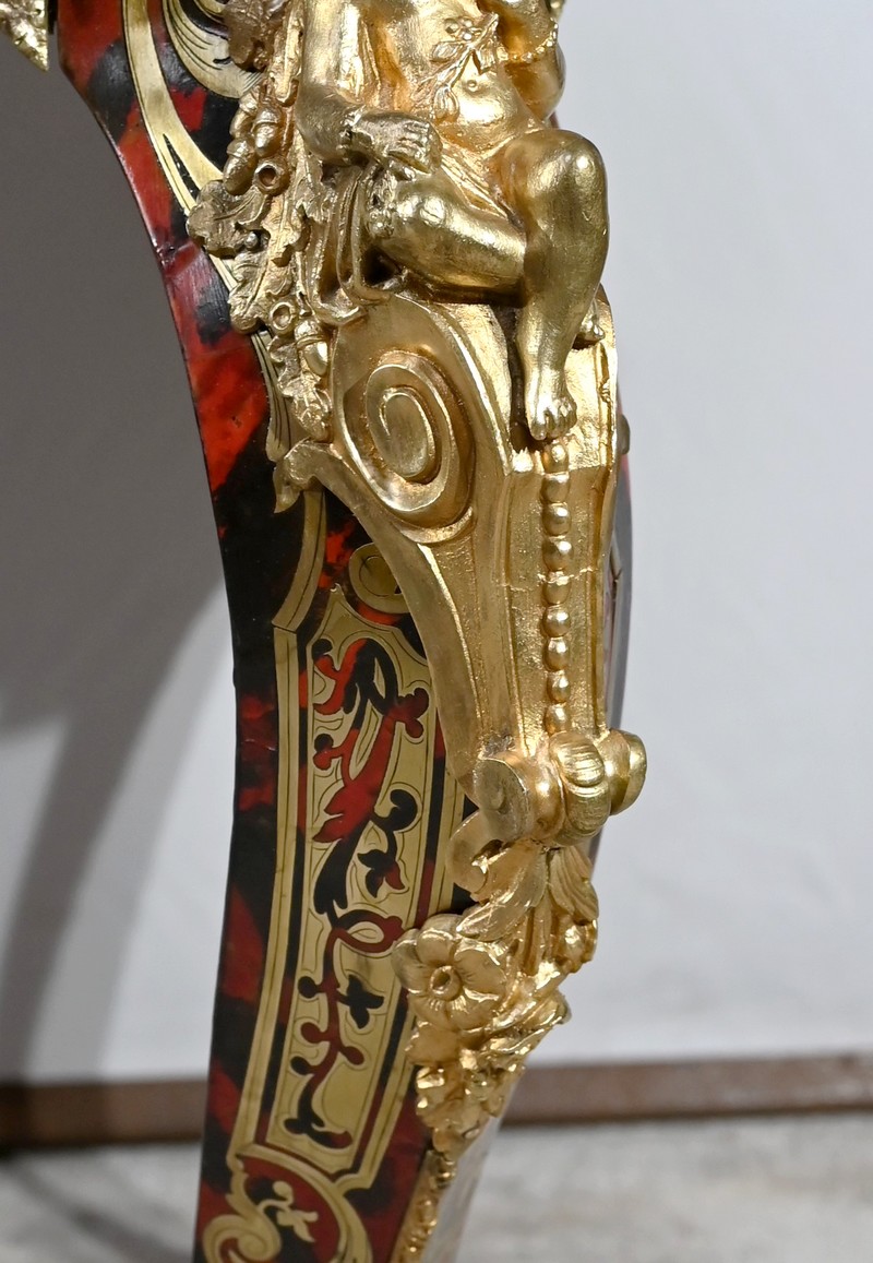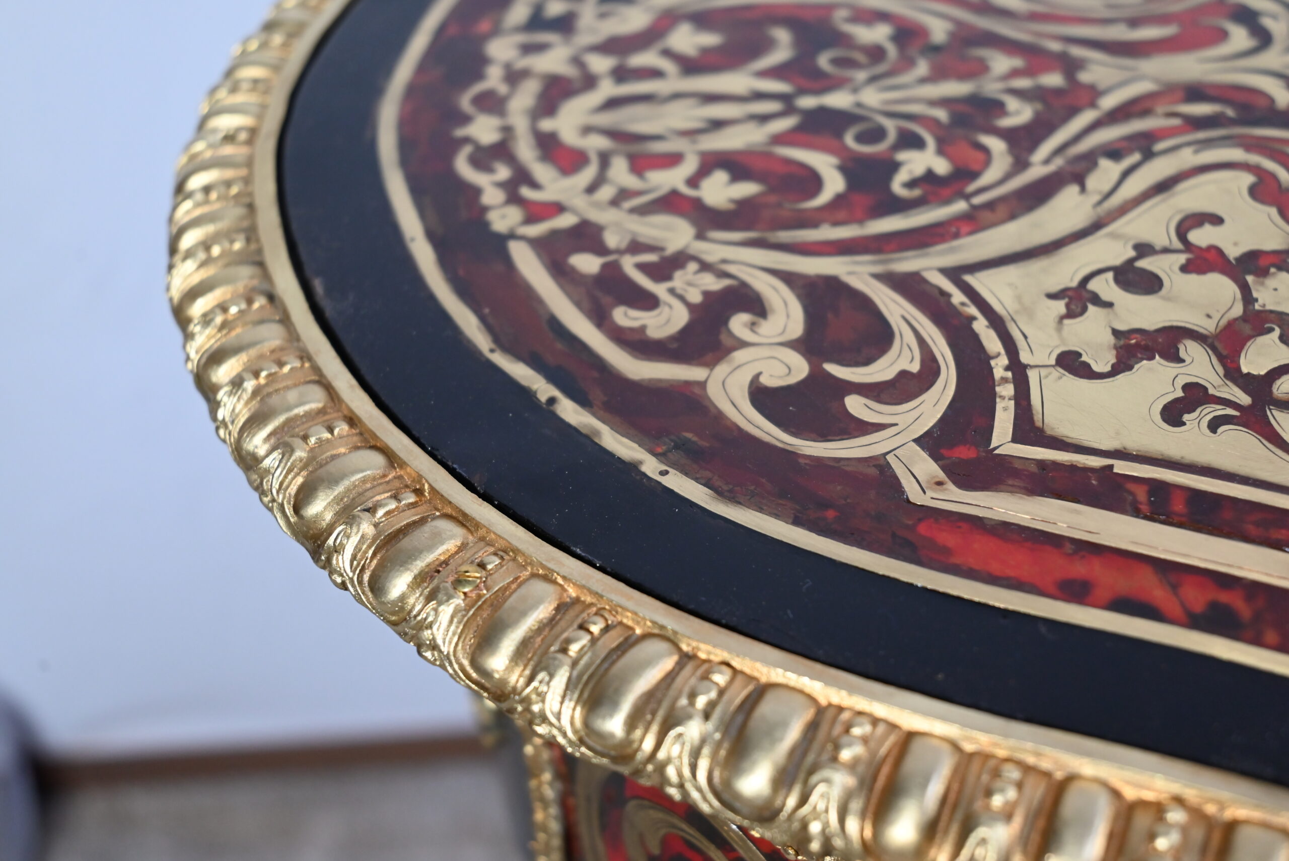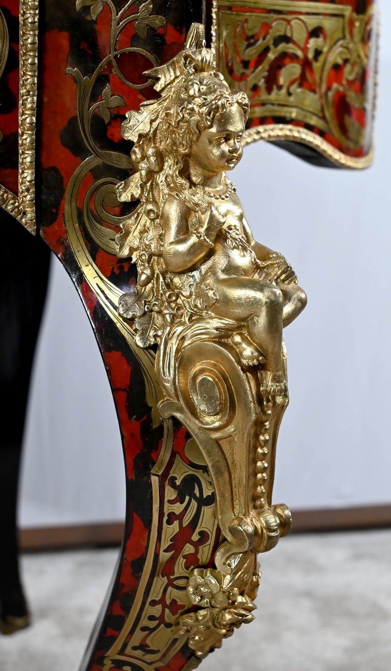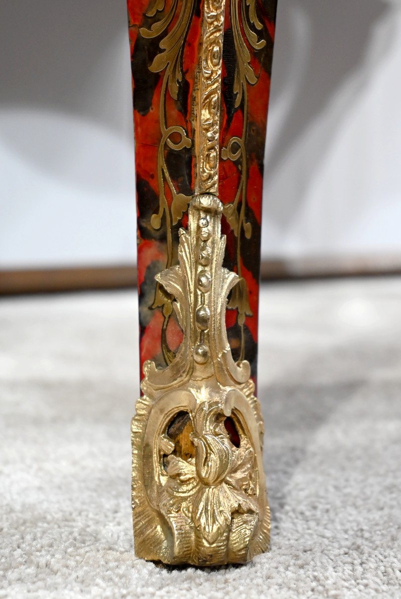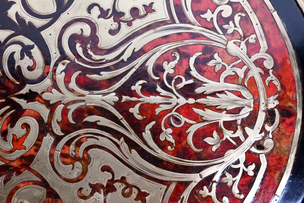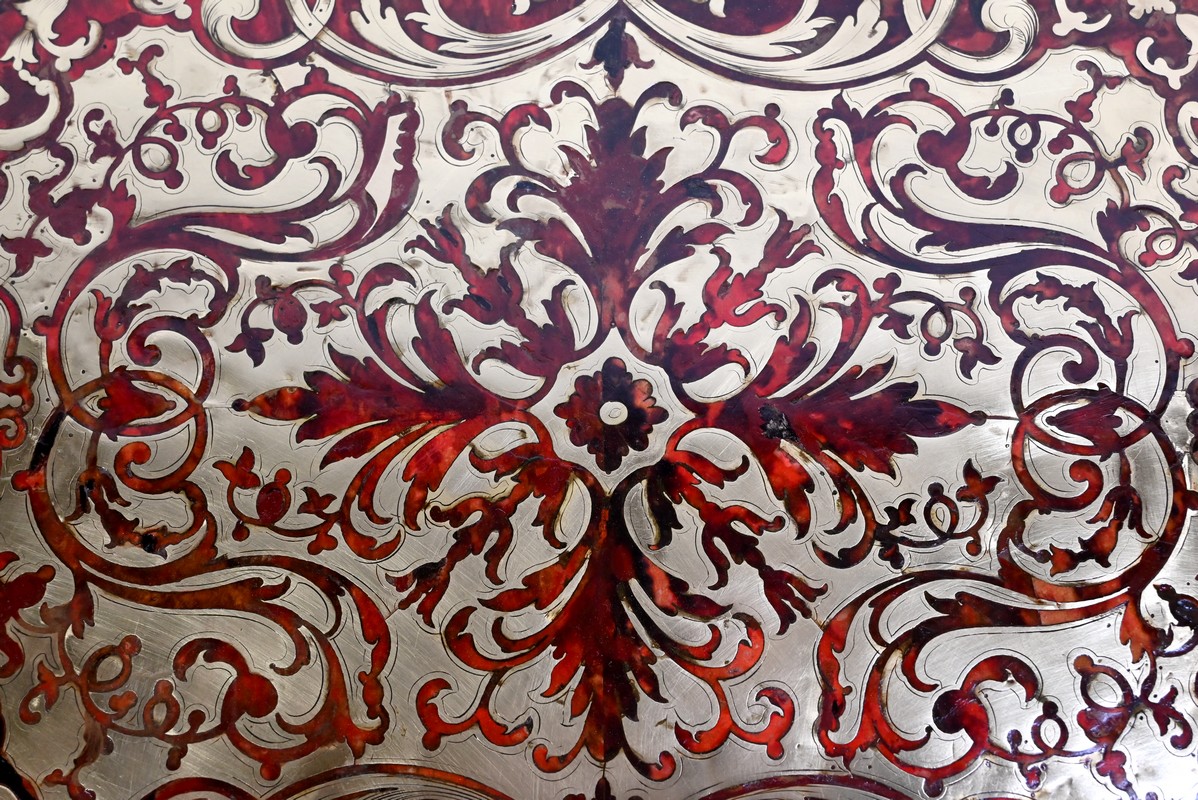Le plateau présente une marqueterie de volutes, de rinceaux et de fleurs en laiton finement ciselé, sur fond d’écailles de tortue, soulignée par une baguette en bronze dans le pourtour.