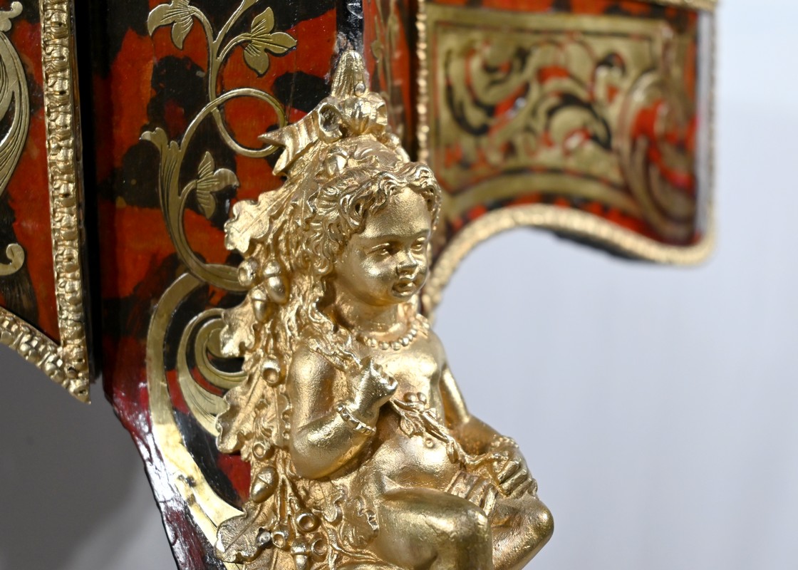 L’ensemble repose sur quatre pieds galbés. Ornés habituellement d’espagnolettes, on retrouve ici de rares sculptures intégrales de chérubins, en position assise, les jambes croisées.