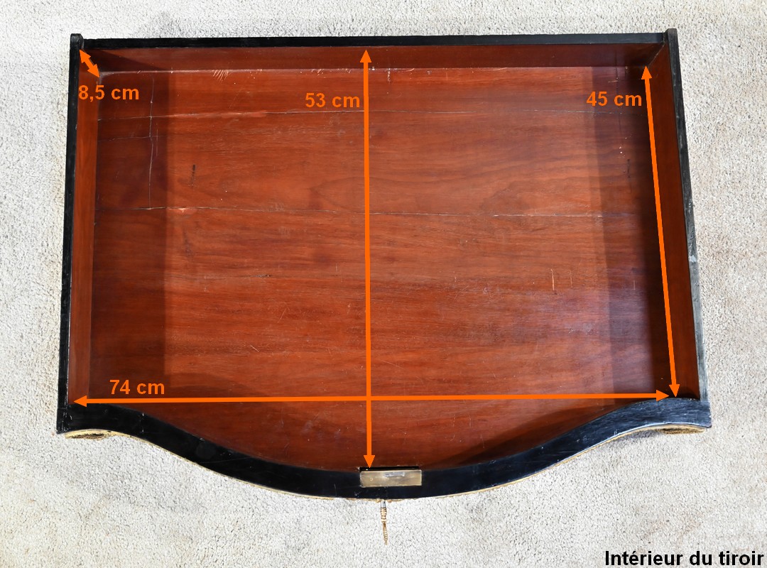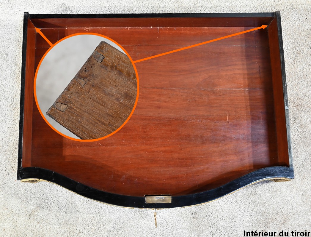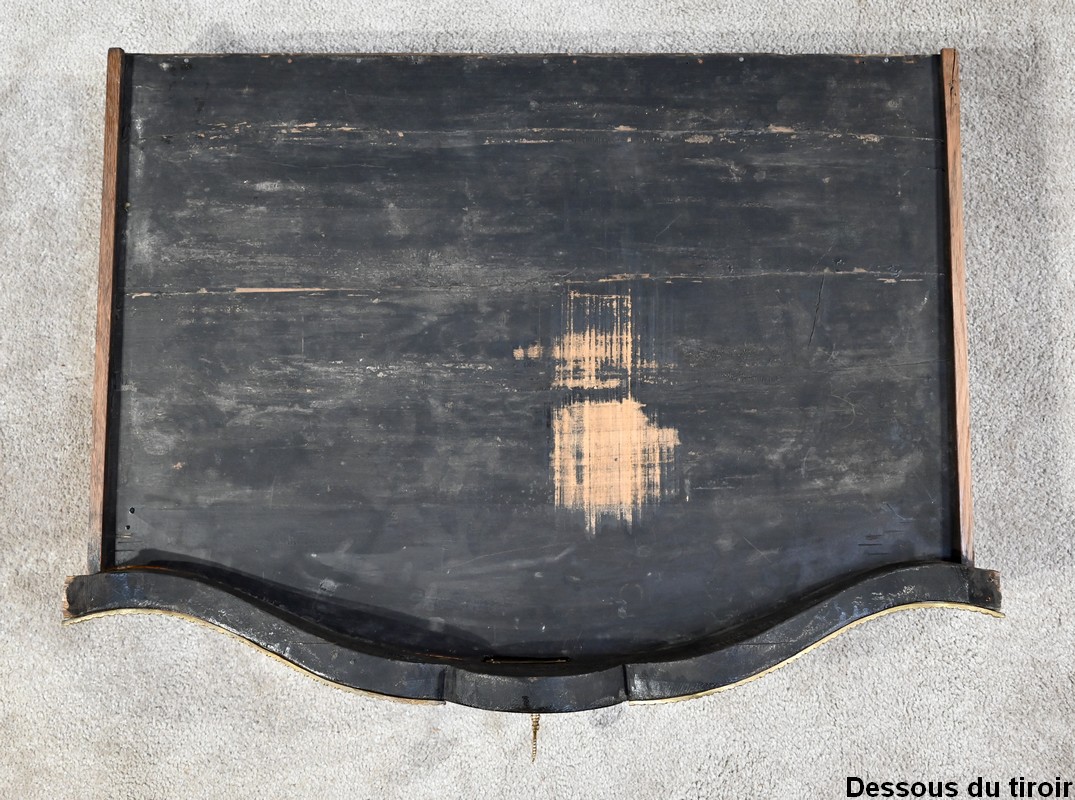 La ceinture galbée, épousant les lignes du dessus, ouvre en façade par un grand tiroir équipé d’une serrure d’origine fonctionnelle avec clé. Ce tiroir est entouré d’une baguette en bronze et présente en son centre une importante entrée à l’effigie du roi soleil.