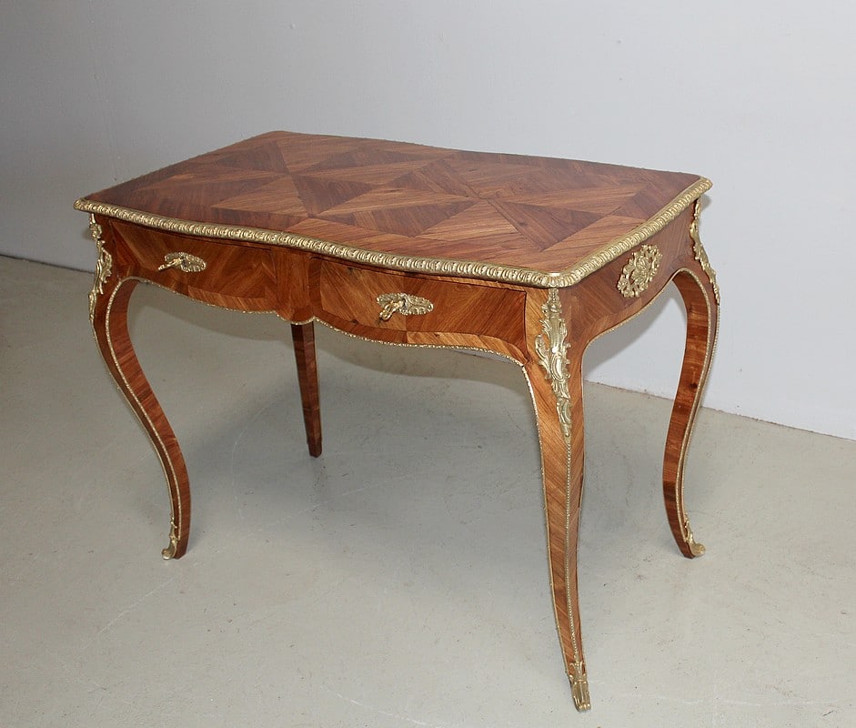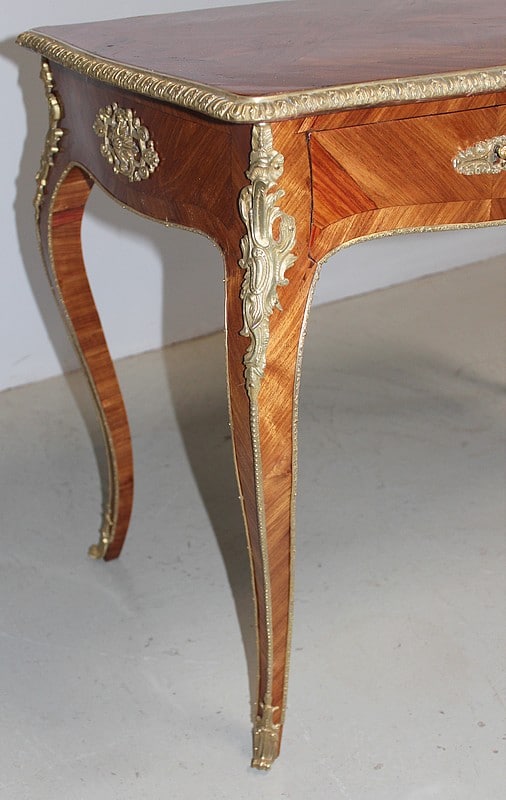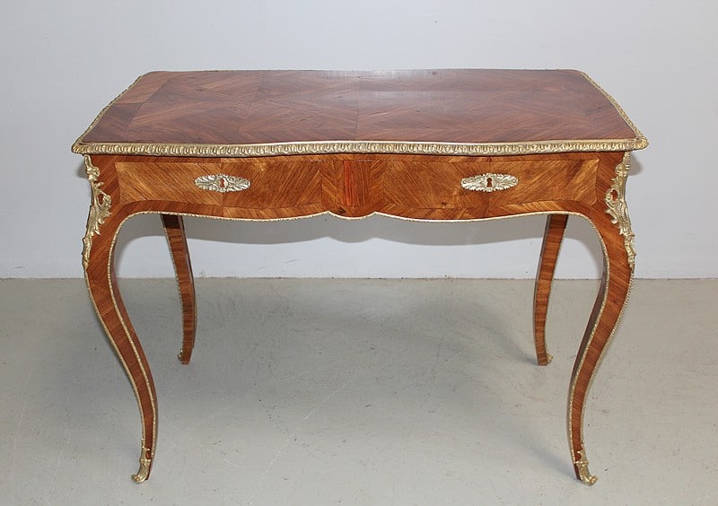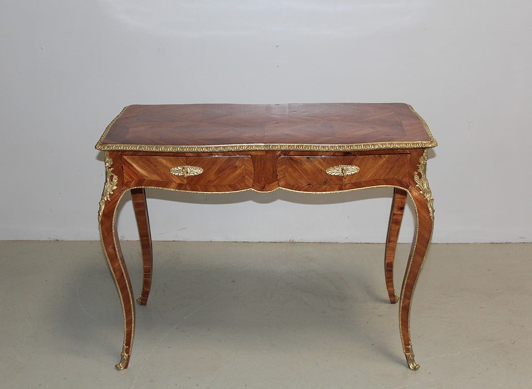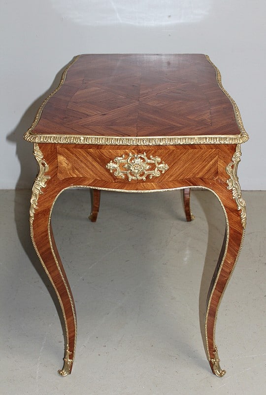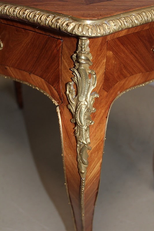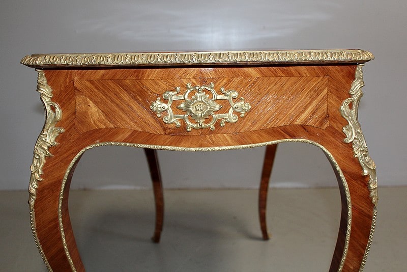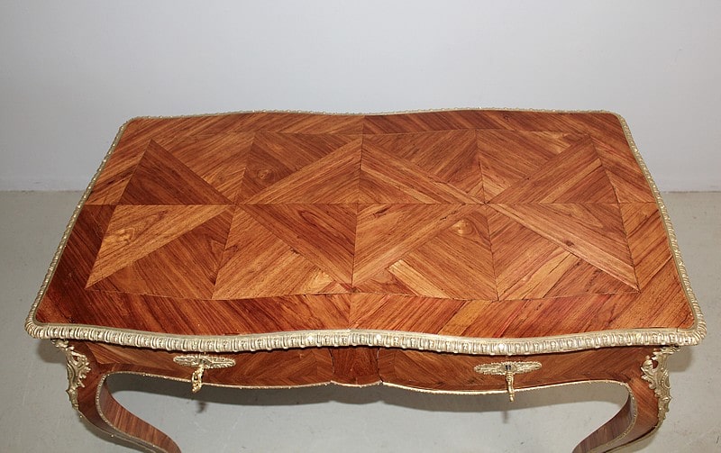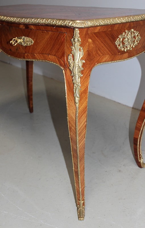 Table d’apparat de style Louis XV en marqueterie de Bois de Rose avec filet de citronnier sur le dessus.