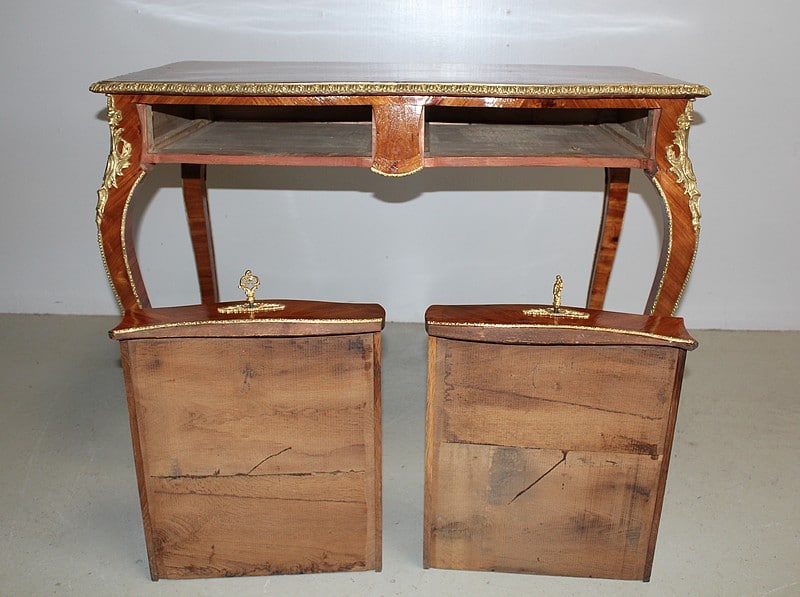 Elle ouvre par 2 tiroirs dans la ceinture dont les intérieurs sont en chêne, et elle repose sur 4 pieds galbés habillés de filets de laiton et terminés par des sabots de bronze.