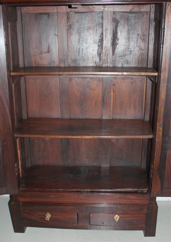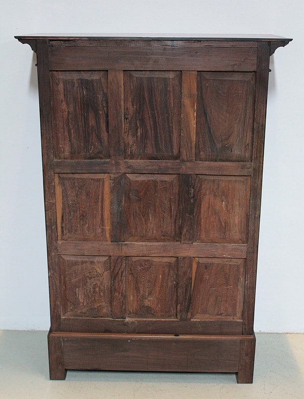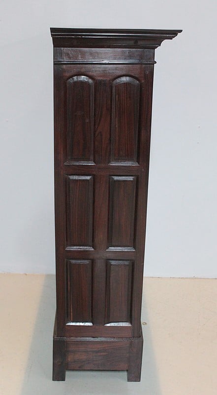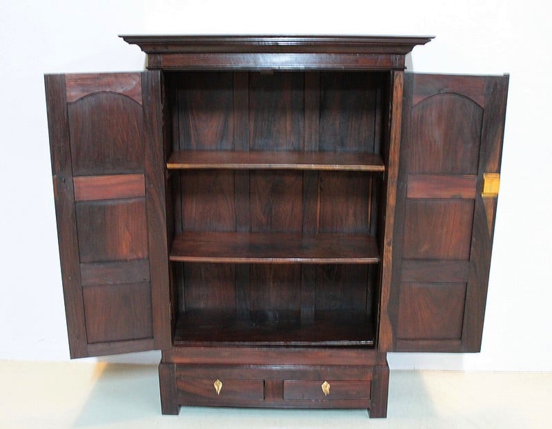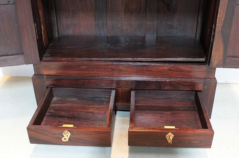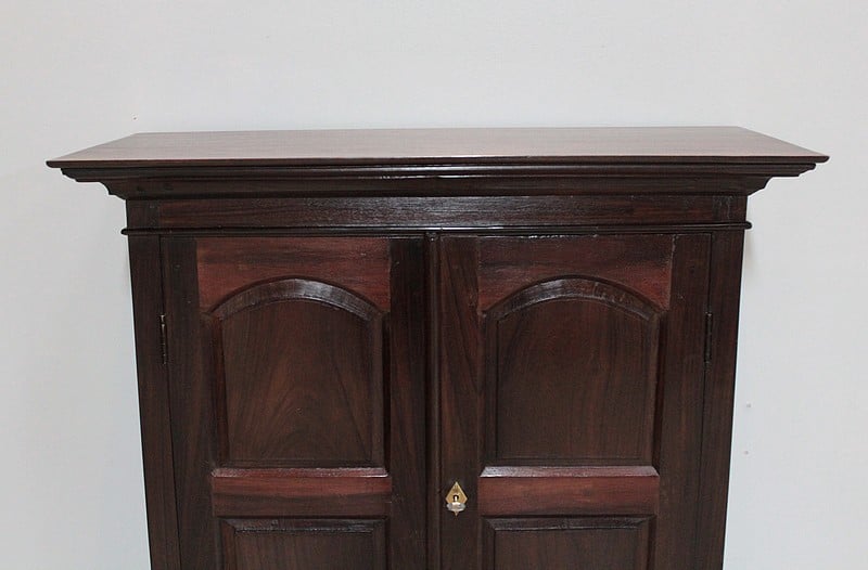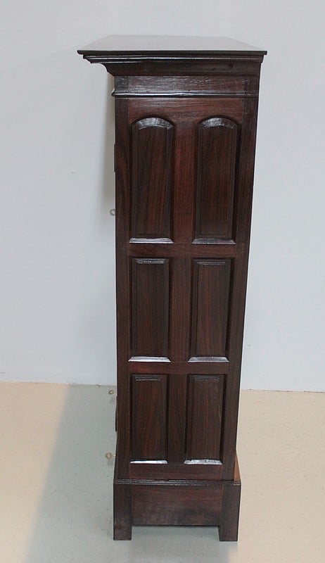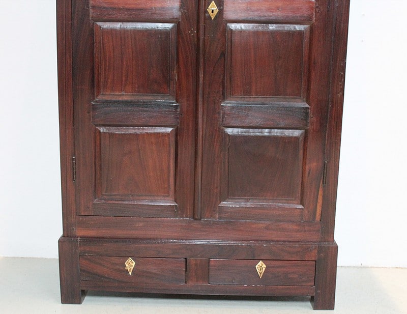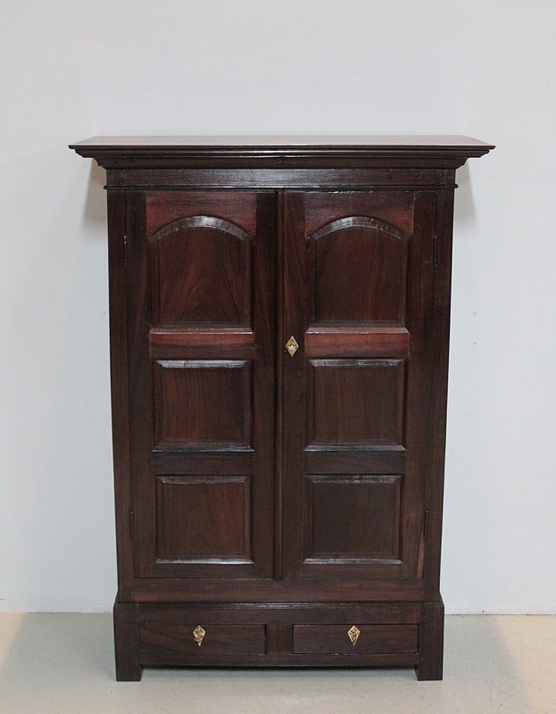 Petite armoire à épices en palissandre ouvrant par 2 portes à 3 panneaux – celui du haut à découpe arrondie – et 2 tiroirs fermant à clé en partie basse.