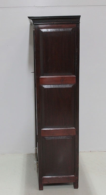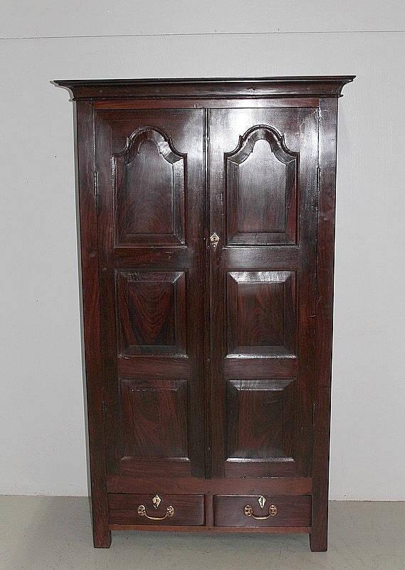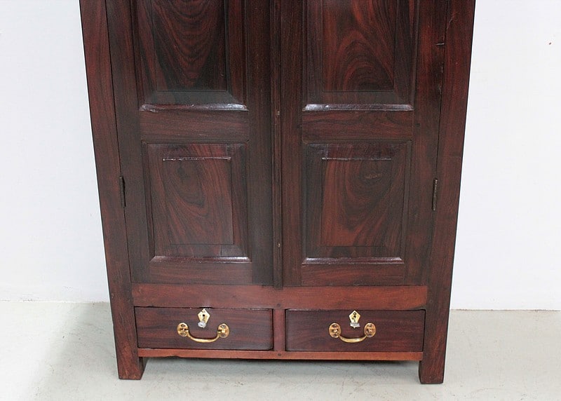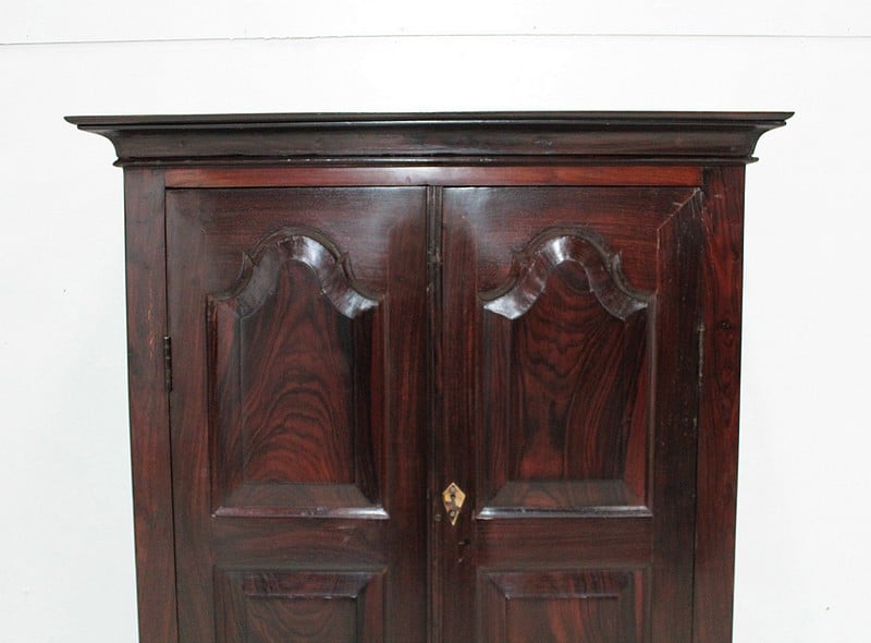 Armoire en Palissandre des Indes, dans le goût Louis XIV, ouvrant à 2 portes à 3 panneaux, celui du haut à découpe, et 2 tiroirs compartimentés fermant à clé, avec poignées en laiton, en partie basse.