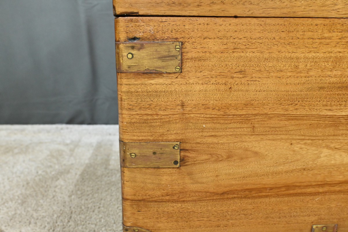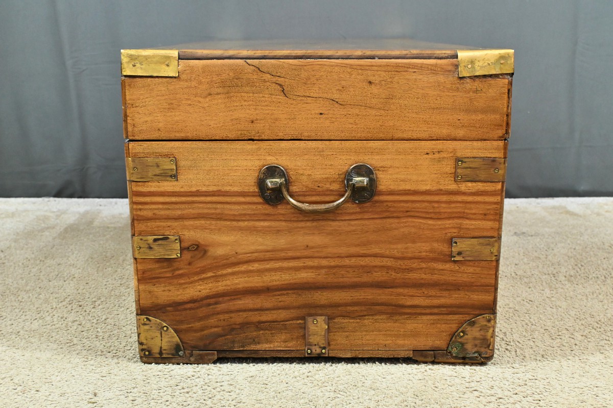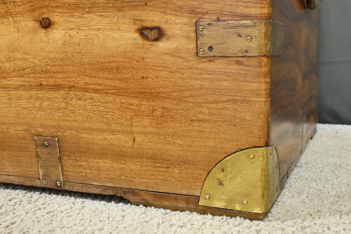 Dans le tumulte de la mer, cette malle était bien plus qu’un simple contenant : c’était un véritable compagnon de route, témoin silencieux des voyages maritimes du XIXe siècle, une malle de marine en camphrier fabriquée en Indes des périples des marins et des explorateurs.