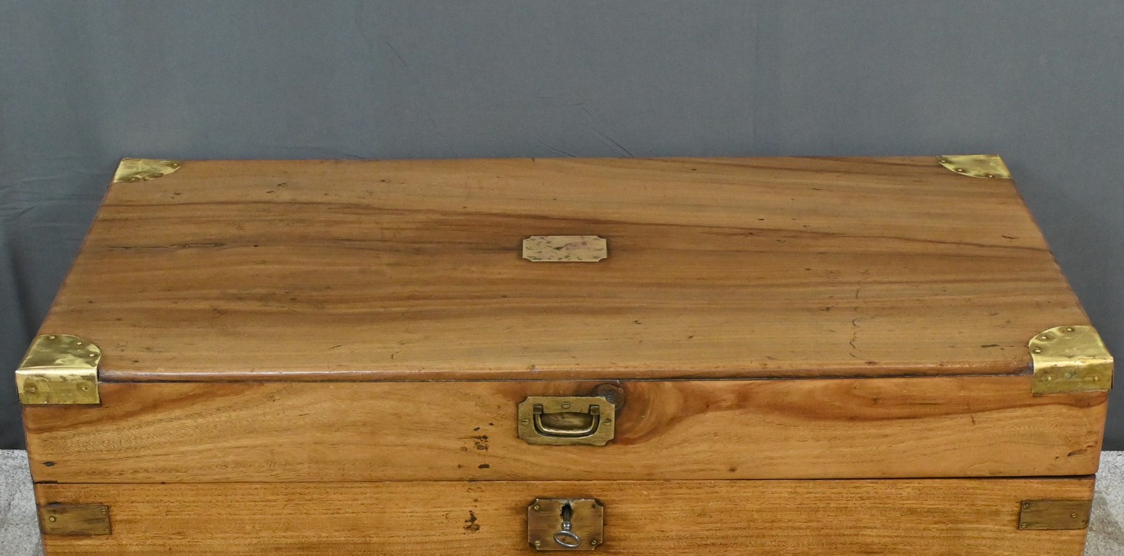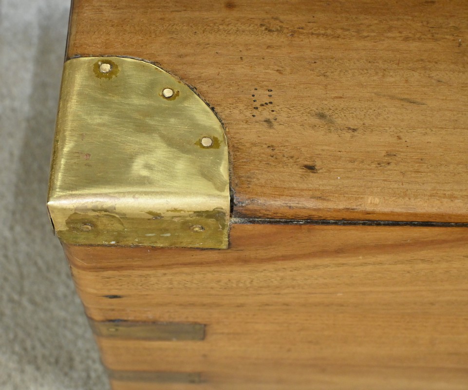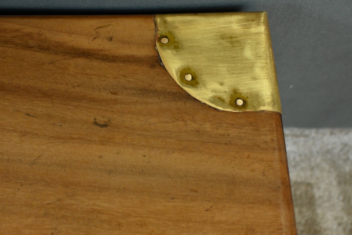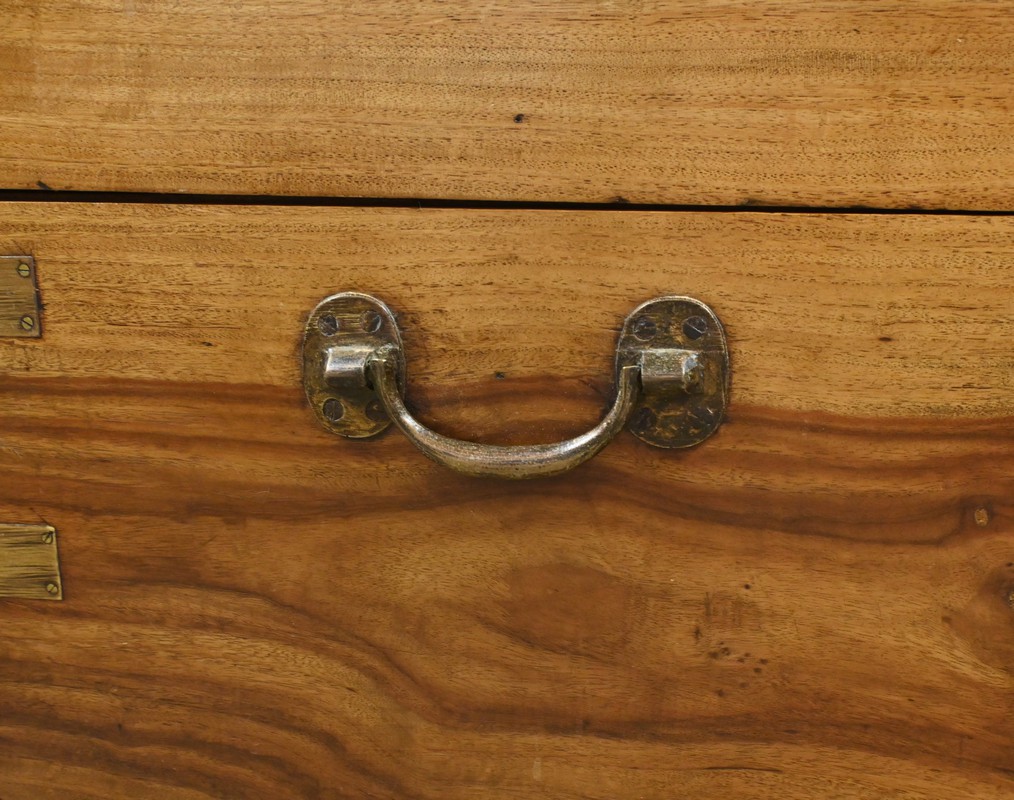 Chaque côté présente des poignées en bronze afin d’offrir une prise sûre et confortable, facilitant le transport de ce meuble de marine.