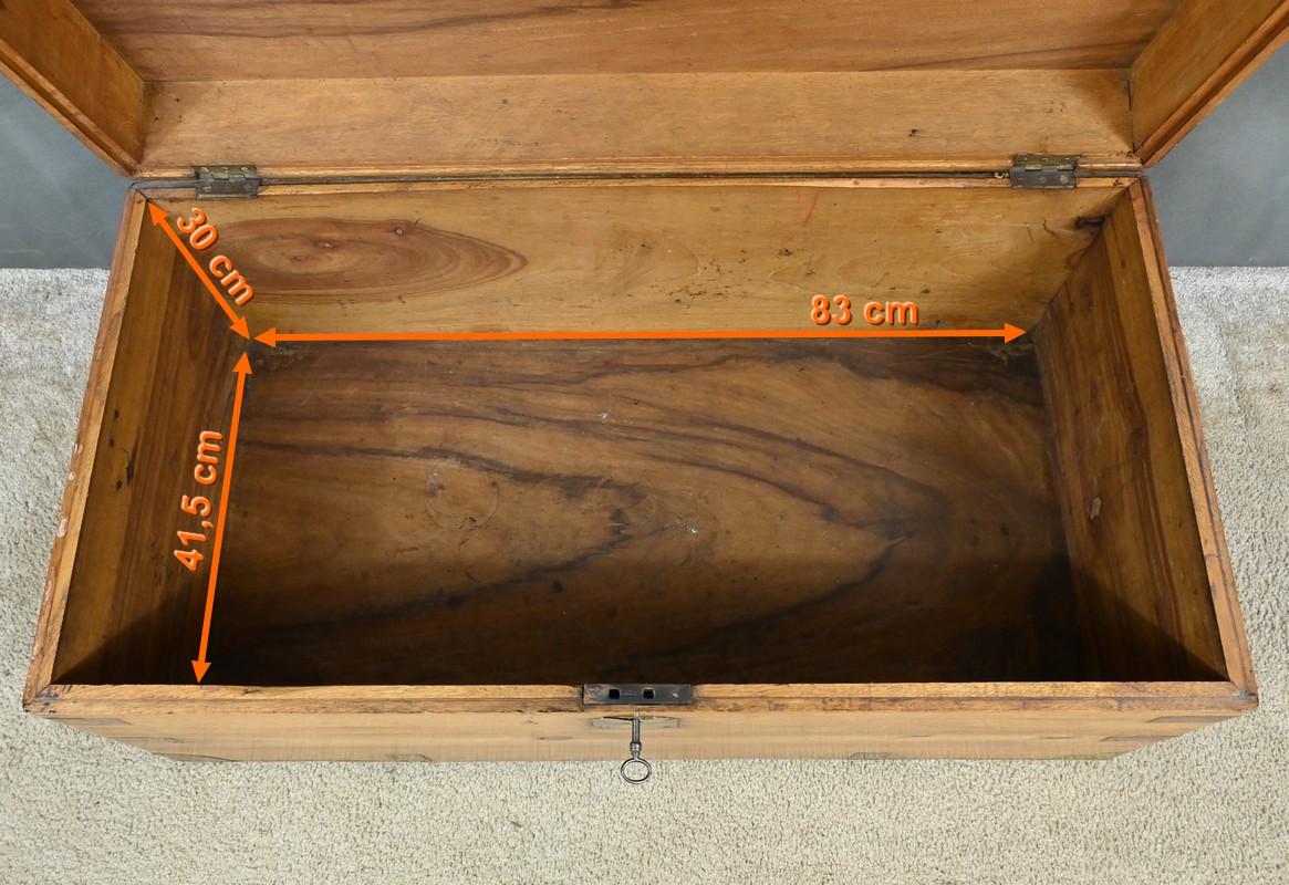 L’authenticité de cette pièce est confirmée par sa serrure d’époque, garantissant la sécurité de son contenu, et par sa poignée bateau incrustée, typique des accessoires marins.