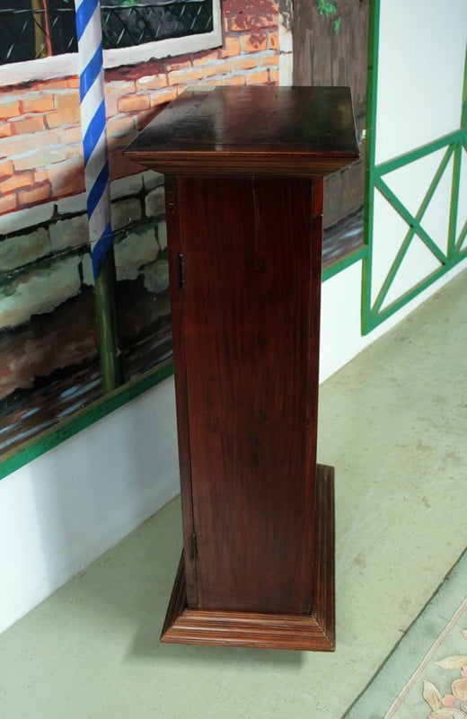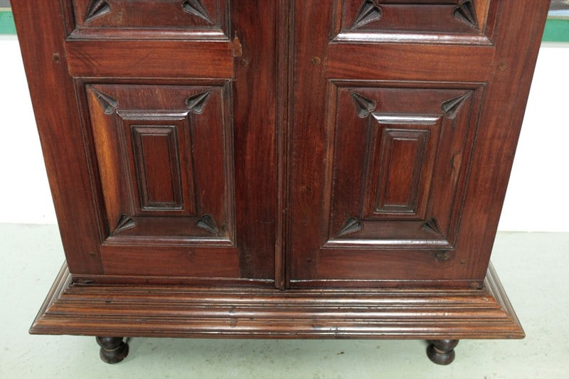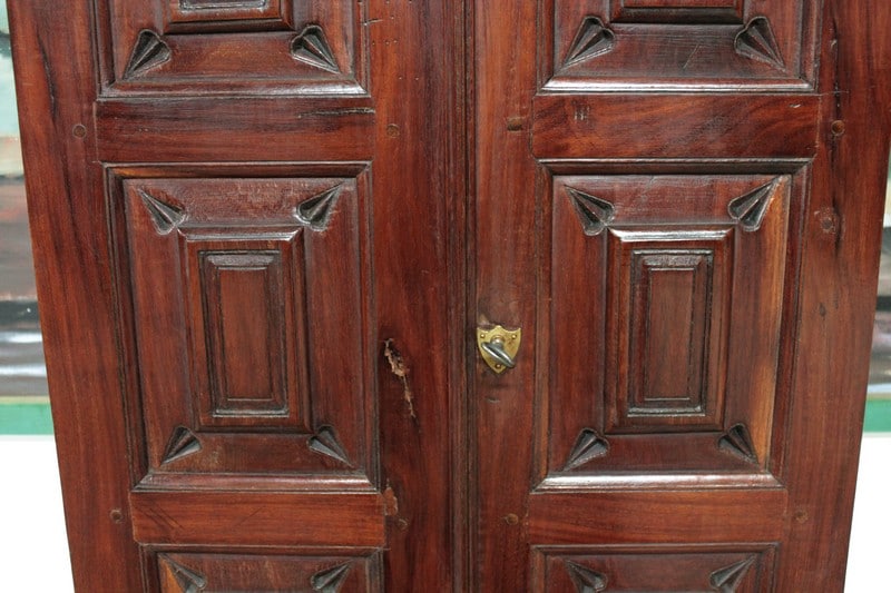 Petit meuble d’appui en acajou dans le goût Louis XIII ouvrant à 2 portes décorées de 3 panneaux. L’intérieur est garni de 2 étagères. Région de Pondichéry, ancien comptoir français de l’Inde. Époque : fin XIXe