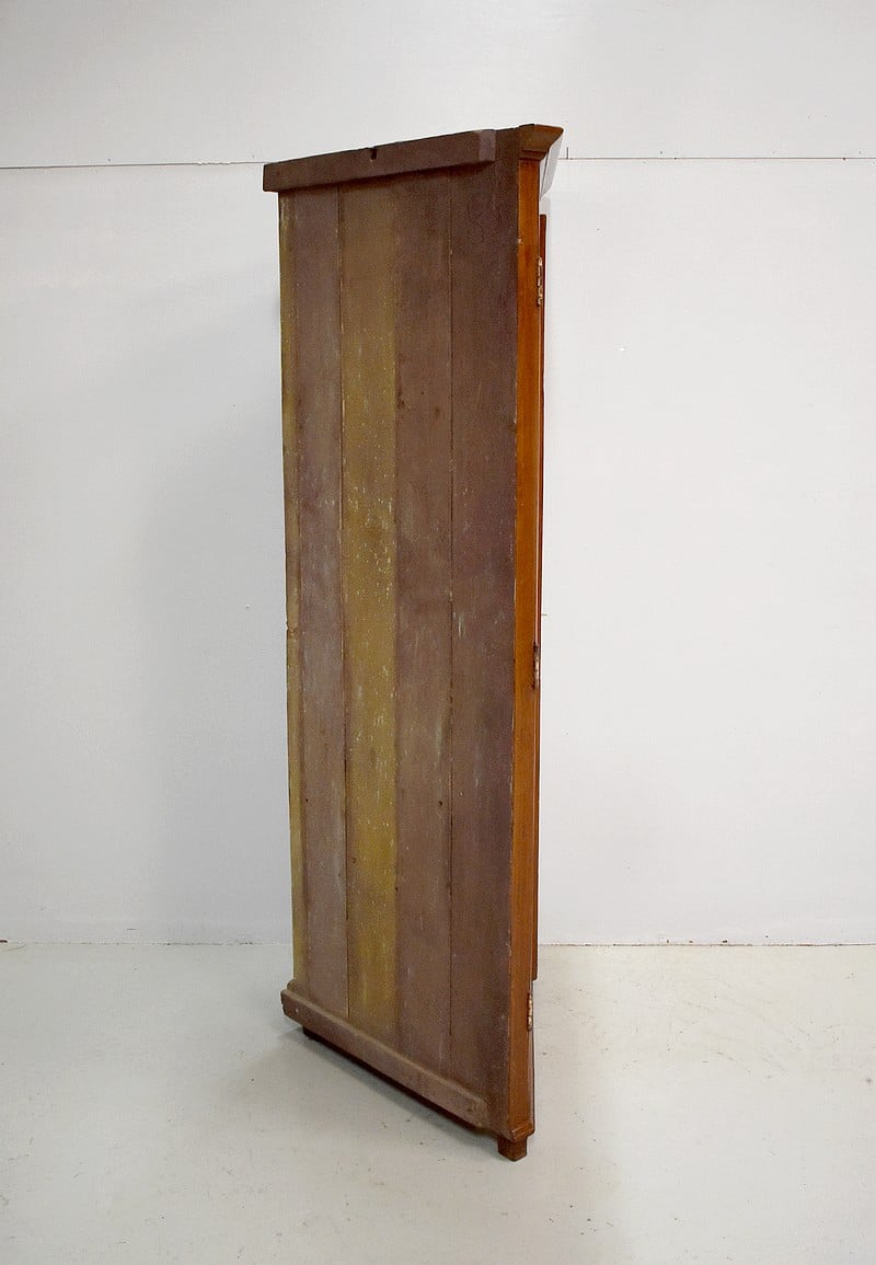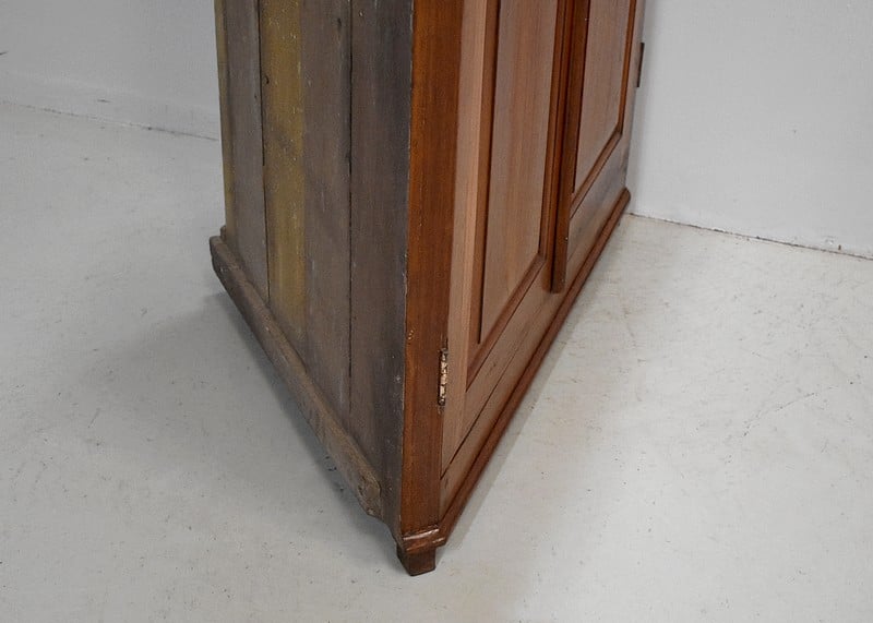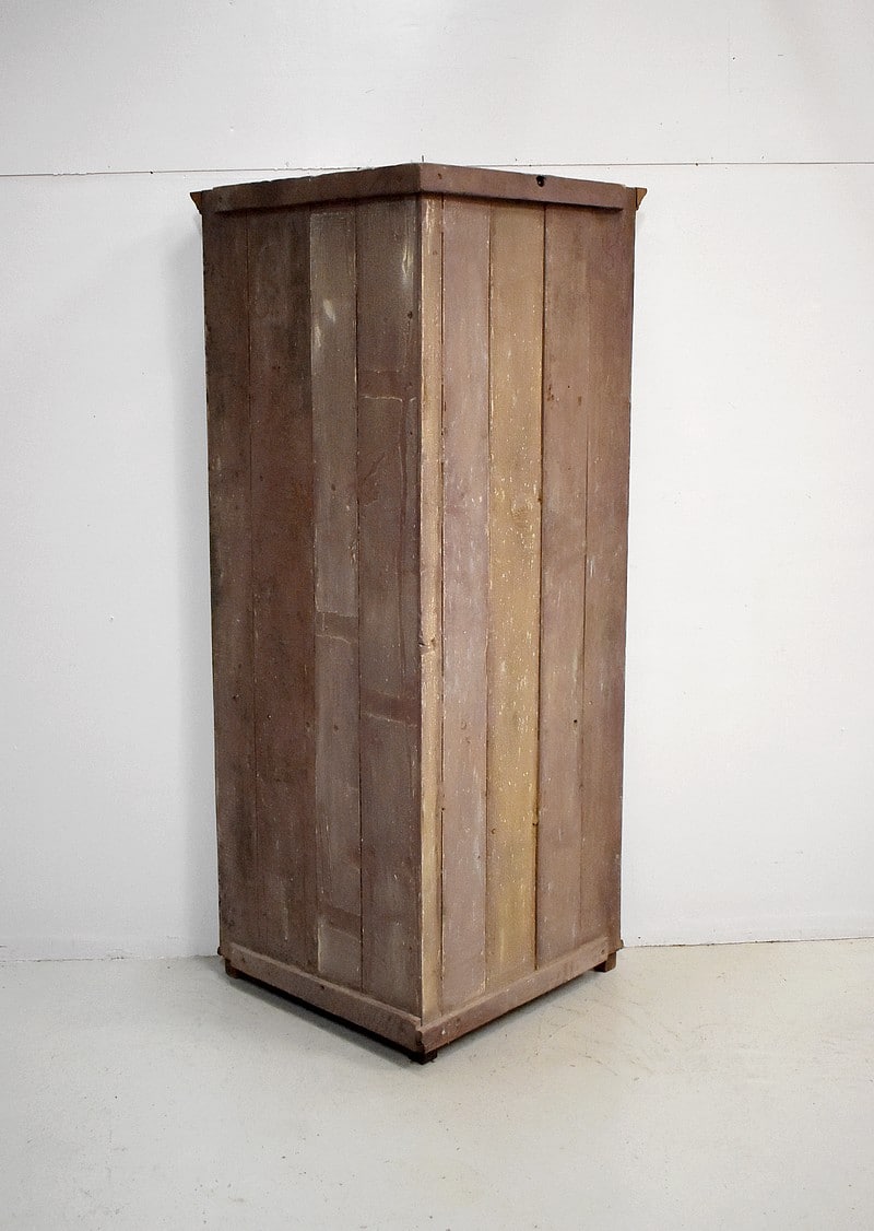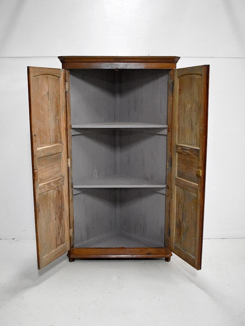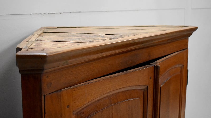 Il ouvre par deux portes panneautées fermant à clef donnant accès à deux étagères triangulaires posées sur tasseaux fixes. L’intérieur et les étagères sont peints en gris.