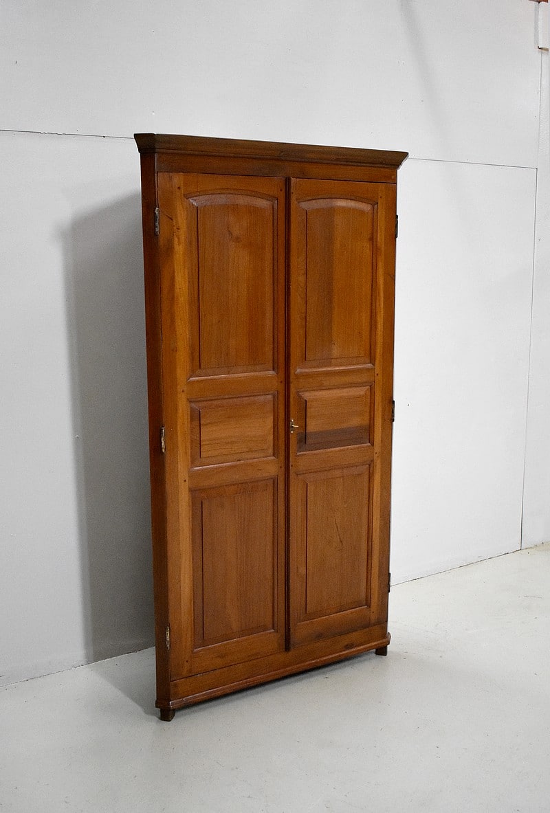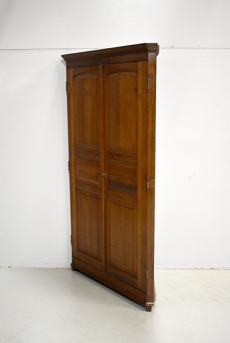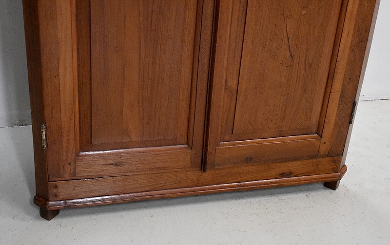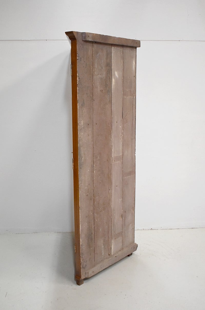 Il ouvre par deux portes panneautées fermant à clef donnant accès à deux étagères triangulaires posées sur tasseaux fixes. L’intérieur et les étagères sont peints en gris.