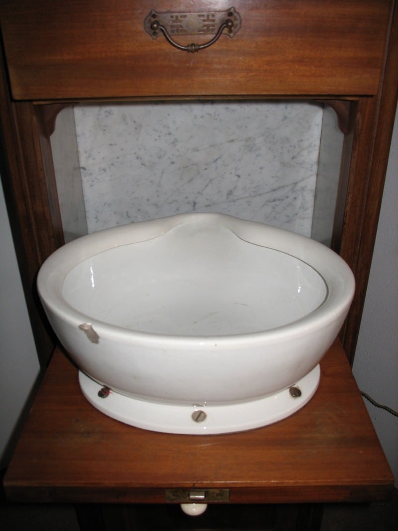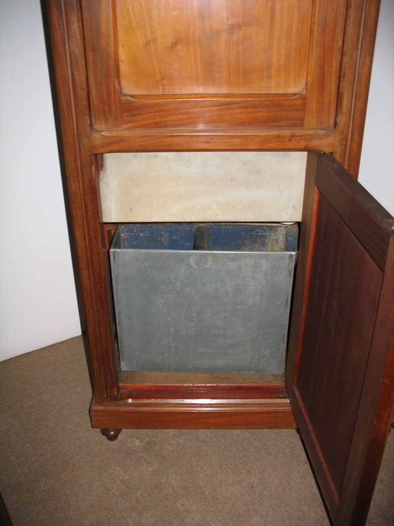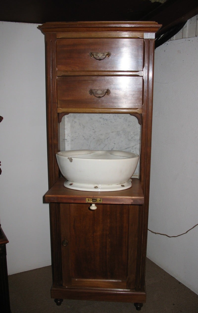 Meuble-lavabo de cabine de bateau en Acajou blond. 2 tiroirs en partie haute, 1 cuvette en faïence fixée sur porte basculante, 1 bac de récupération des eaux usées en partie basse. Début XXe.
