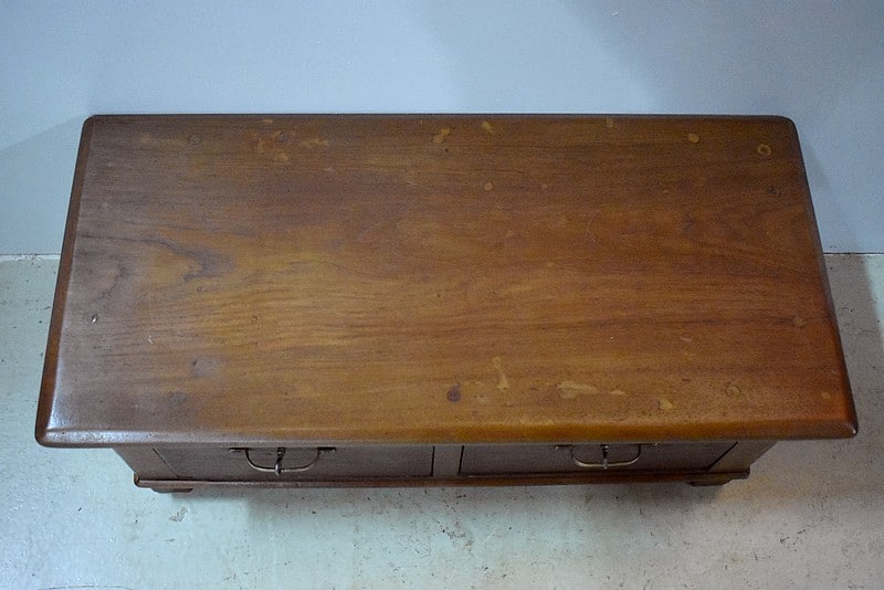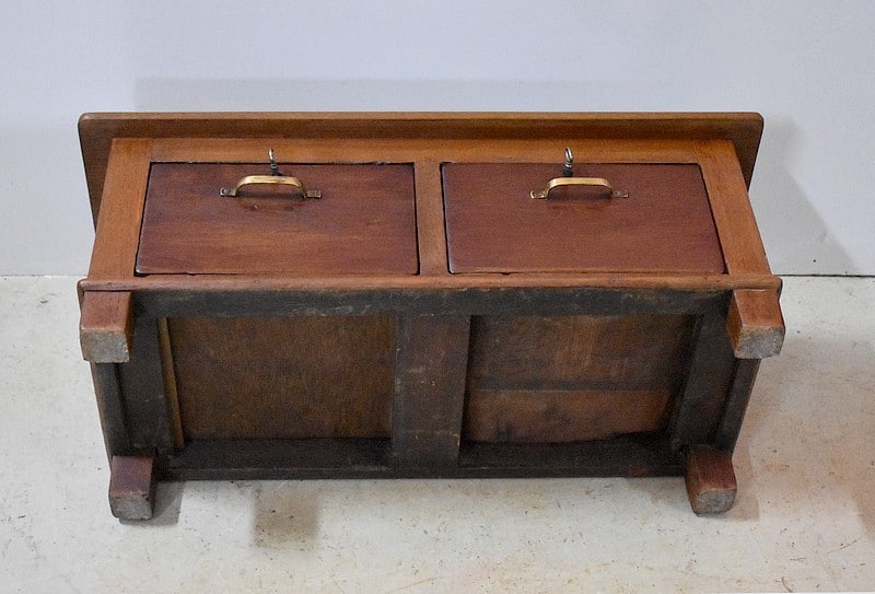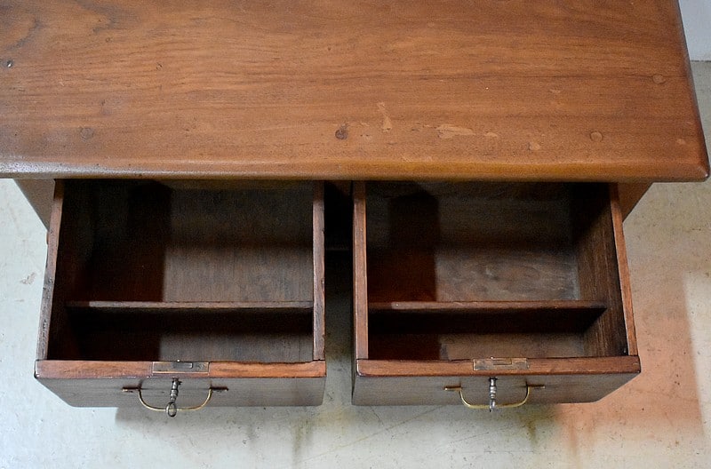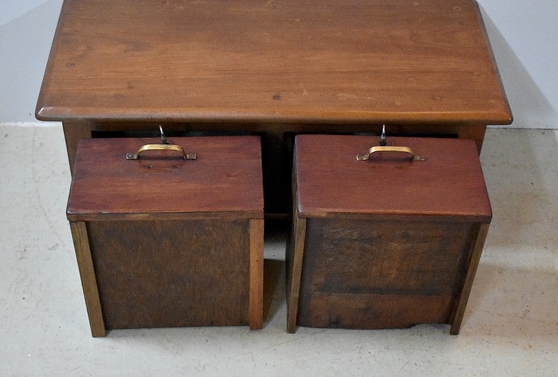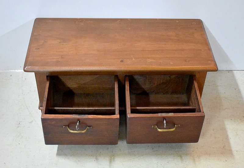 Il ouvre par deux tiroirs en façade dotés d’une serrure avec clef et d’une poignée de laiton.