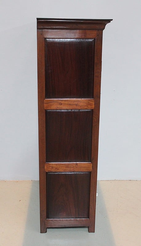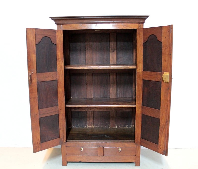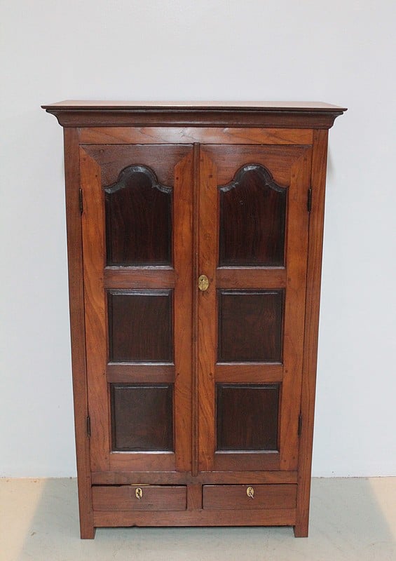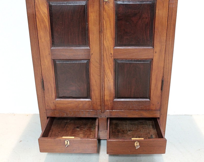 Petite armoire à épices en teck et palissandre, dessus en acajou, ouvrant par 2 portes et 2 tiroirs fermant à clé en partie basse.