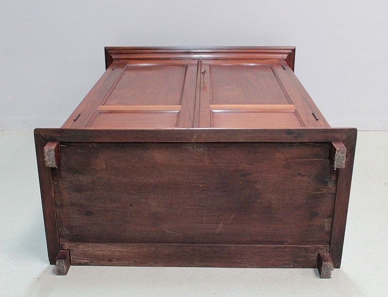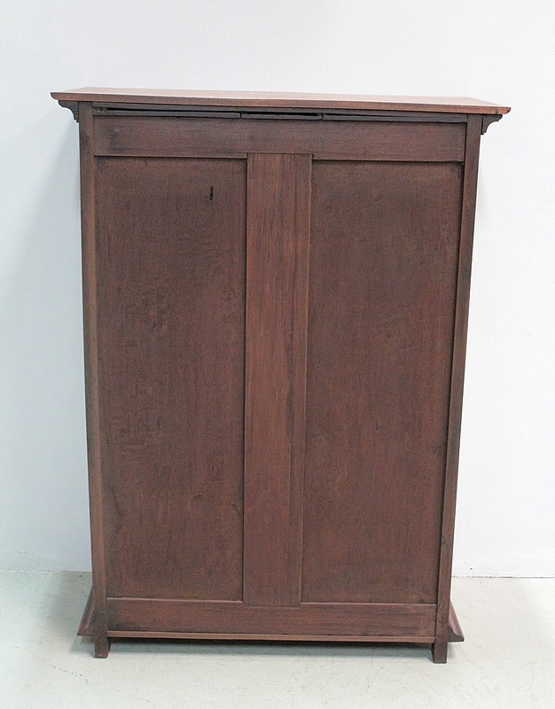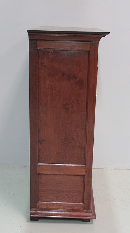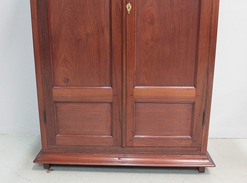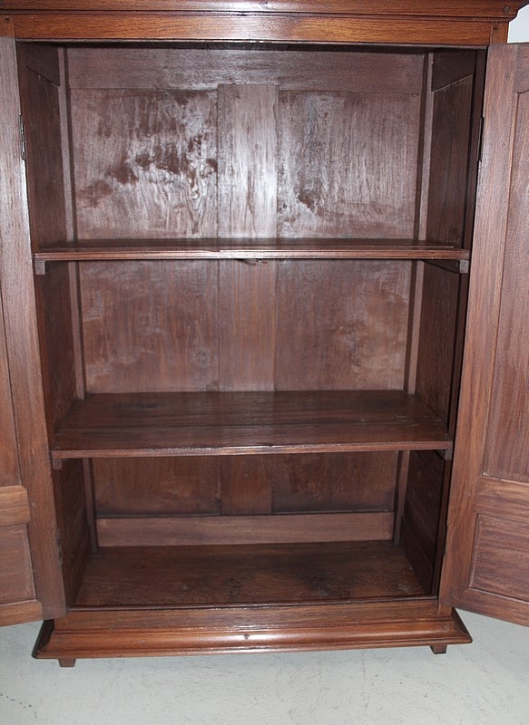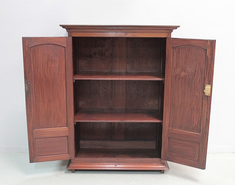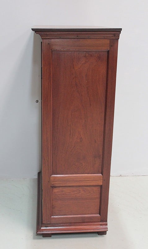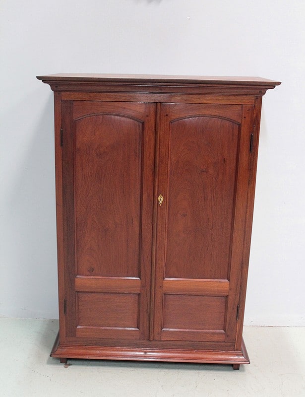 Petite armoire en teck ouvrant par 2 portes à 2 panneaux, celui du haut cintré, et fermant à clé. Les côtés sont également à 2 panneaux. Dessus en teck, entouré d’une corniche moulurée.