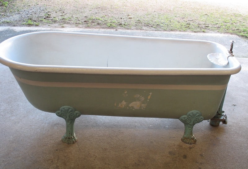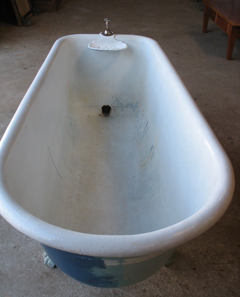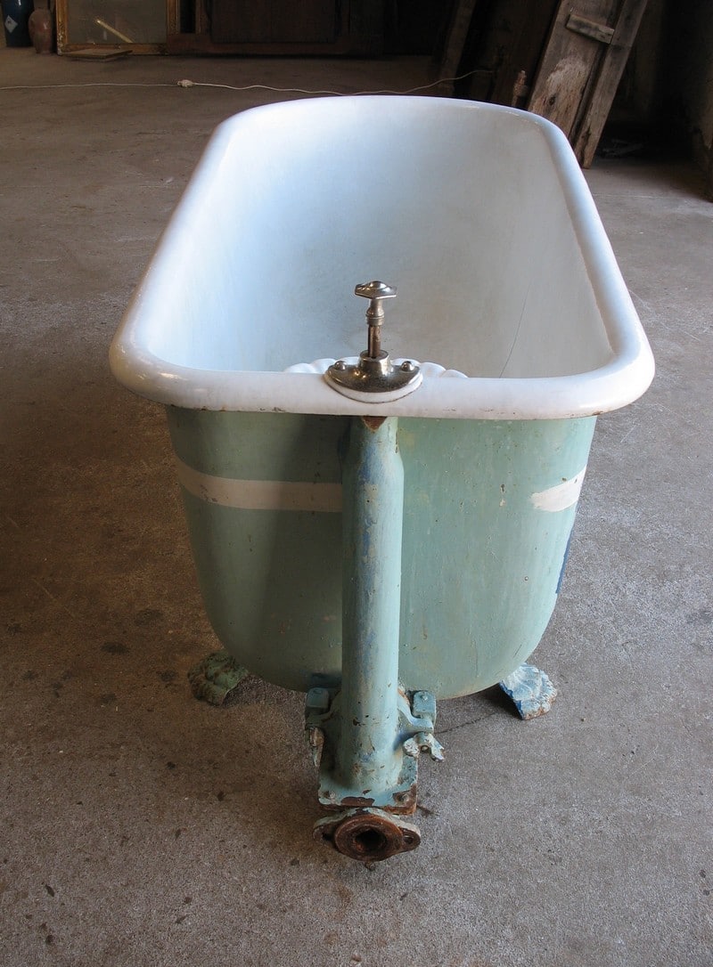 Baignoire en fonte émaillée reposant sur 4 pieds en griffes. Fabrication du début XXe