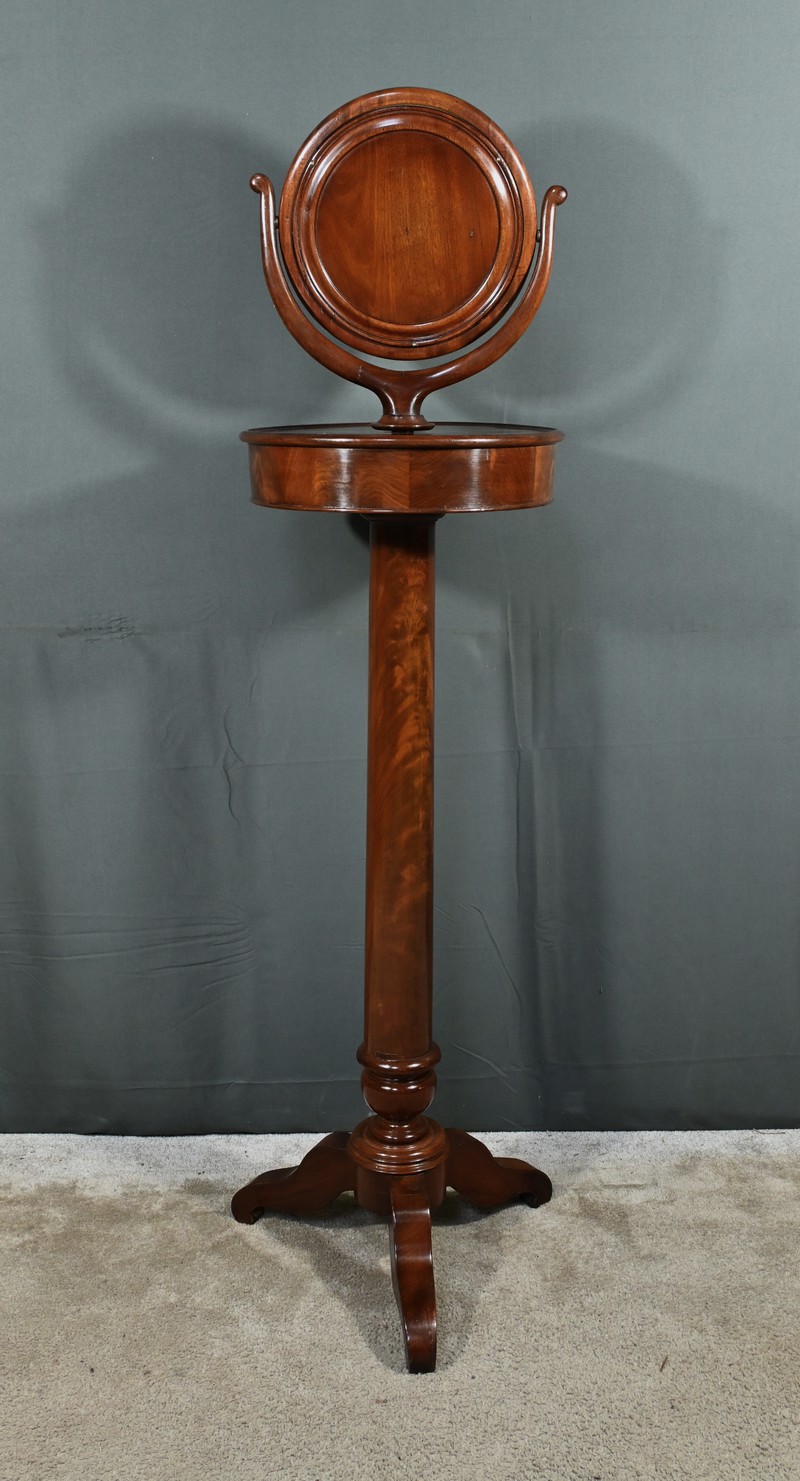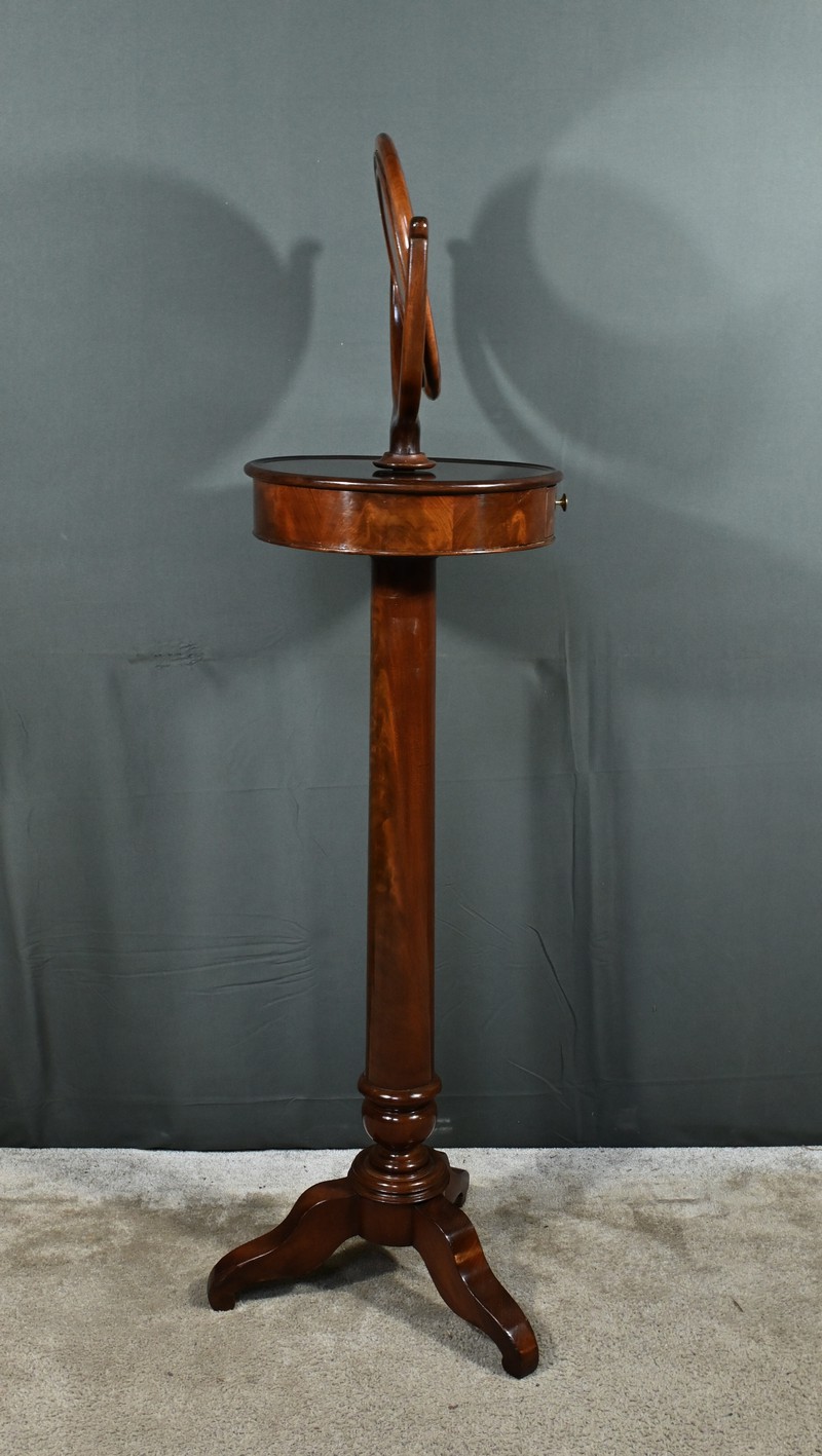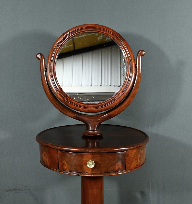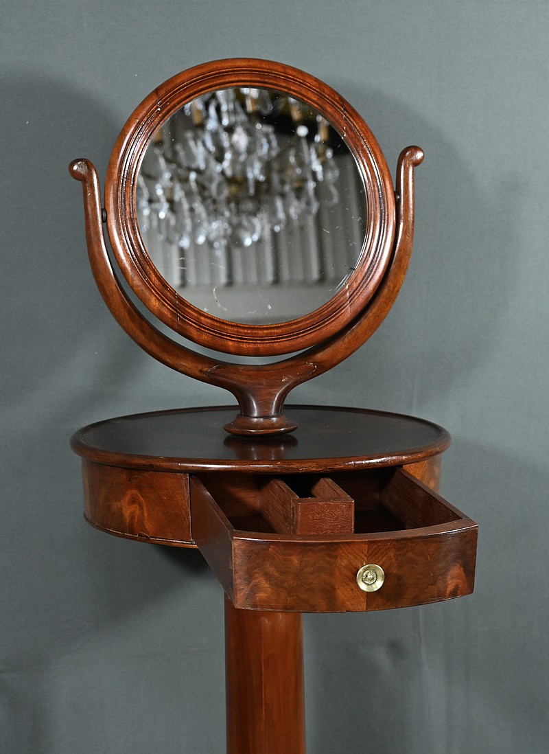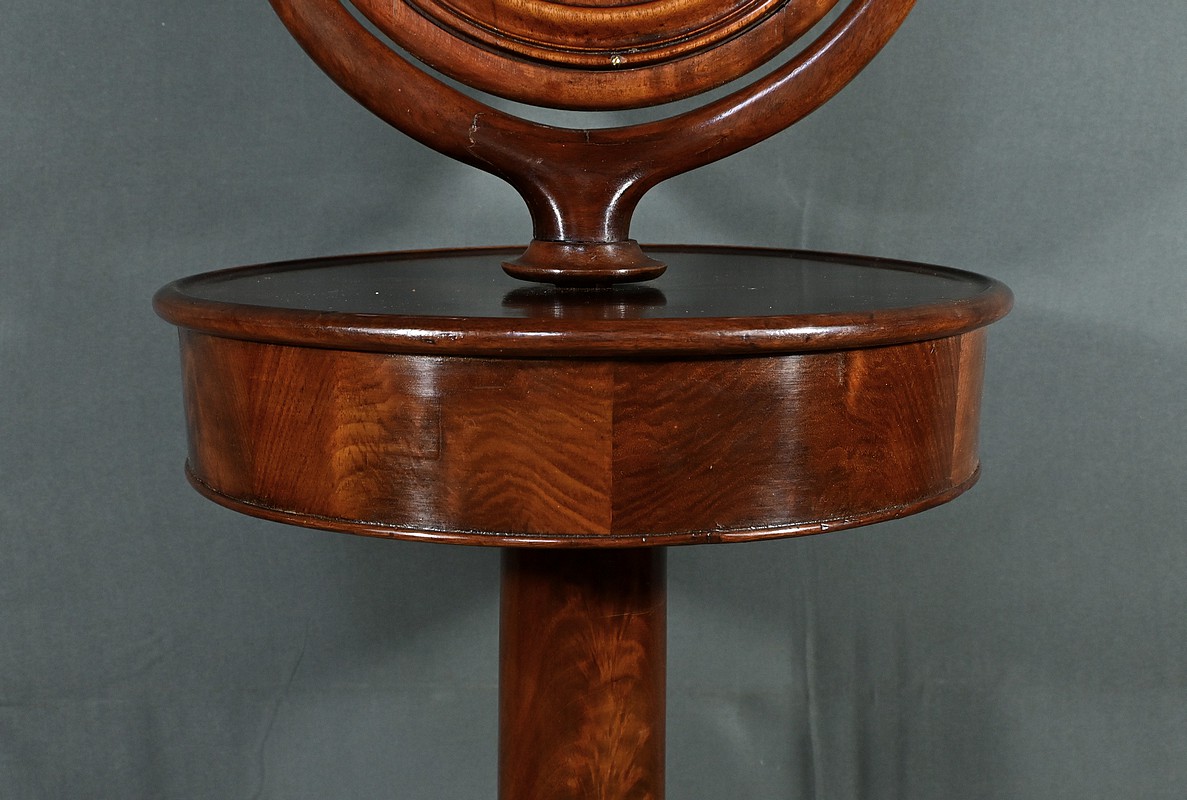 Cette barbière en acajou massif, datant de l’époque Restauration au début du XIXe siècle, est une pièce de mobilier élégante et raffinée. Elle se compose d’un miroir rond inclinable, encadré par une structure en bois courbé reposant sur une base circulaire avec plateau cuvette et tiroir avec poignée en laiton ciselé. Le fût cylindrique repose sur une base tripode sculptée de pieds mouvementés, assurant la stabilité du meuble. Ce meuble est typique de l’époque Restauration, caractérisée par un retour à des formes classiques et une utilisation de matériaux nobles comme l’acajou.