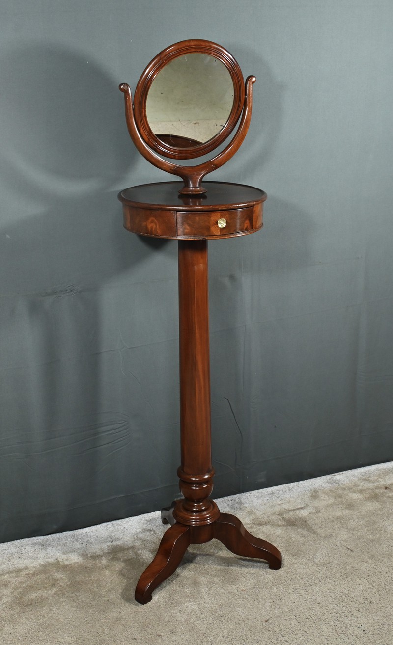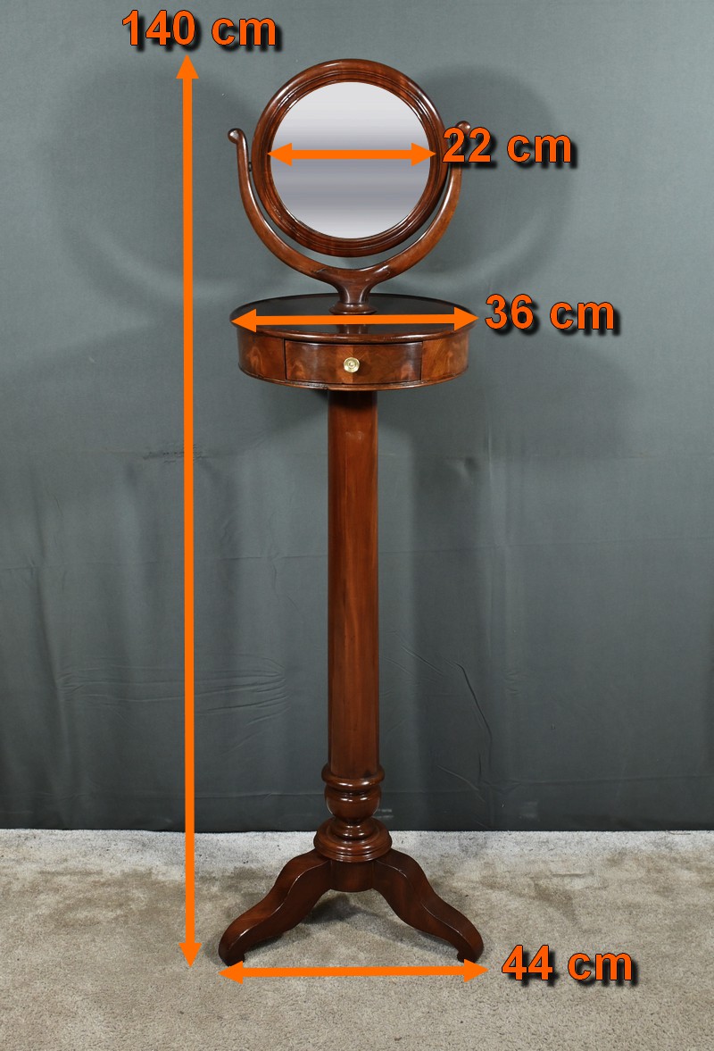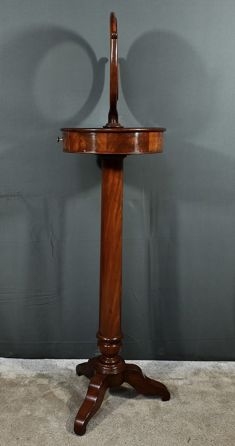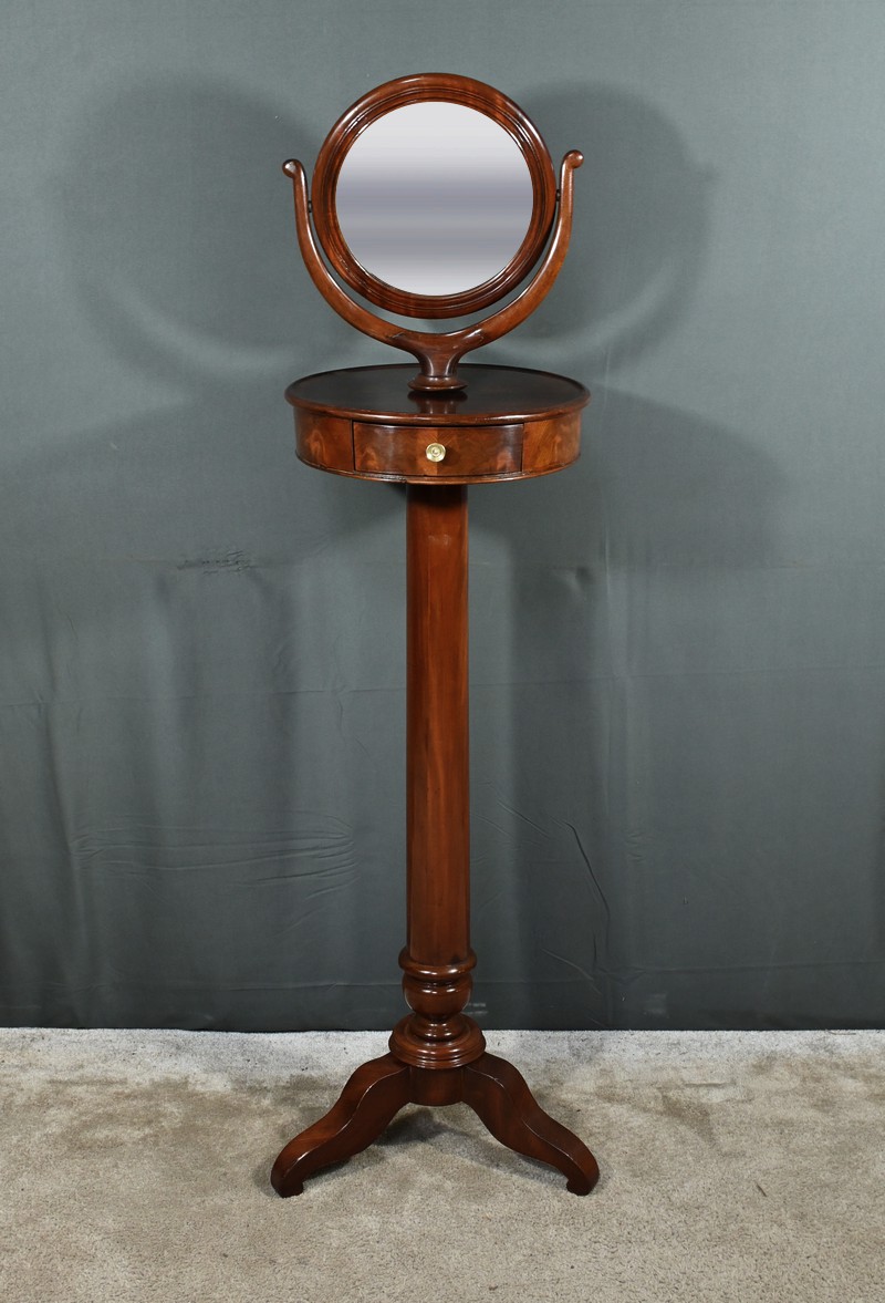 Cette barbière en acajou massif, datant de l’époque Restauration au début du XIXe siècle, est une pièce de mobilier élégante et raffinée. Elle se compose d’un miroir rond inclinable, encadré par une structure en bois courbé reposant sur une base circulaire avec plateau cuvette et tiroir avec poignée en laiton ciselé. Le fût cylindrique repose sur une base tripode sculptée de pieds mouvementés, assurant la stabilité du meuble. Ce meuble est typique de l’époque Restauration, caractérisée par un retour à des formes classiques et une utilisation de matériaux nobles comme l’acajou.