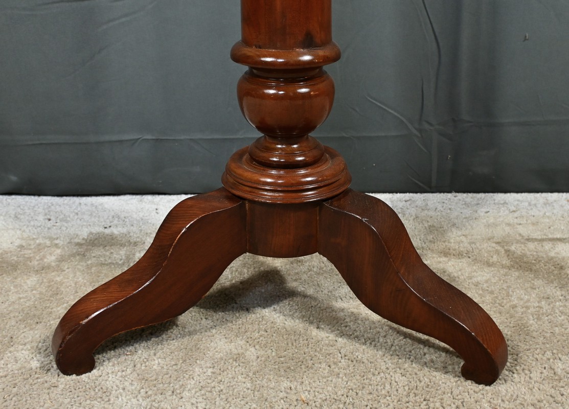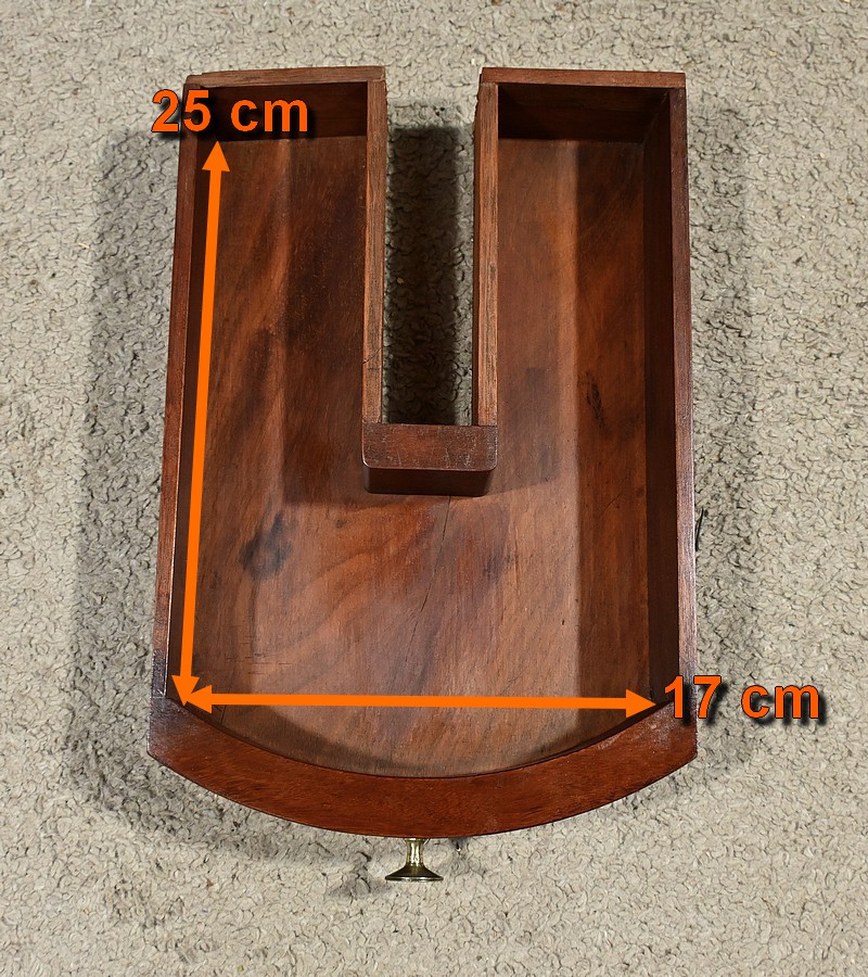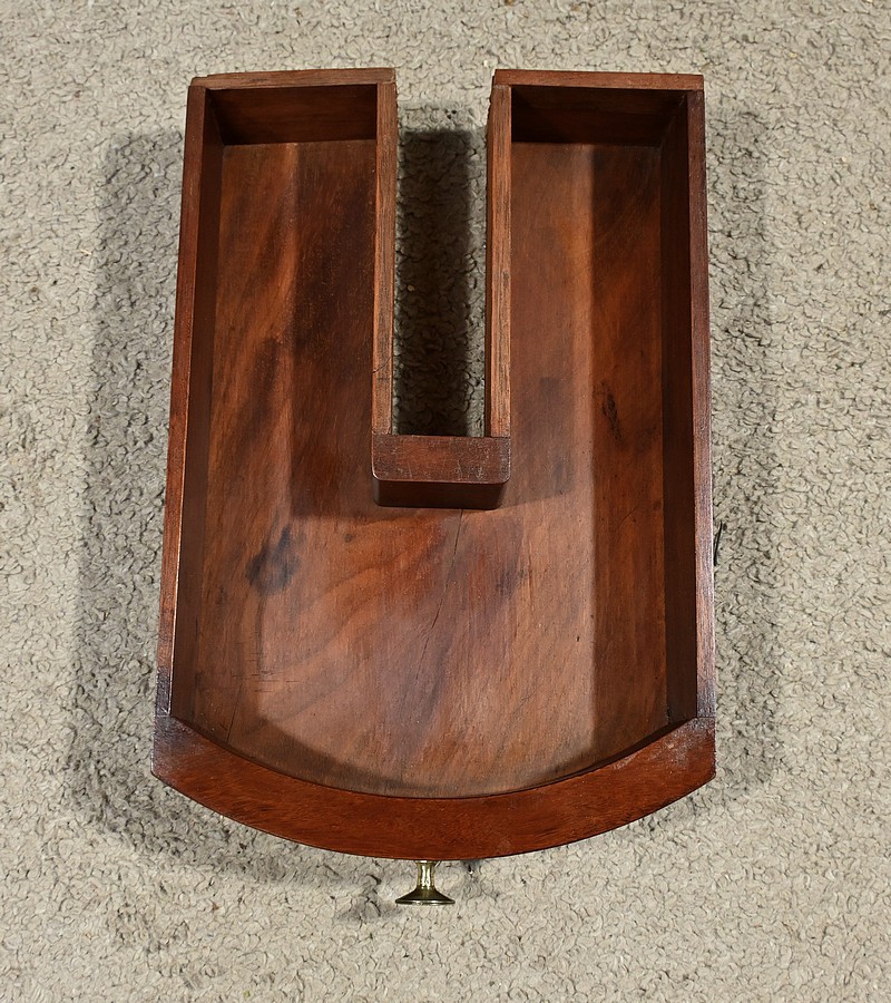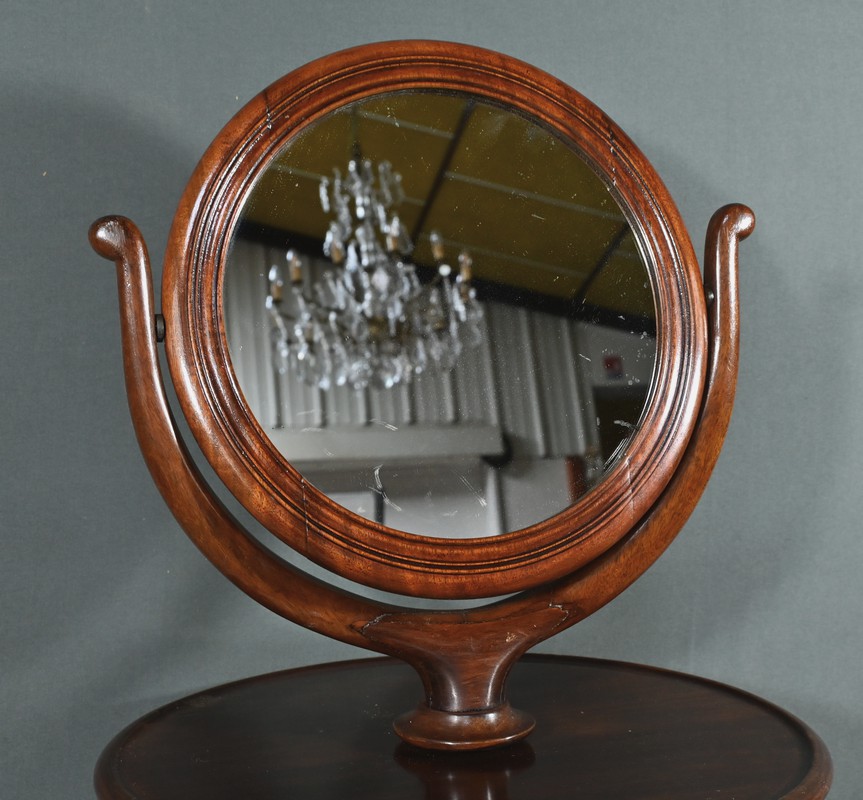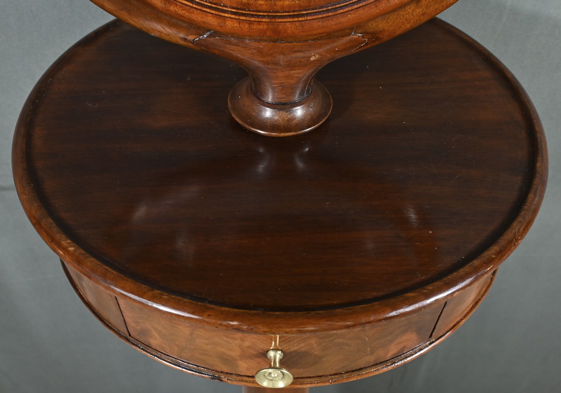 Cette barbière en acajou massif, datant de l’époque Restauration au début du XIXe siècle, est une pièce de mobilier élégante et raffinée. Elle se compose d’un miroir rond inclinable, encadré par une structure en bois courbé reposant sur une base circulaire avec plateau cuvette et tiroir avec poignée en laiton ciselé. Le fût cylindrique repose sur une base tripode sculptée de pieds mouvementés, assurant la stabilité du meuble. Ce meuble est typique de l’époque Restauration, caractérisée par un retour à des formes classiques et une utilisation de matériaux nobles comme l’acajou.