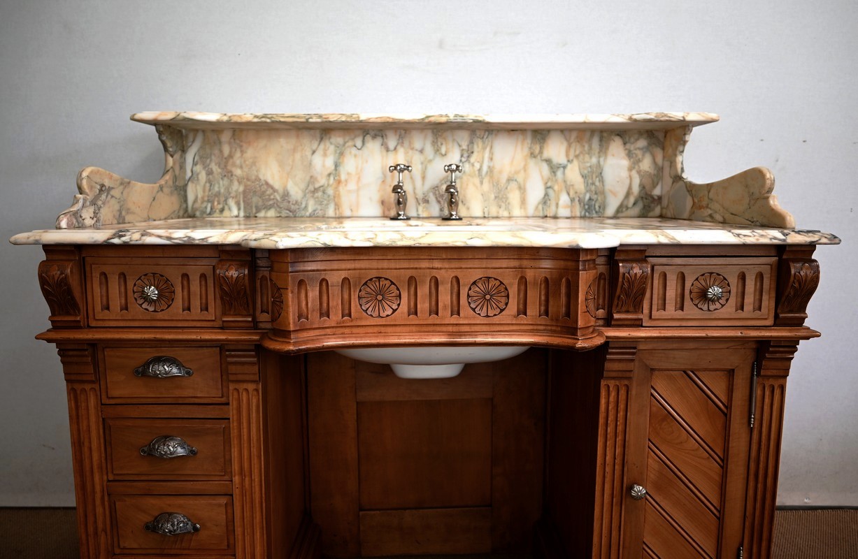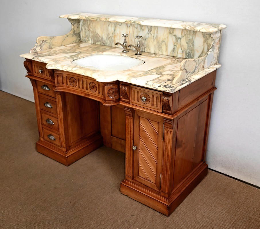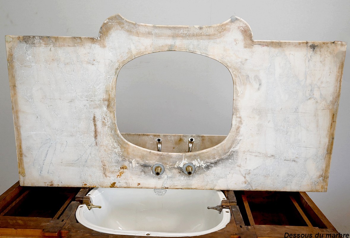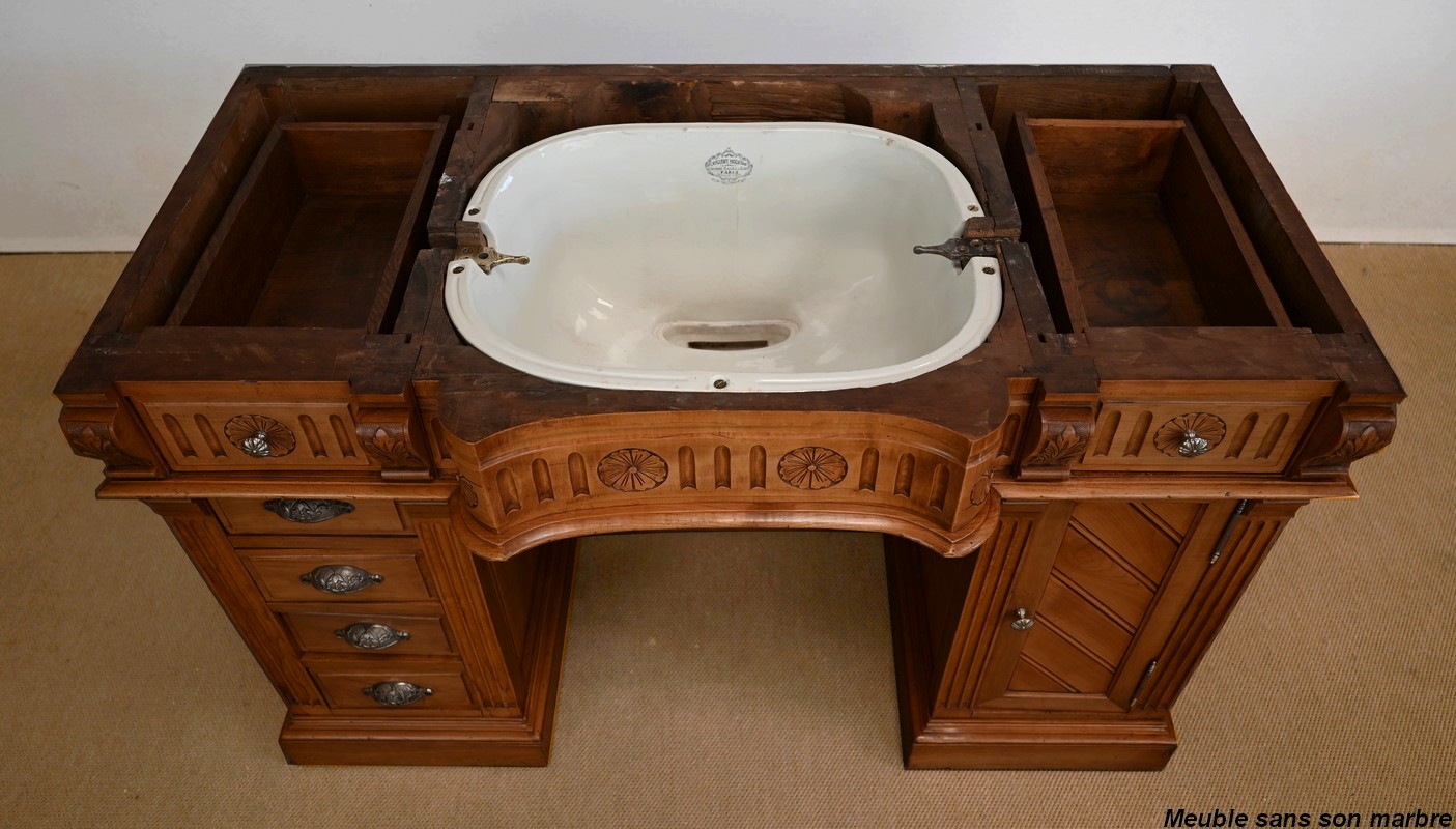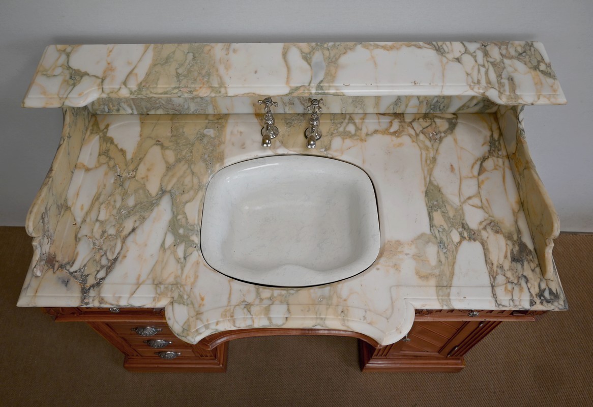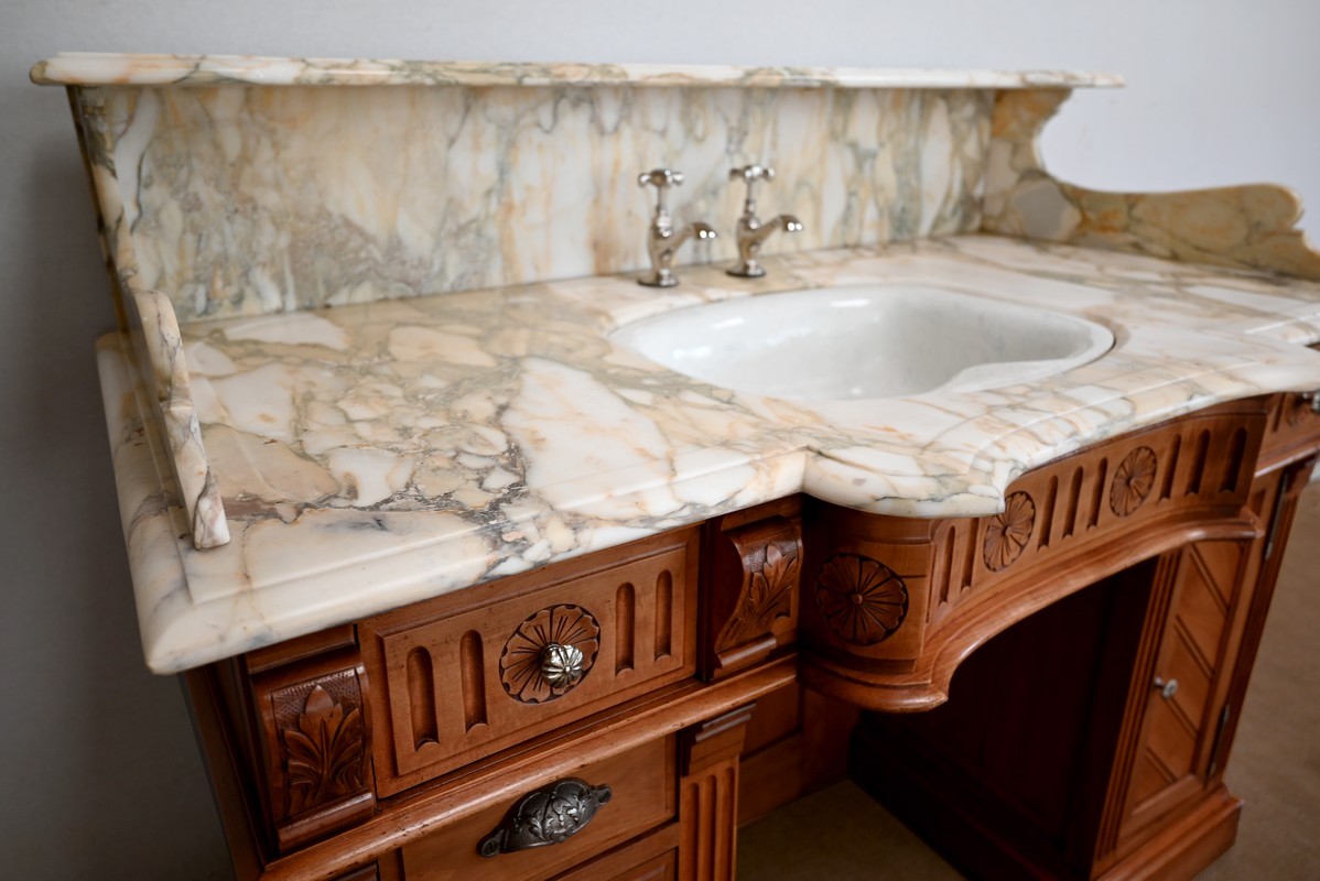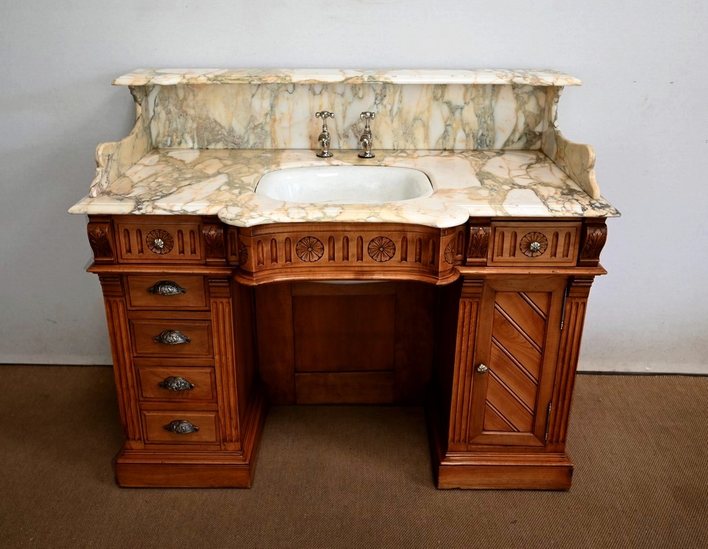 Ce meuble, en merisier massif avec intérieur en chêne, est sommé d’un marbre Breche du Benou jaune, originaire de la commune de Bieille dans les Pyrénées-Atlantiques. Ce dessus à réserve est mouluré à l’arête d’un bec-de-corbin. Celui-ci est équipé d’une vasque pivotante en porcelaine, avec système d’évacuation des eaux, ainsi que de deux robinets en inox « Maurice Herbeau », pouvant être indépendamment raccordés à l’eau chaude et froide. Ils sont chapeautés par une tablette en marbre, supportée aux extrémités par deux éléments en console. La ceinture, en avancée et à décrochement en partie centrale, propose deux tiroirs latéraux. Cet ensemble repose sur deux caissons sur plinthes. Celui de gauche ouvre par quatre tiroirs identiques, à poignées coquille en métal argenté. Celui de droite se compose d’une porte sur pommelles, munie d’un bouton de tirage et façonnée de lamelles rainurées en diagonales. L’intérieur propose une étagère réglable puisque sur crémaillères.