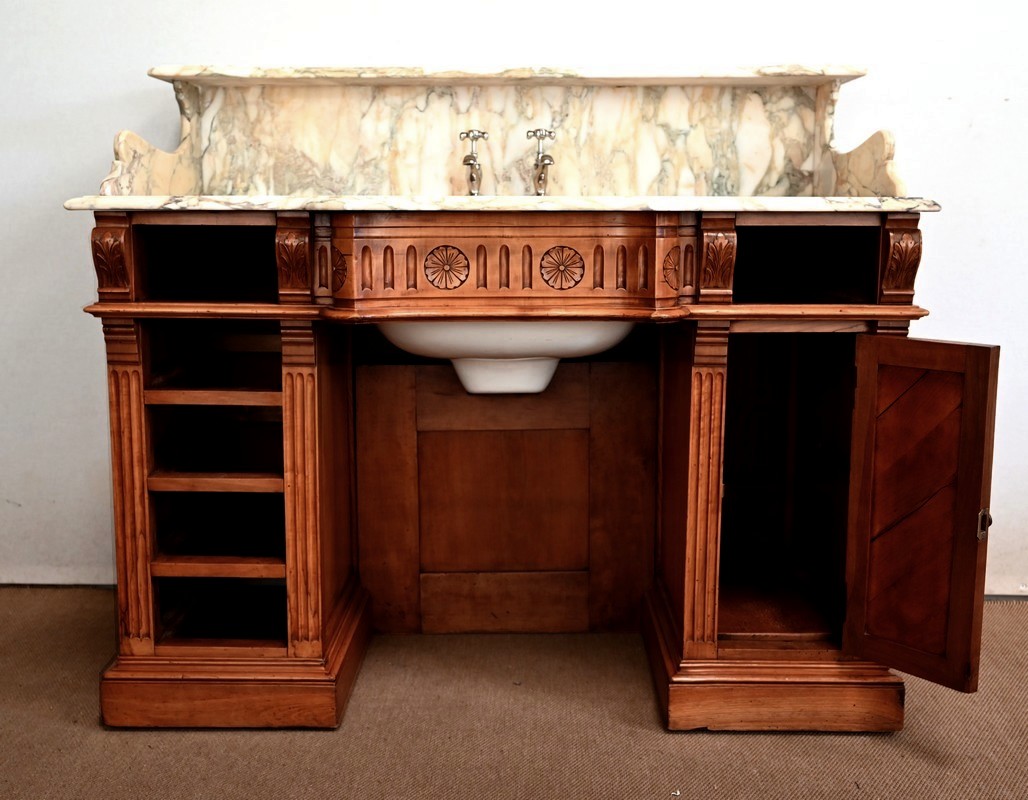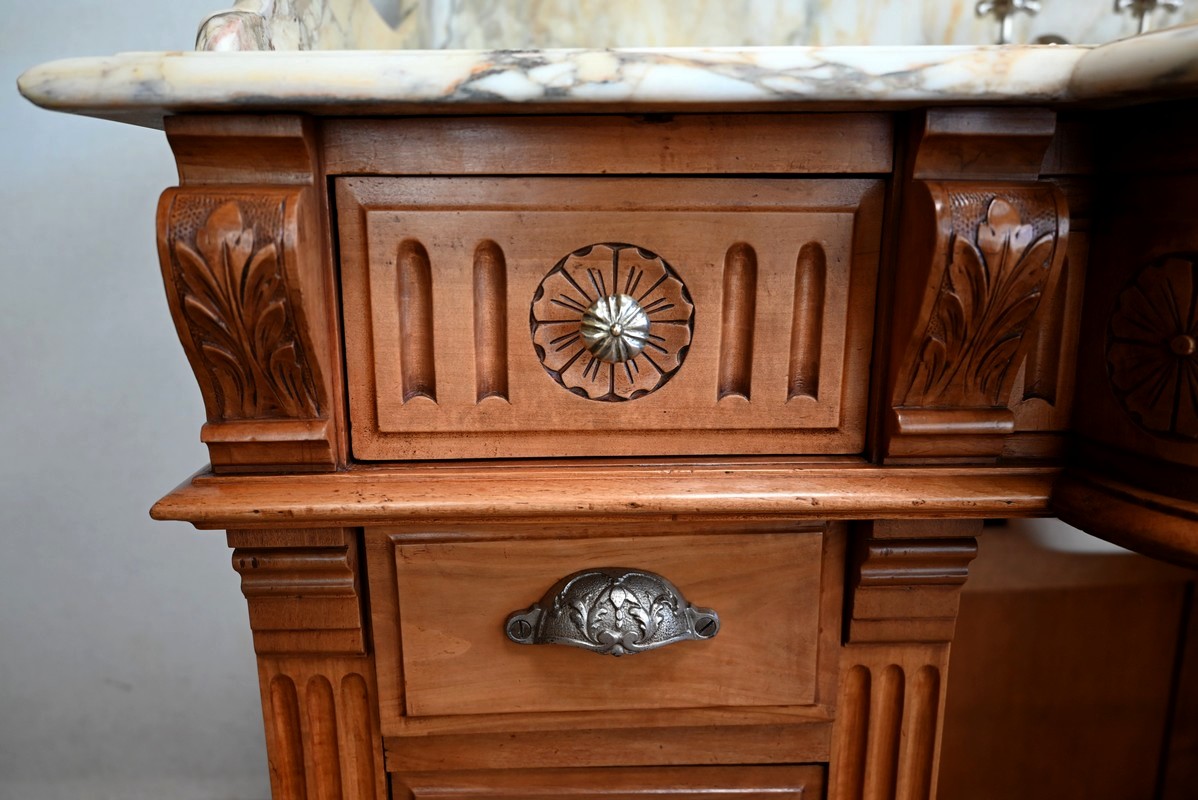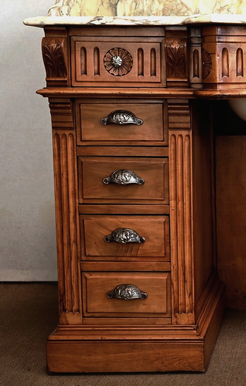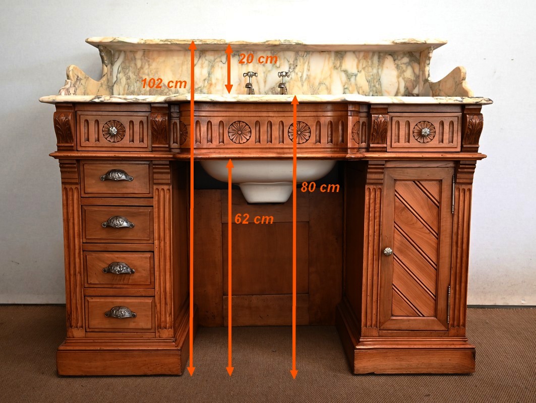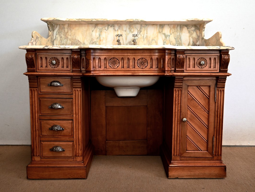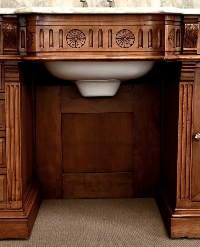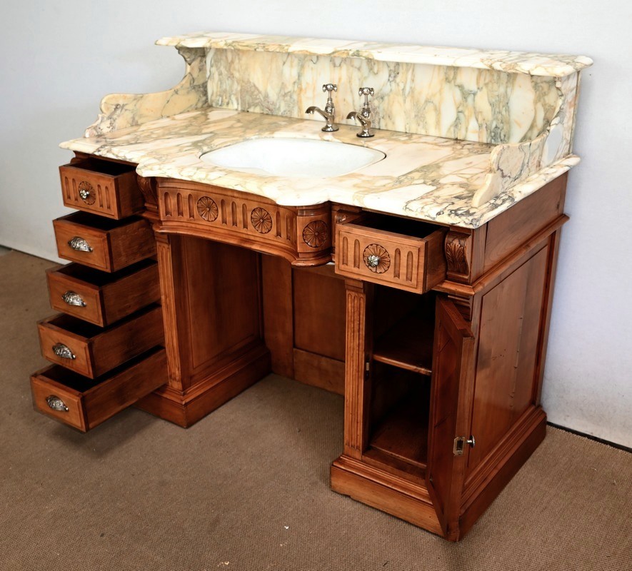 Ce meuble, en merisier massif avec intérieur en chêne, est sommé d’un marbre Breche du Benou jaune, originaire de la commune de Bieille dans les Pyrénées-Atlantiques. Ce dessus à réserve est mouluré à l’arête d’un bec-de-corbin. Celui-ci est équipé d’une vasque pivotante en porcelaine, avec système d’évacuation des eaux, ainsi que de deux robinets en inox « Maurice Herbeau », pouvant être indépendamment raccordés à l’eau chaude et froide. Ils sont chapeautés par une tablette en marbre, supportée aux extrémités par deux éléments en console. La ceinture, en avancée et à décrochement en partie centrale, propose deux tiroirs latéraux. Cet ensemble repose sur deux caissons sur plinthes. Celui de gauche ouvre par quatre tiroirs identiques, à poignées coquille en métal argenté. Celui de droite se compose d’une porte sur pommelles, munie d’un bouton de tirage et façonnée de lamelles rainurées en diagonales. L’intérieur propose une étagère réglable puisque sur crémaillères.