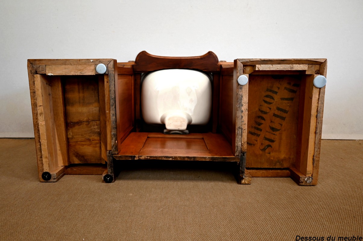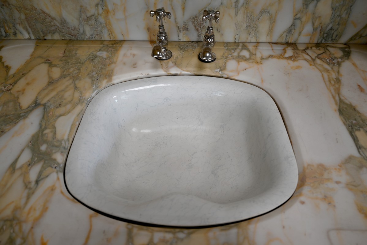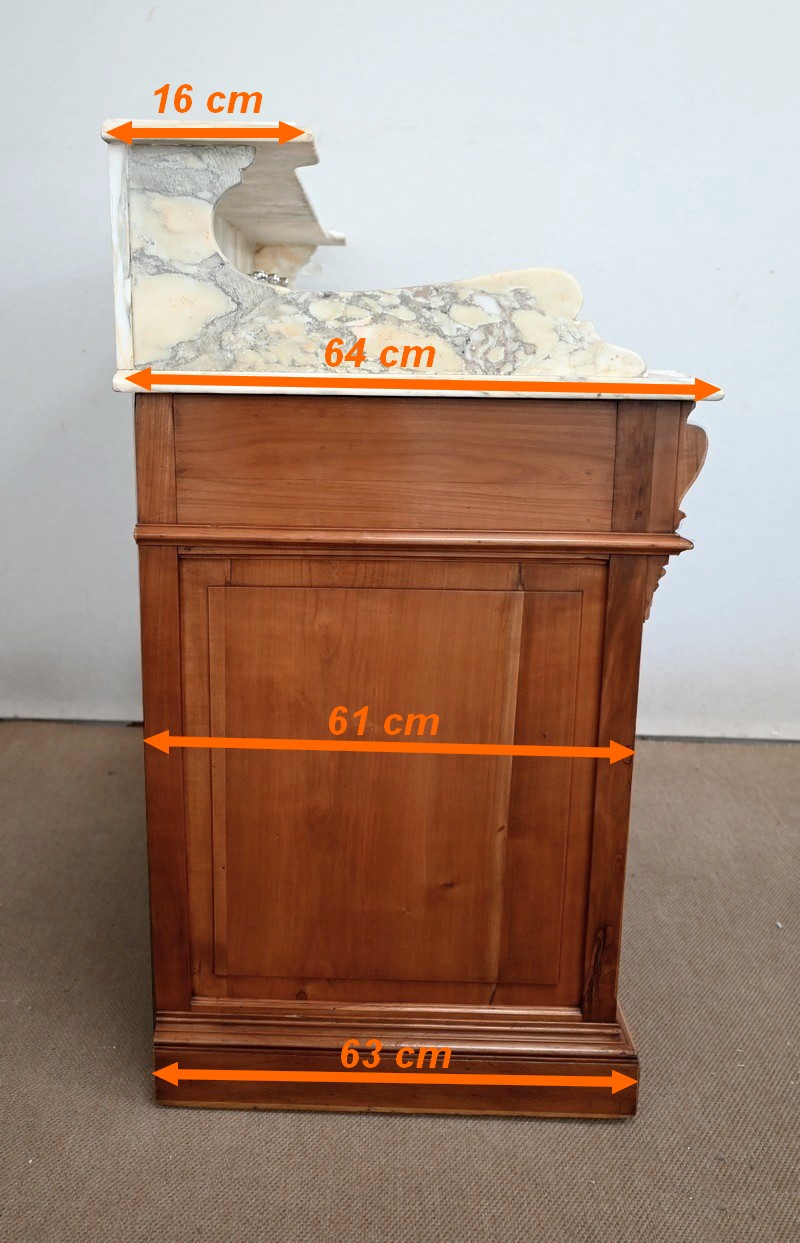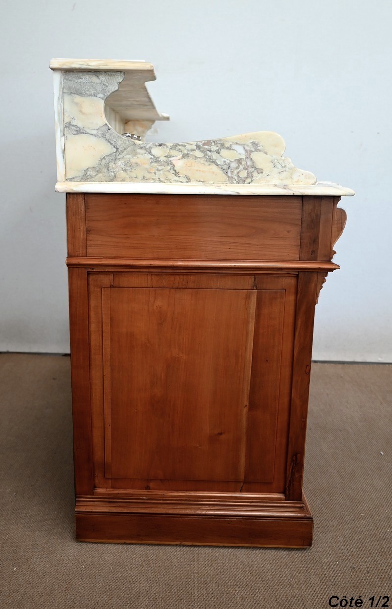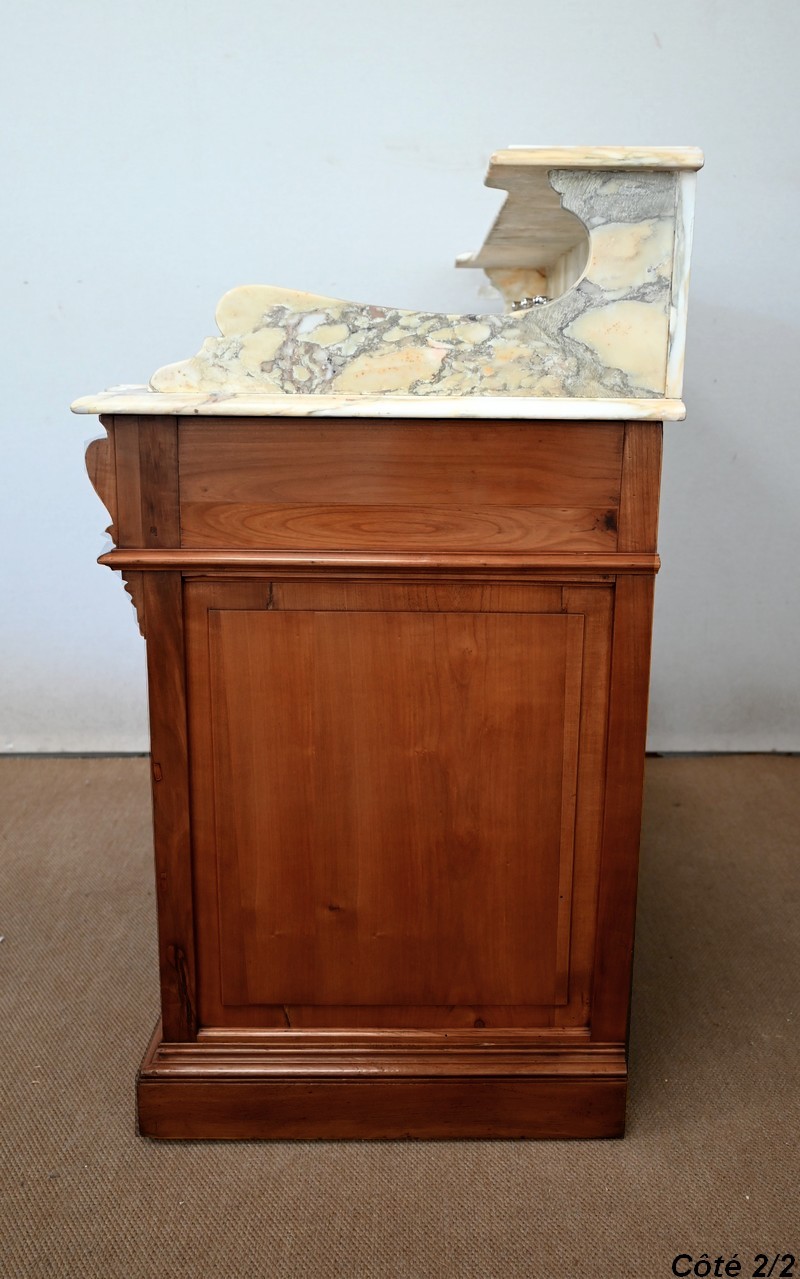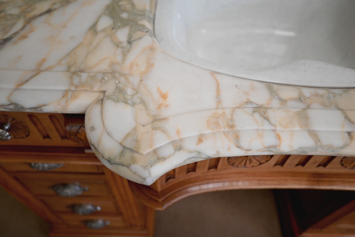 Ce meuble, en merisier massif avec intérieur en chêne, est sommé d’un marbre Breche du Benou jaune, originaire de la commune de Bieille dans les Pyrénées-Atlantiques. Ce dessus à réserve est mouluré à l’arête d’un bec-de-corbin. Celui-ci est équipé d’une vasque pivotante en porcelaine, avec système d’évacuation des eaux, ainsi que de deux robinets en inox « Maurice Herbeau », pouvant être indépendamment raccordés à l’eau chaude et froide. Ils sont chapeautés par une tablette en marbre, supportée aux extrémités par deux éléments en console. La ceinture, en avancée et à décrochement en partie centrale, propose deux tiroirs latéraux. Cet ensemble repose sur deux caissons sur plinthes. Celui de gauche ouvre par quatre tiroirs identiques, à poignées coquille en métal argenté. Celui de droite se compose d’une porte sur pommelles, munie d’un bouton de tirage et façonnée de lamelles rainurées en diagonales. L’intérieur propose une étagère réglable puisque sur crémaillères.