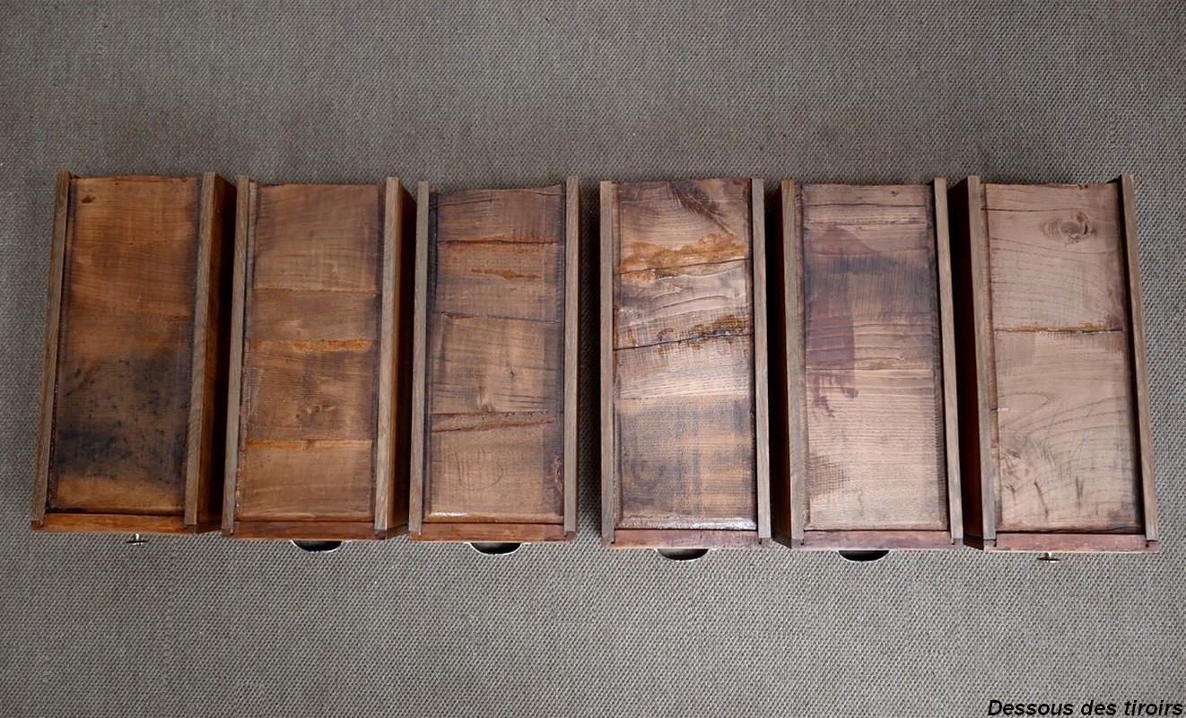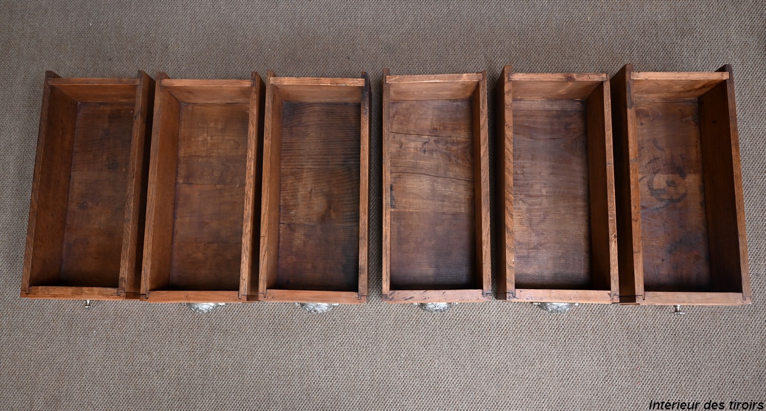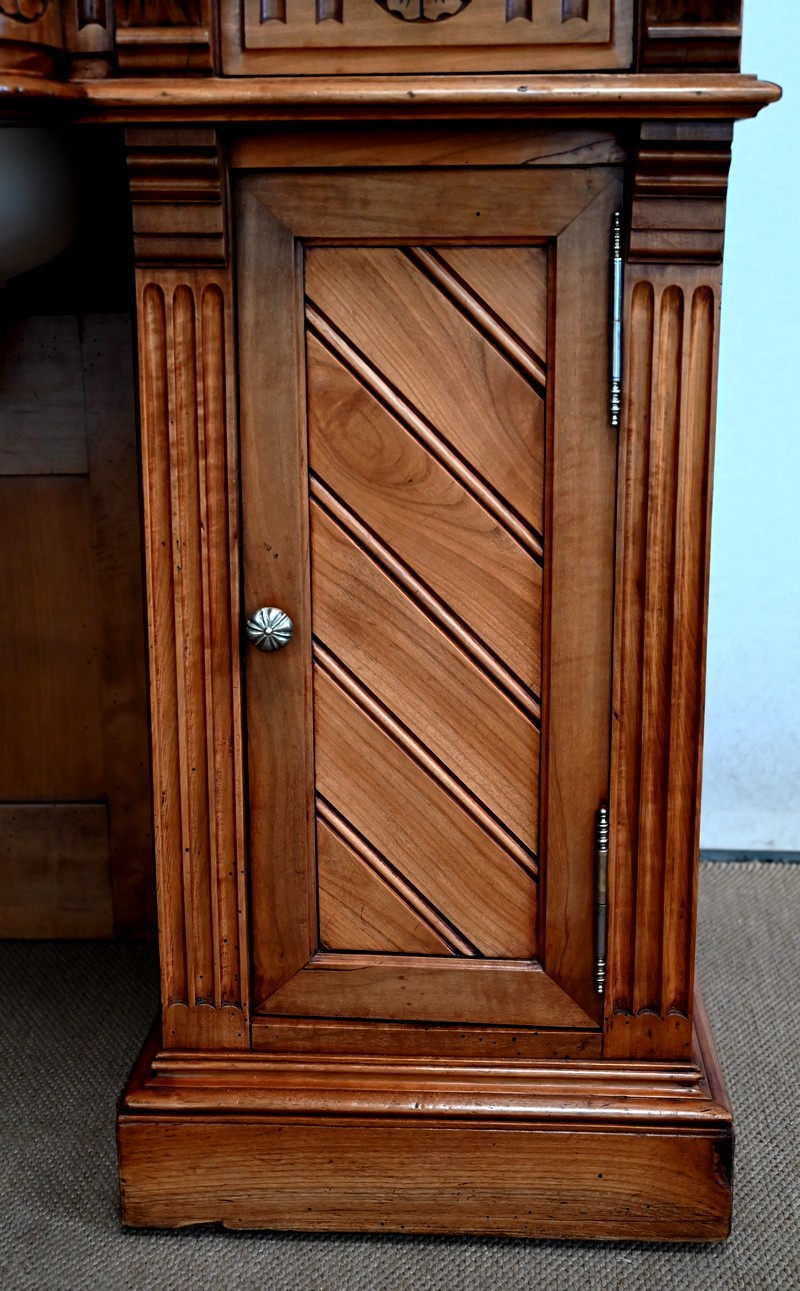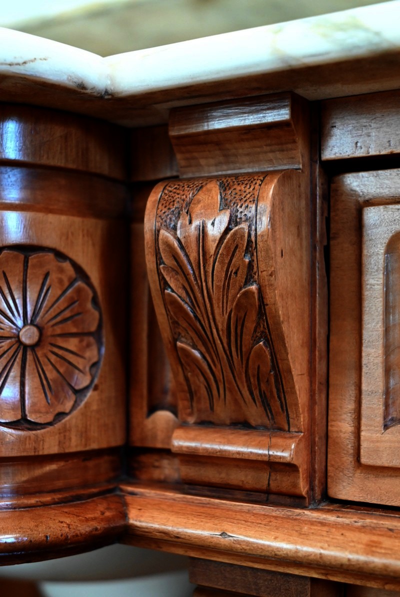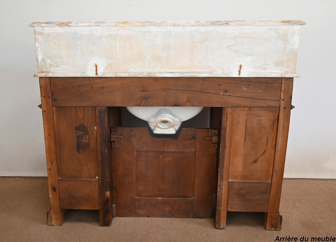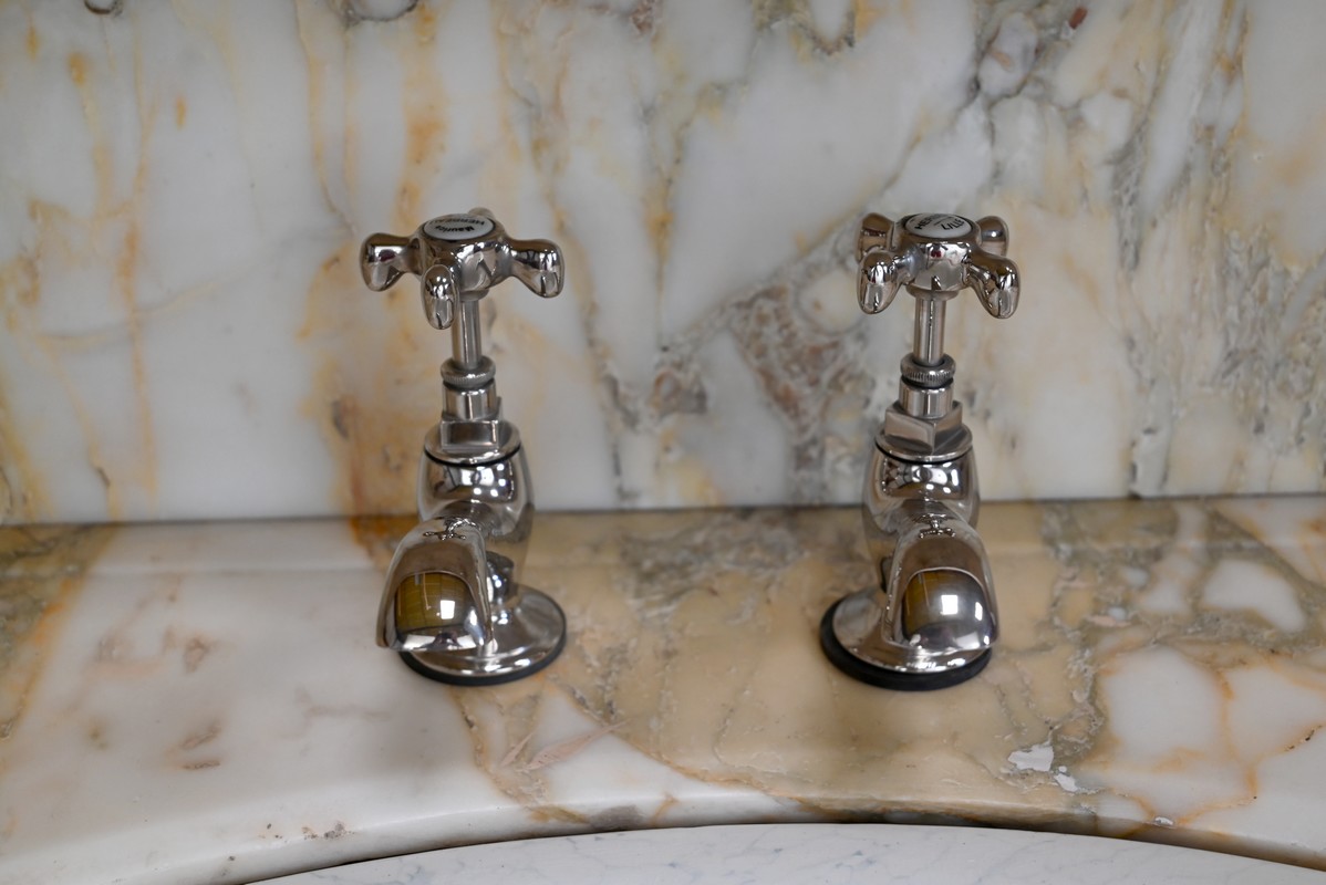 Ce meuble, en merisier massif avec intérieur en chêne, est sommé d’un marbre Breche du Benou jaune, originaire de la commune de Bieille dans les Pyrénées-Atlantiques. Ce dessus à réserve est mouluré à l’arête d’un bec-de-corbin. Celui-ci est équipé d’une vasque pivotante en porcelaine, avec système d’évacuation des eaux, ainsi que de deux robinets en inox « Maurice Herbeau », pouvant être indépendamment raccordés à l’eau chaude et froide. Ils sont chapeautés par une tablette en marbre, supportée aux extrémités par deux éléments en console. La ceinture, en avancée et à décrochement en partie centrale, propose deux tiroirs latéraux. Cet ensemble repose sur deux caissons sur plinthes. Celui de gauche ouvre par quatre tiroirs identiques, à poignées coquille en métal argenté. Celui de droite se compose d’une porte sur pommelles, munie d’un bouton de tirage et façonnée de lamelles rainurées en diagonales. L’intérieur propose une étagère réglable puisque sur crémaillères.