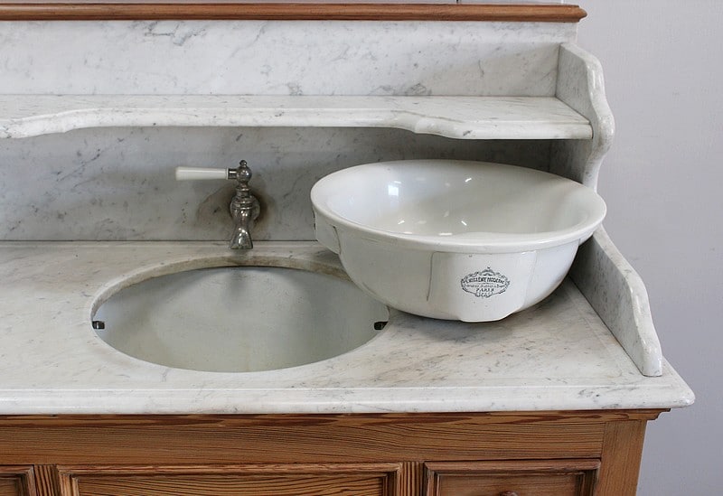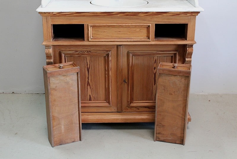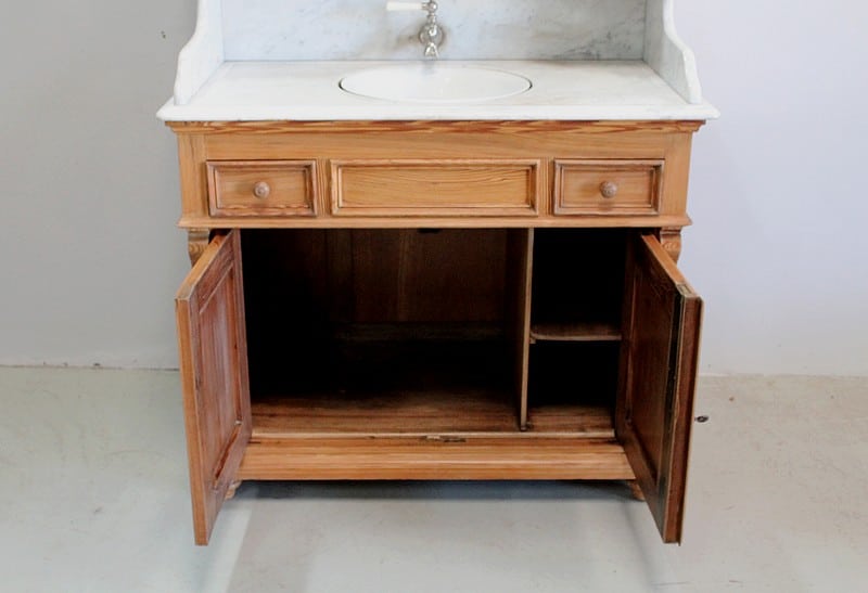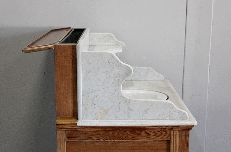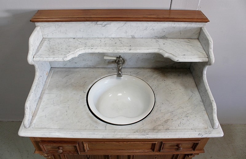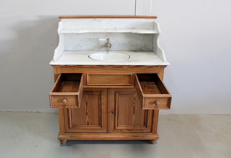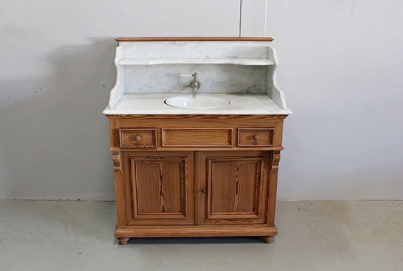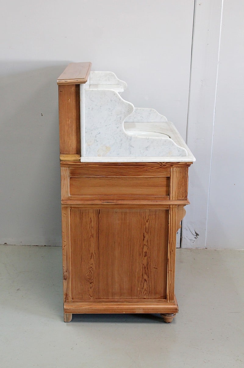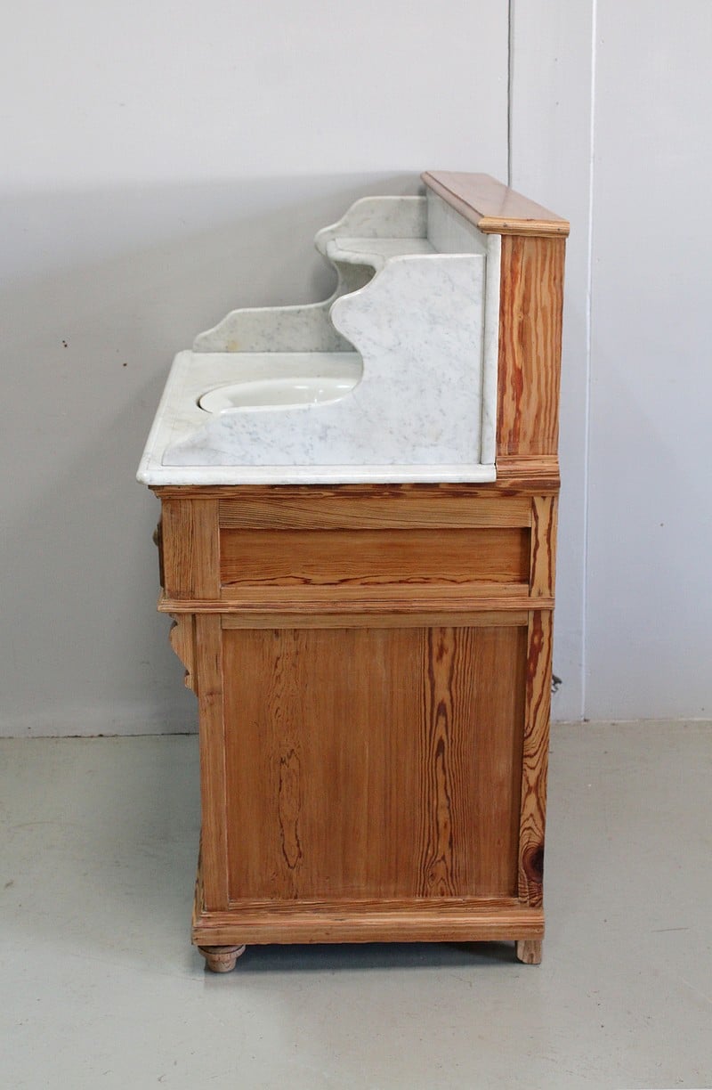 Meuble de toilette en Pitchpin et dessus en marbre blanc de Carrare.