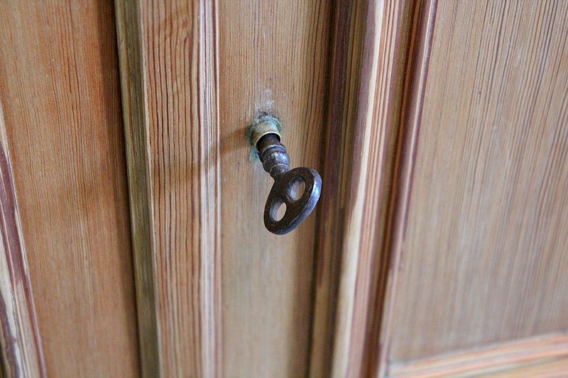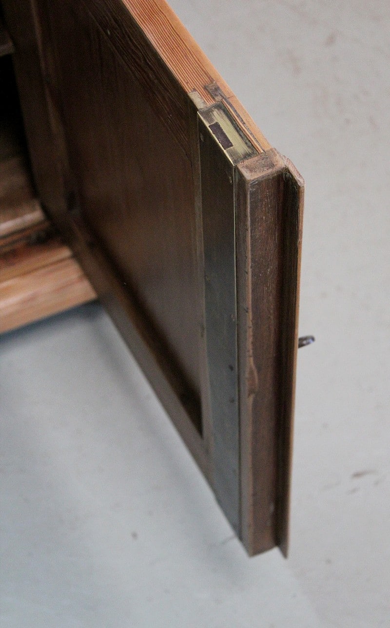 La partie basse est dotée de 2 profonds tiroirs en ceinture à boutons, surmontant deux portes fermant à clef, avec fermeture haut et bas. L’intérieur est garni d’une séparation sur le côté droit ainsi que d’une petite étagère.