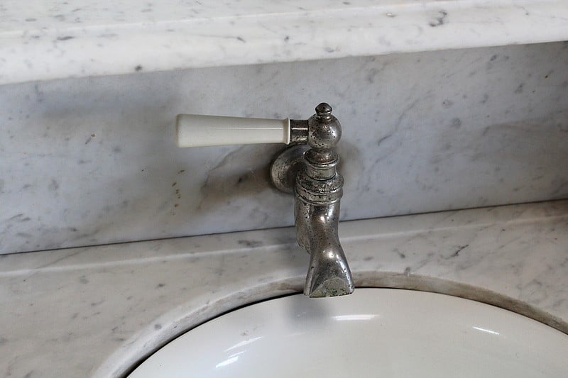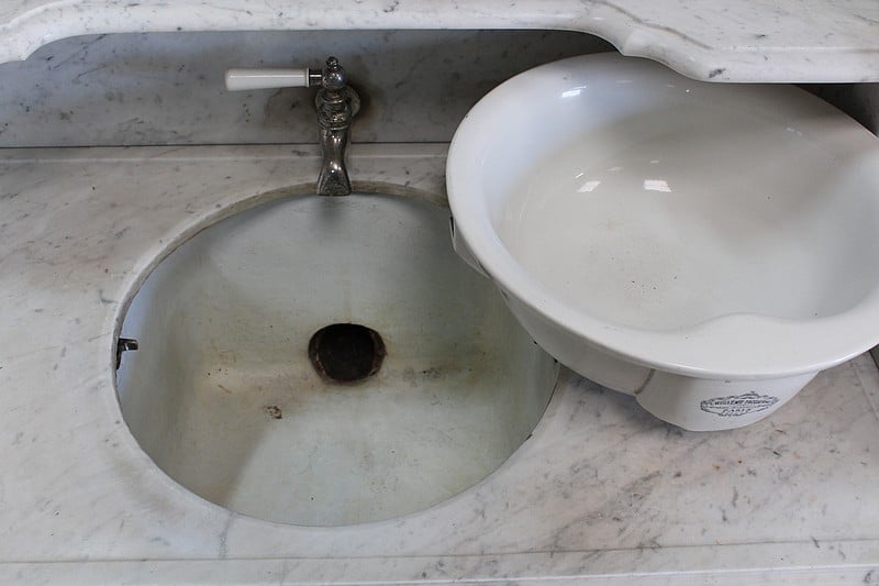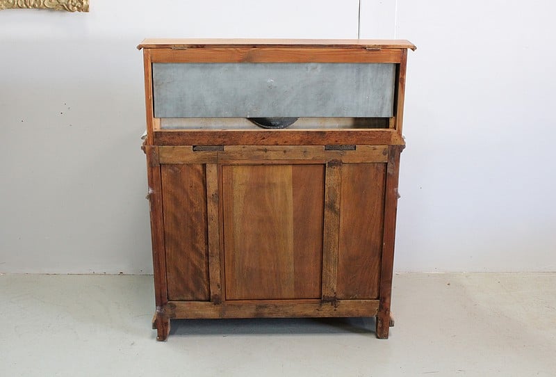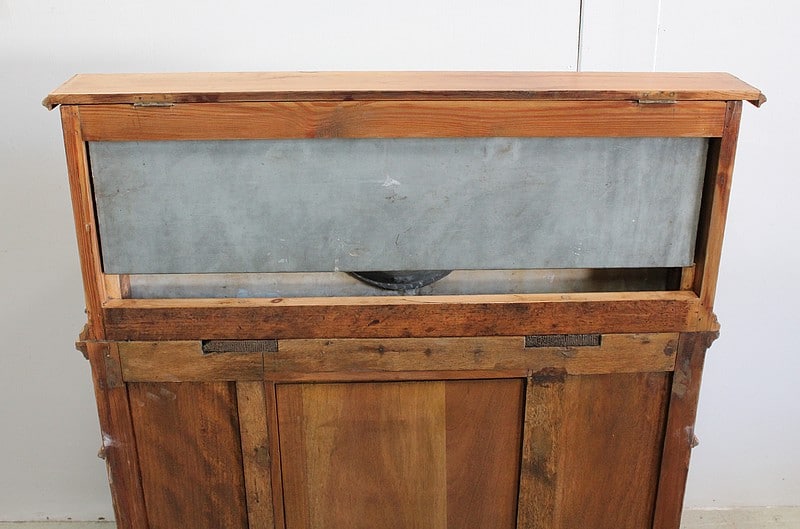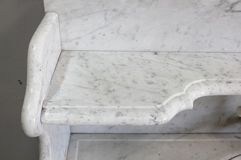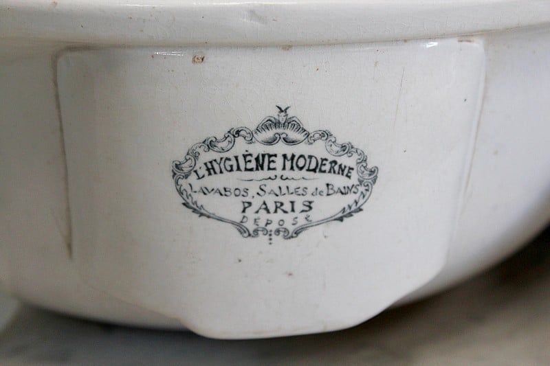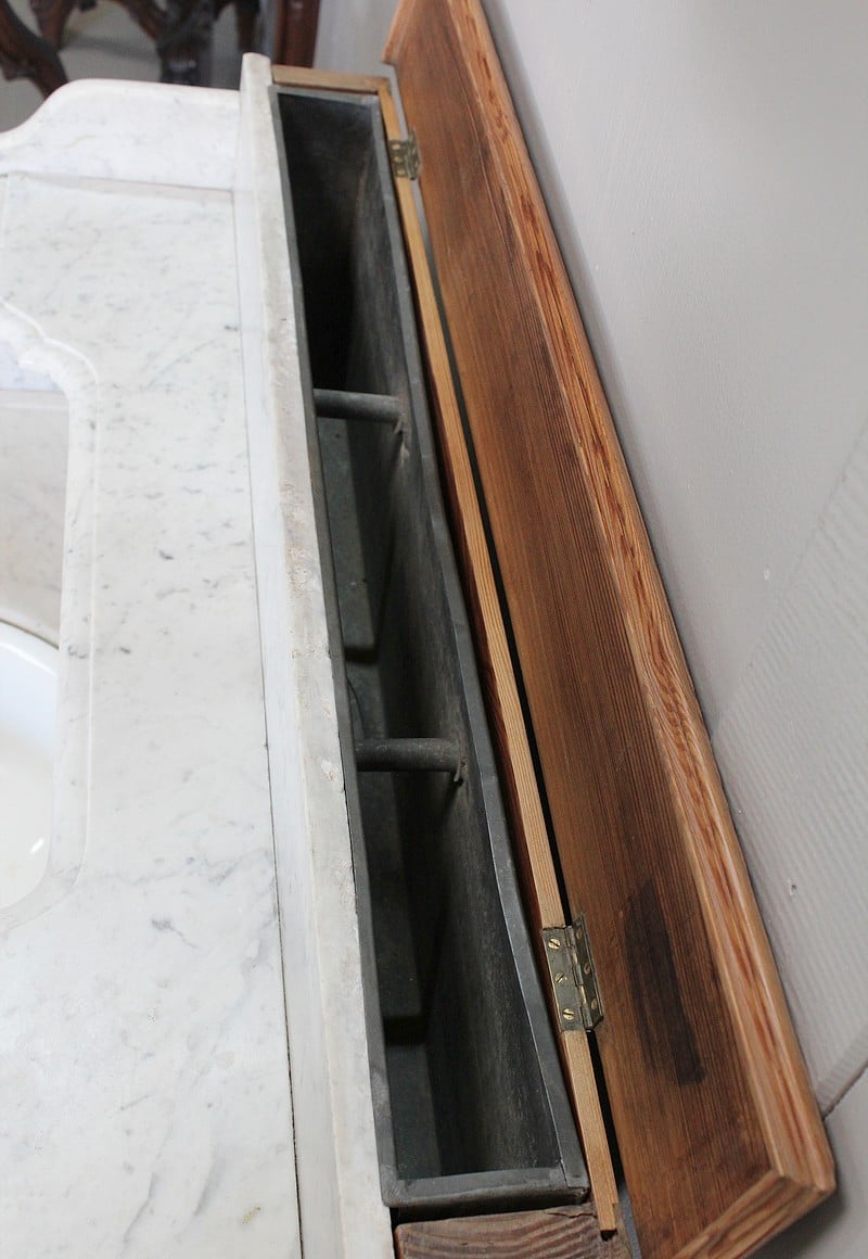 La partie haute en marbre est découpée et moulurée à bec de corbin et agrémentée d’une vasque basculante signée ‘L’hygiène moderne, Lavabos, salles de bains, Paris, Déposé’. Un robinet dont le manche est en céramique permet de disposer de l’eau contenue dans le réservoir en zinc situé à l’arrière.