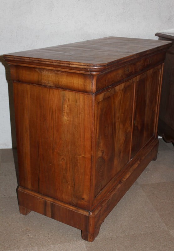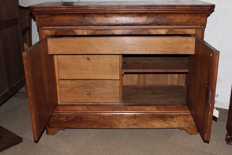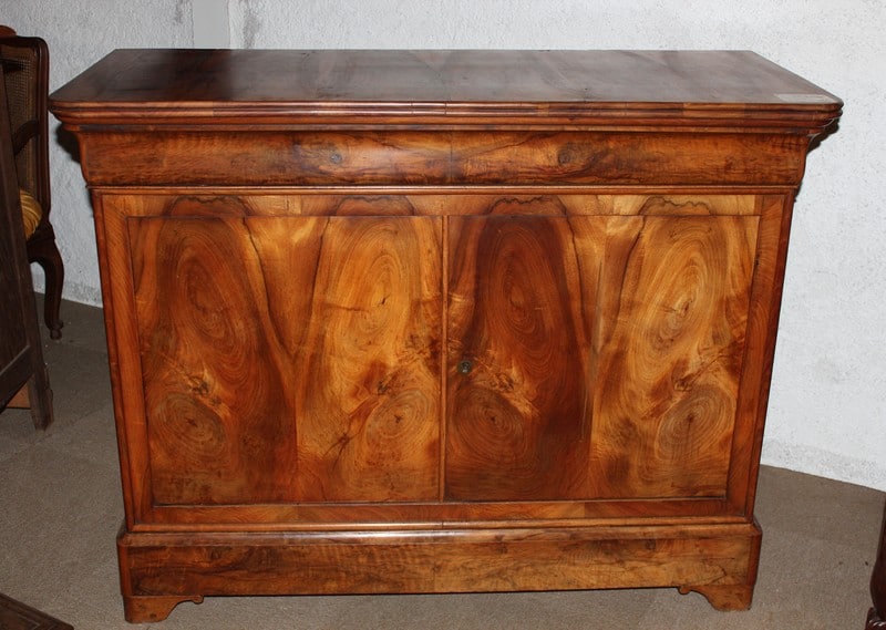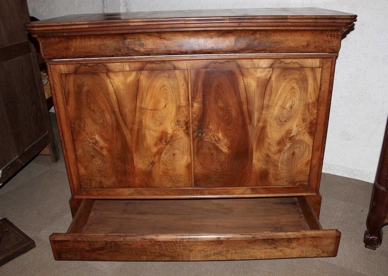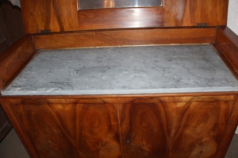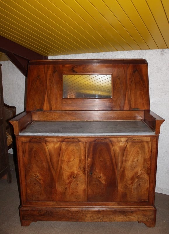 Meuble de toilette Louis-Philippe en placage de noyer. Il ouvre sur le dessus laissant apparaître un marbre et un miroir et par 2 portes et 1 tiroir dans la plinthe. L’intérieur est composé de 3 tiroirs et 1 étagère. Très beau ramage du bois aux teintes lumineuses. Époque : seconde moitié du XIXe (1860). Parfait état et finition uniquement cirée.