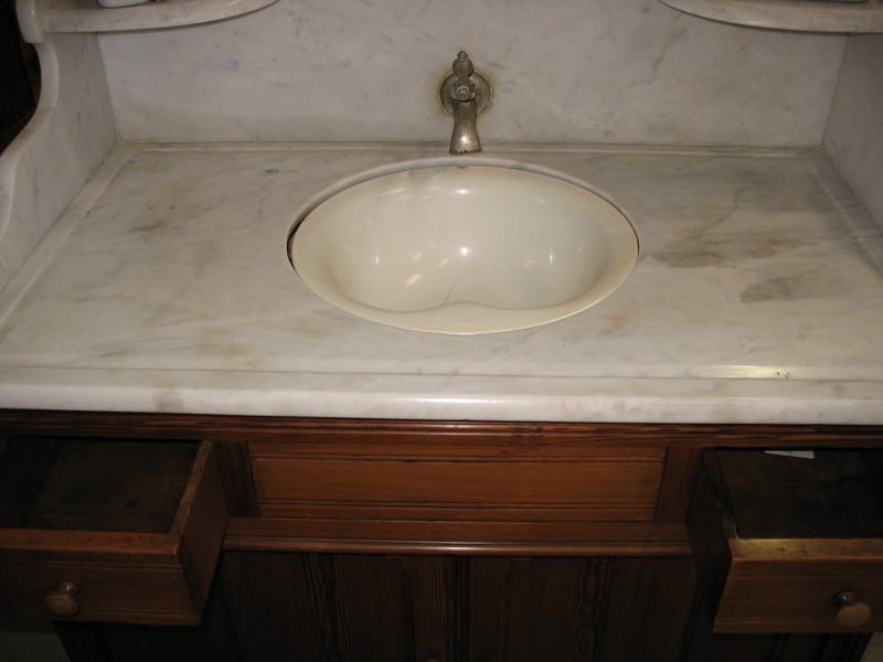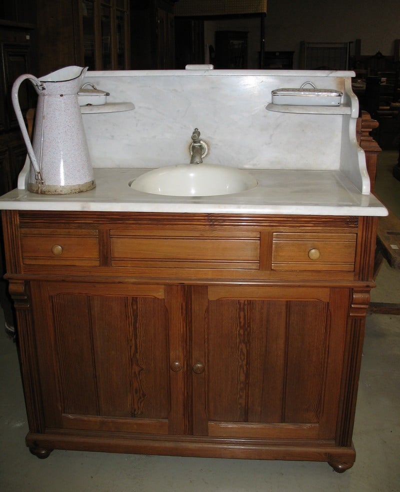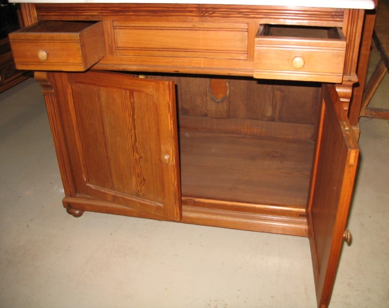 Meuble de Coiffeur en pitchpin avec sa vasque en faïence intégrée et basculante pour l’évacuation dans un bac. Dessus en marbre blanc. Ouvrant par 2 portes et 2 petits tiroirs. Époque 1900.