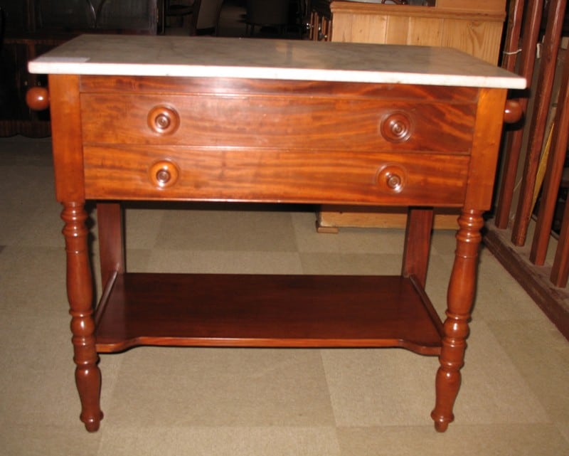 Table de Toilette en Acajou avec dessus en marbre blanc. ouvrant par 2 tiroirs. Tablette d’entretoise en partie basse. Époque : fin XIXe.