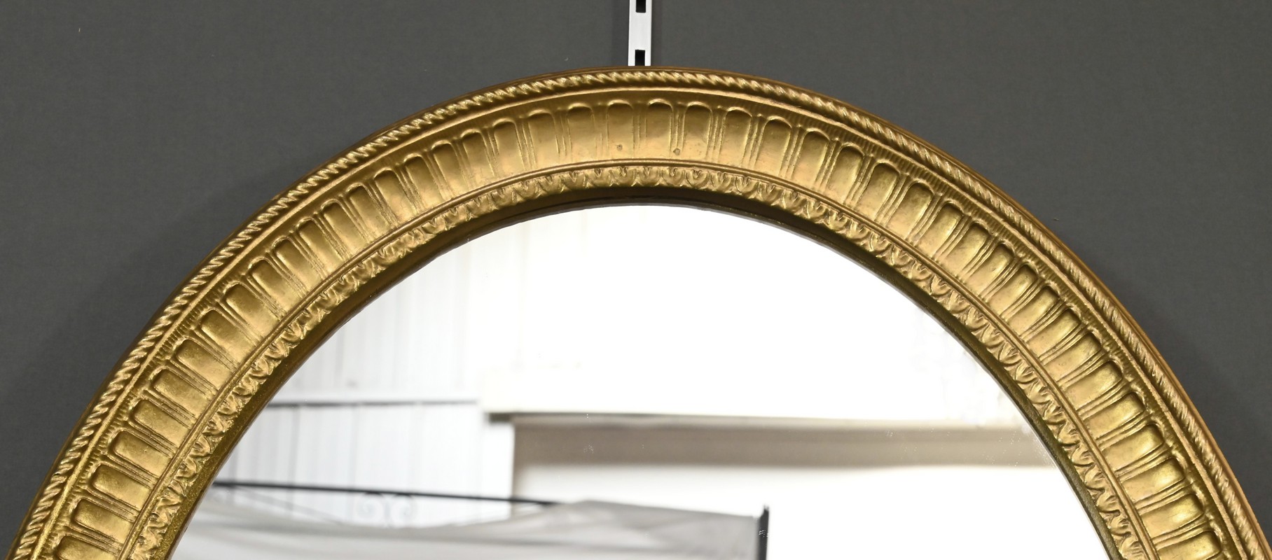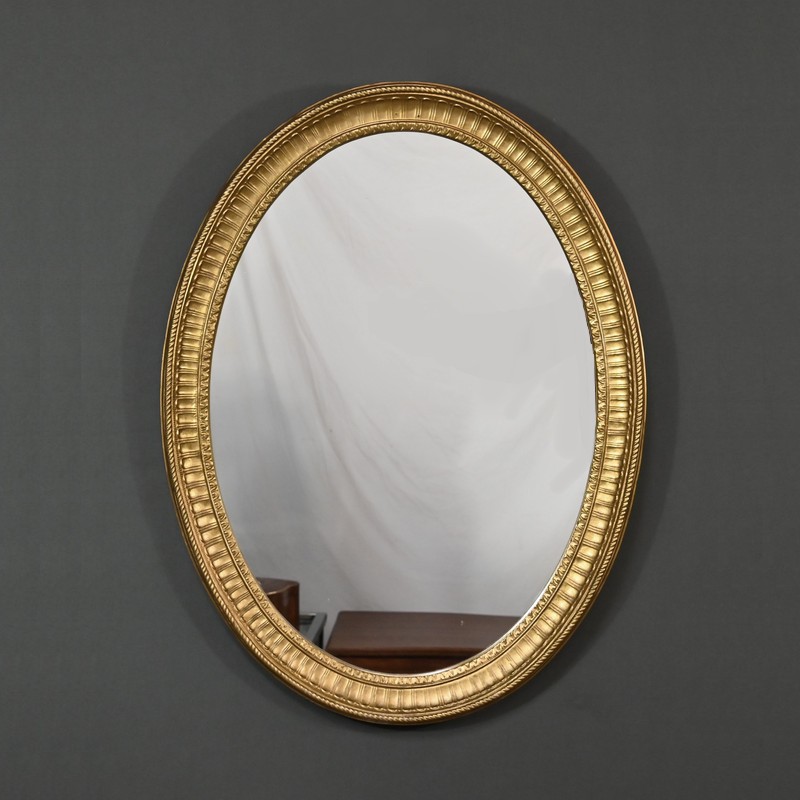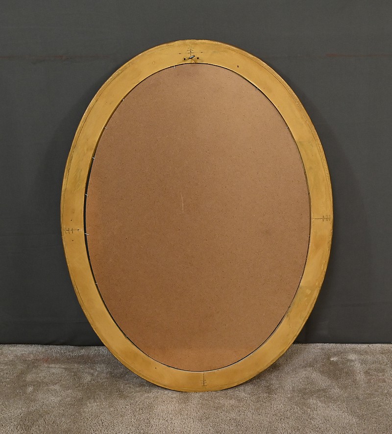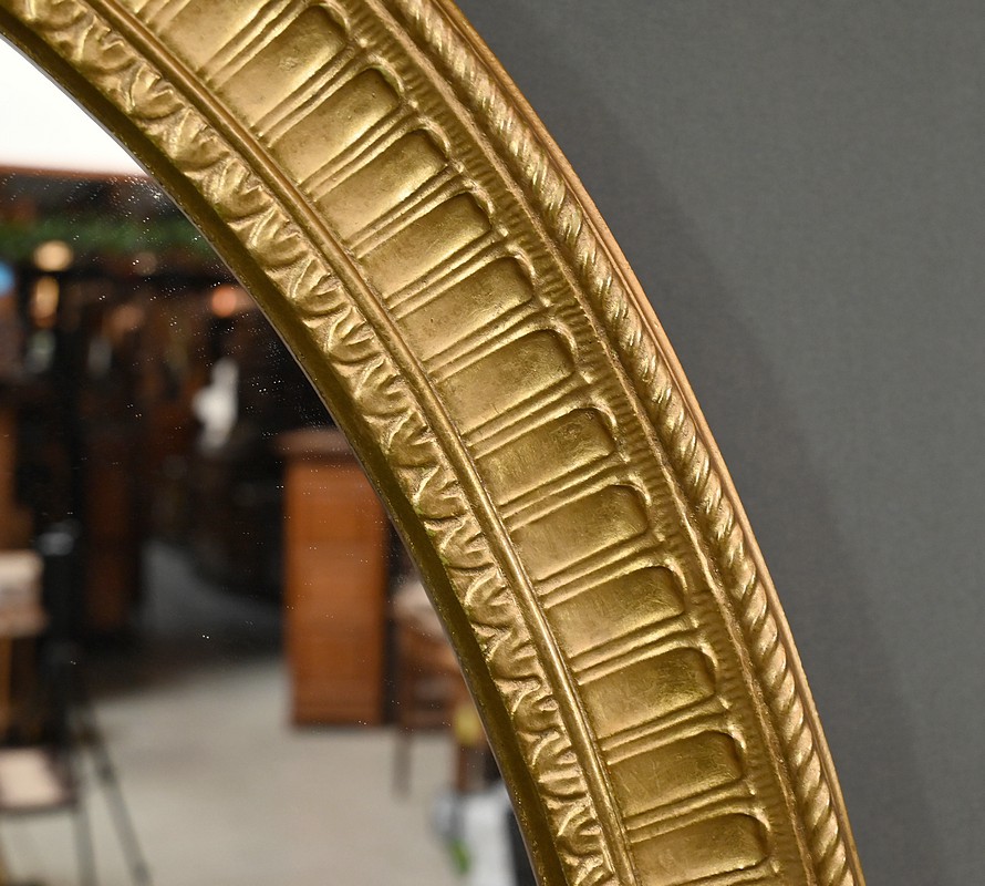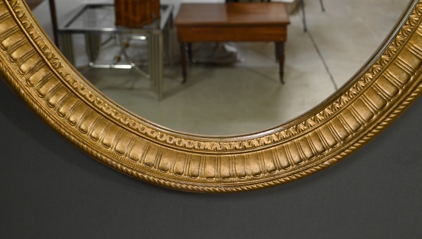 Ce miroir Louis XVI possède un cadre doré mouluré qui lui donnent une allure raffinée. Sa forme ovale et son ornementation soignée évoquent un style néoclassique sobre. Son pourtour figure un ruban torsadé en relief, des stries et des oves. Un bel objet décoratif qui sublimera votre intérieur par son caractère élégant et sa luminosité.