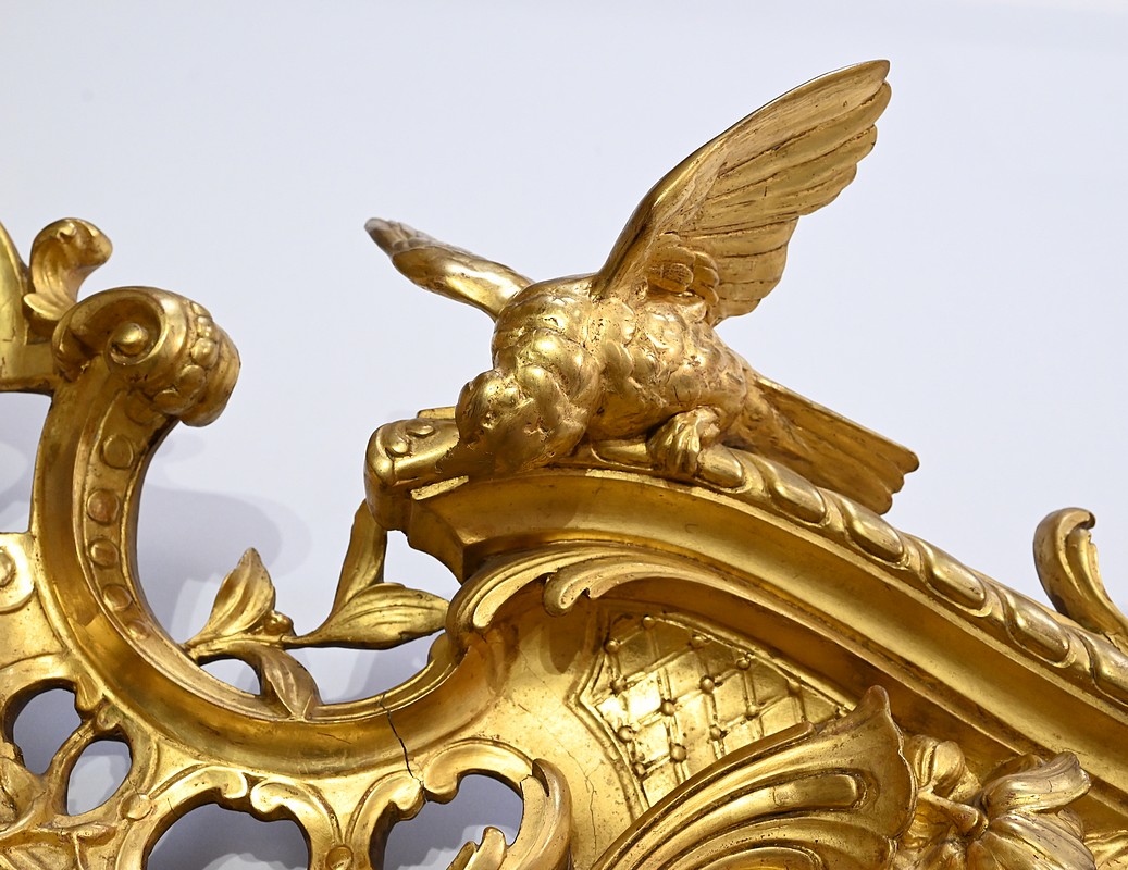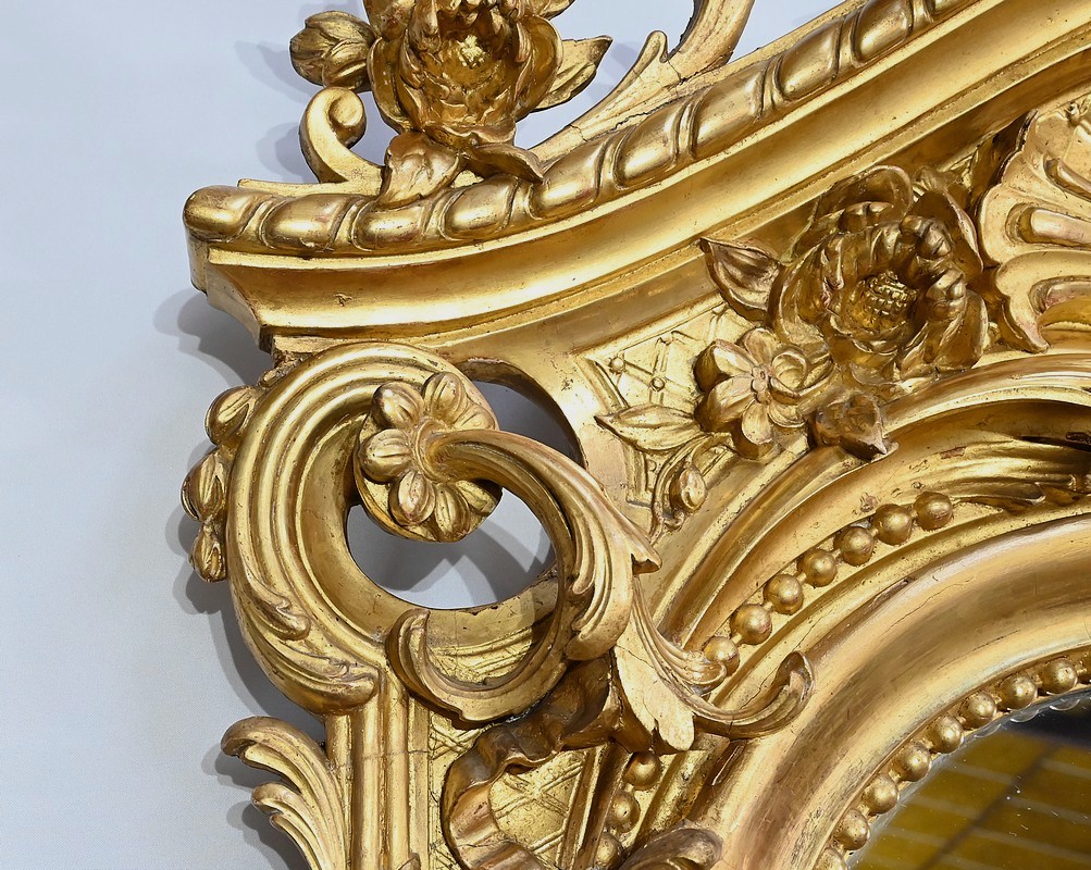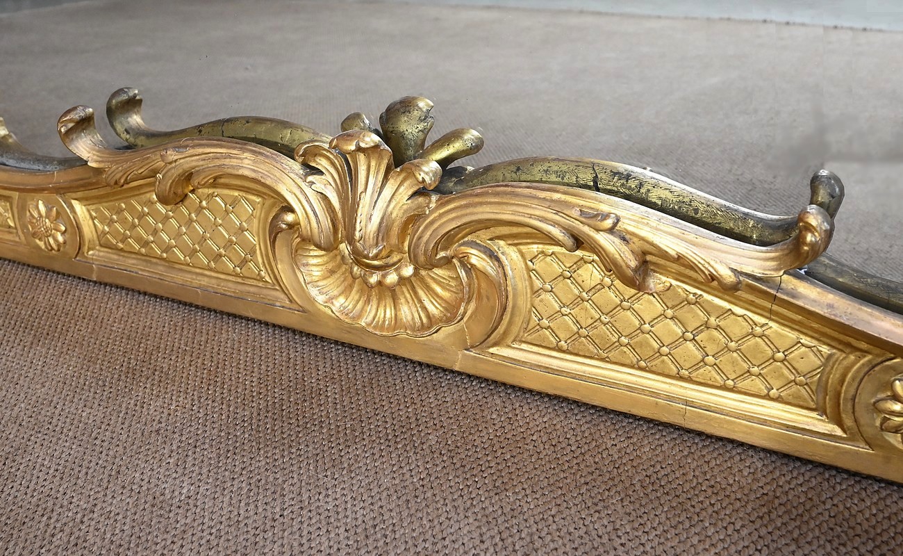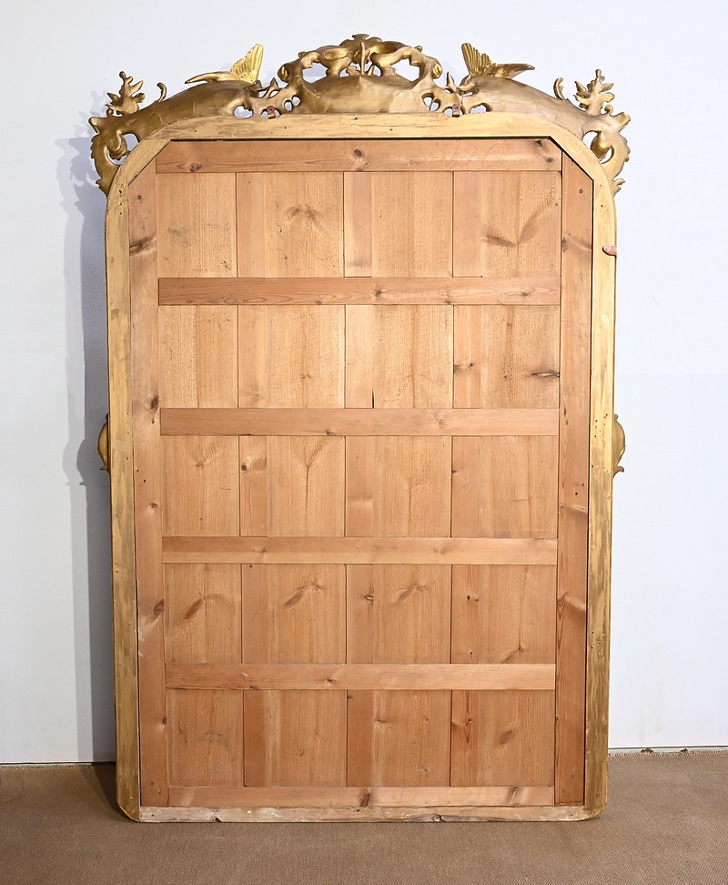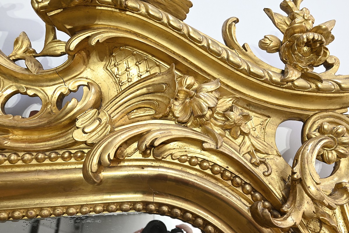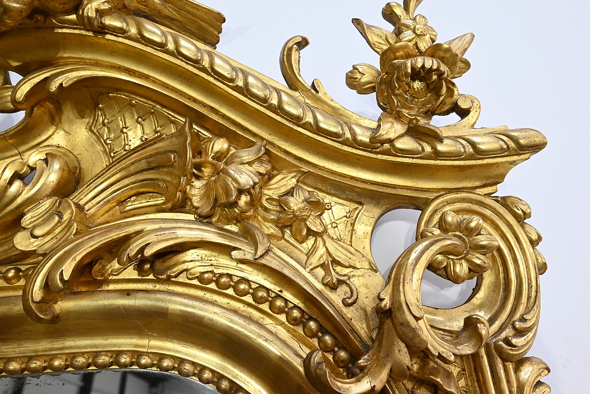 Très grand Miroir Rocaille en bois sculpté, mouluré et doré.