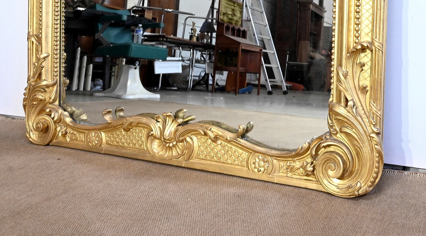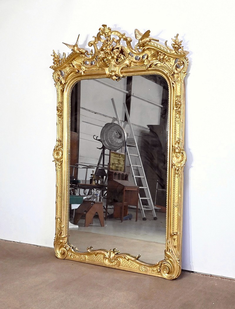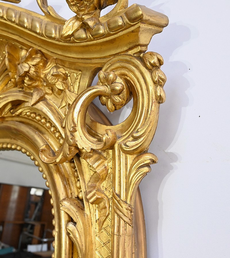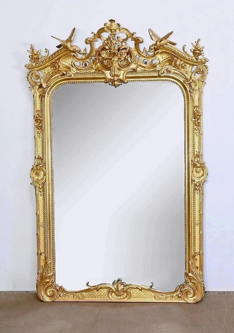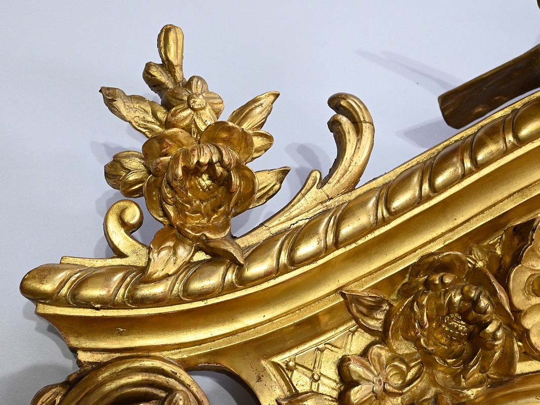 Très grand Miroir Rocaille en bois sculpté, mouluré et doré.