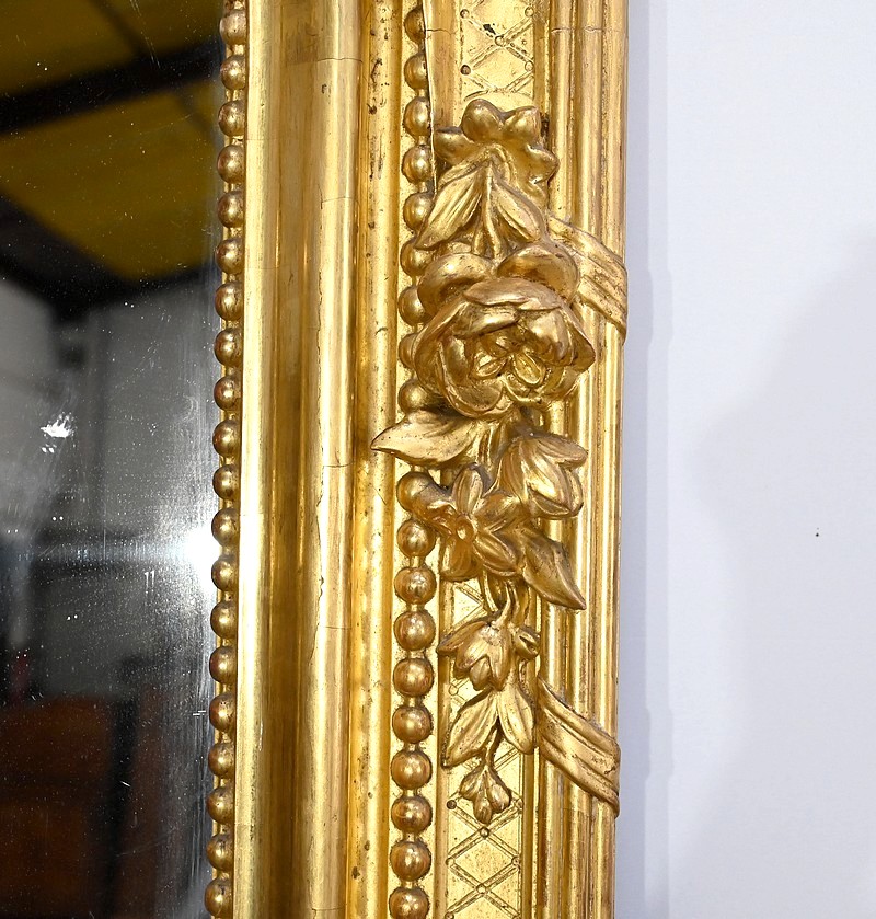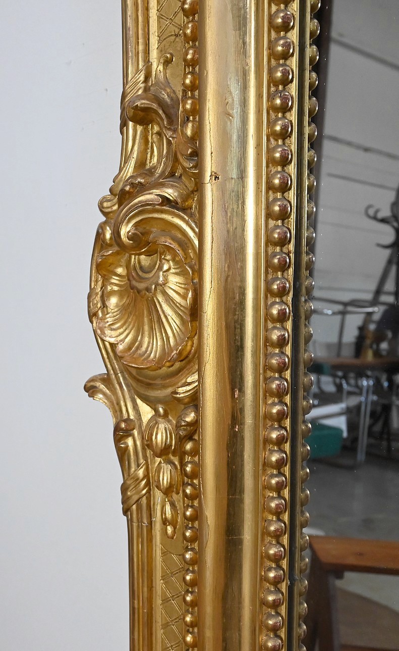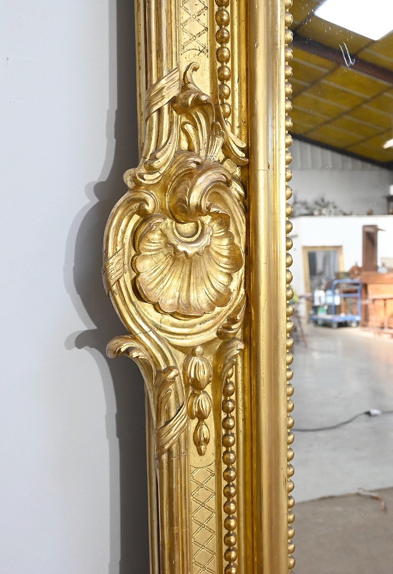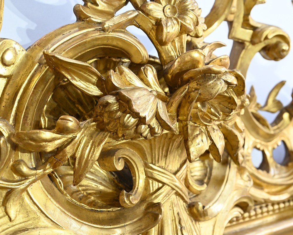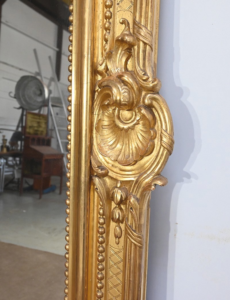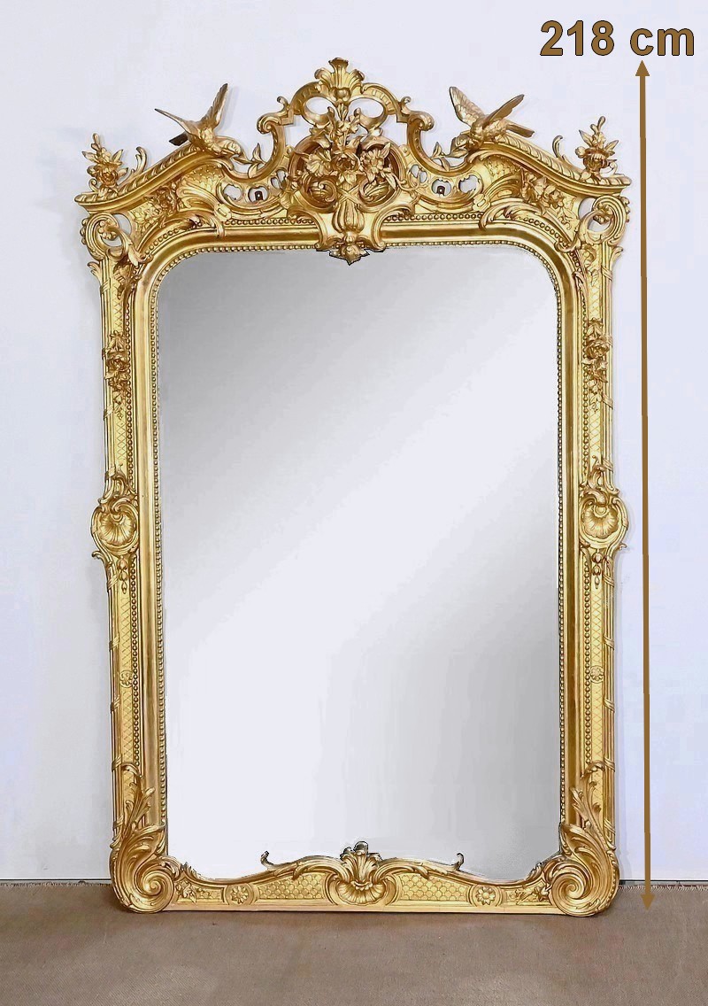 Très grand Miroir Rocaille en bois sculpté, mouluré et doré.