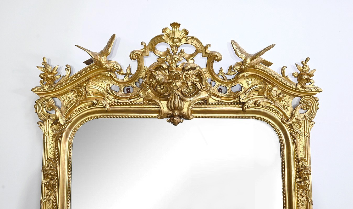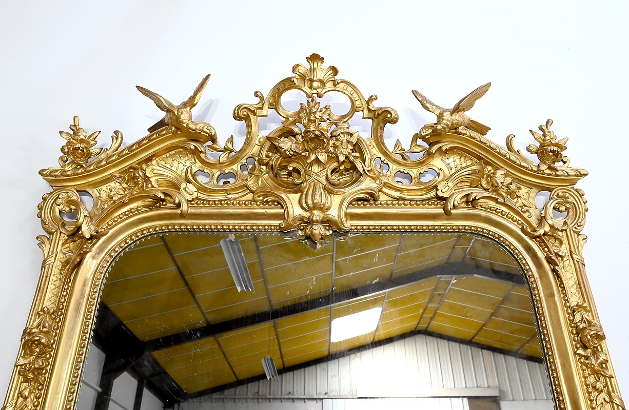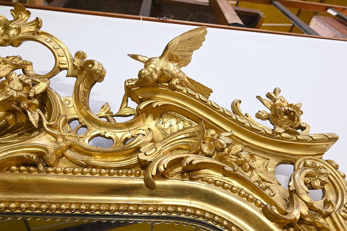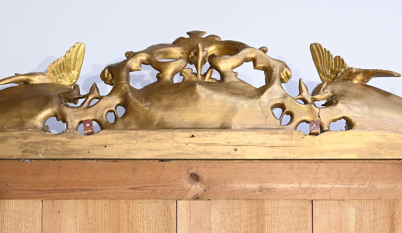 Le décor mouvementé présente des motifs de guirlandes de fleurs, de rinceaux, de feuilles d’acanthe et de coquilles rocailles. Le fronton majestueux est sommé de deux oiseaux déployant leurs ailes autour de magnifiques bouquets de roses et de pivoines. D’origine, le miroir au mercure est entouré d’une guirlande de perles élégante.