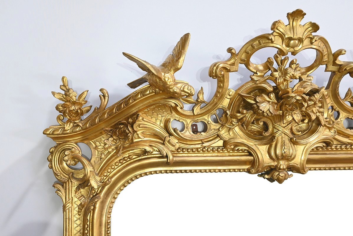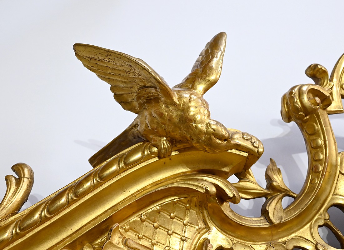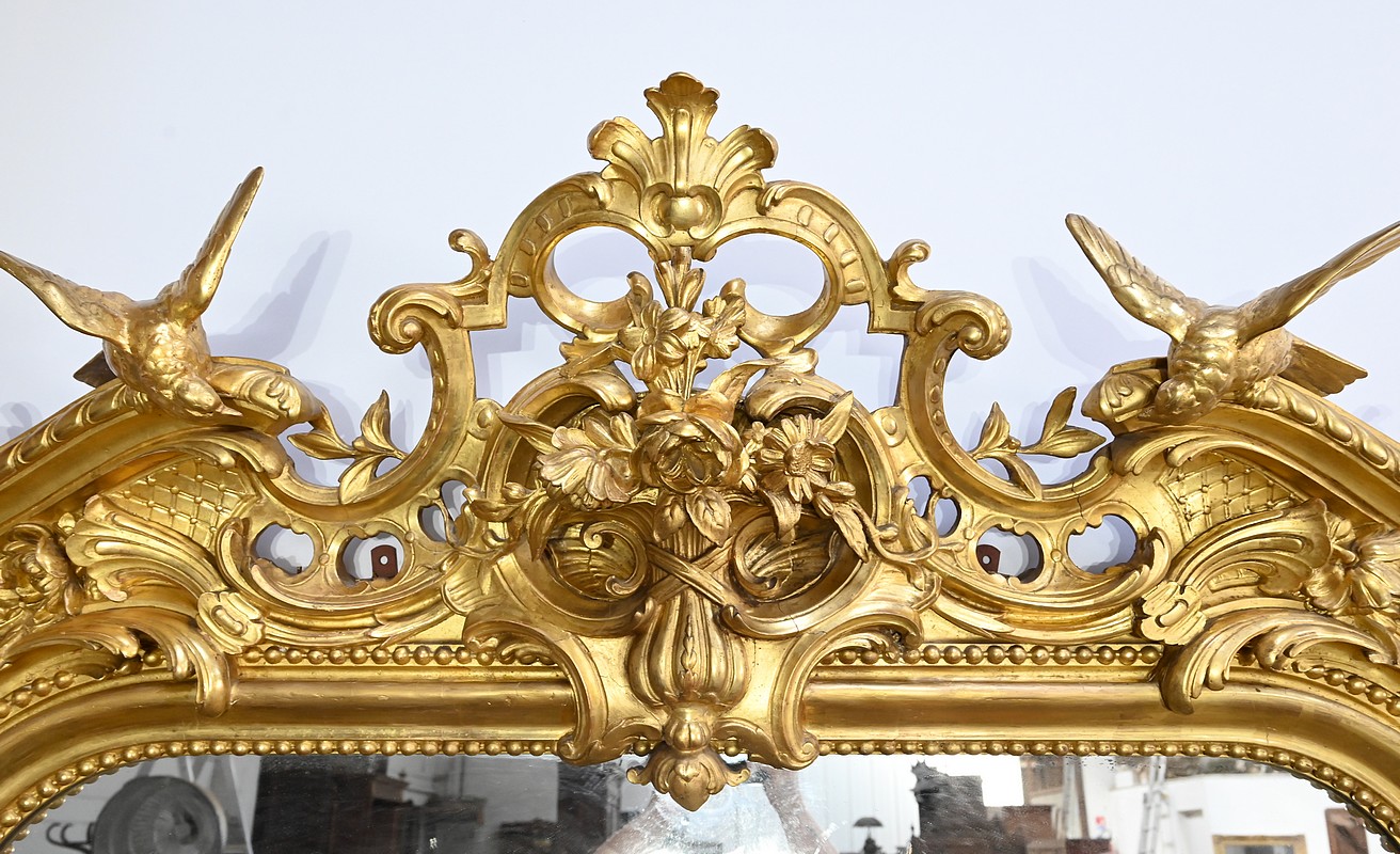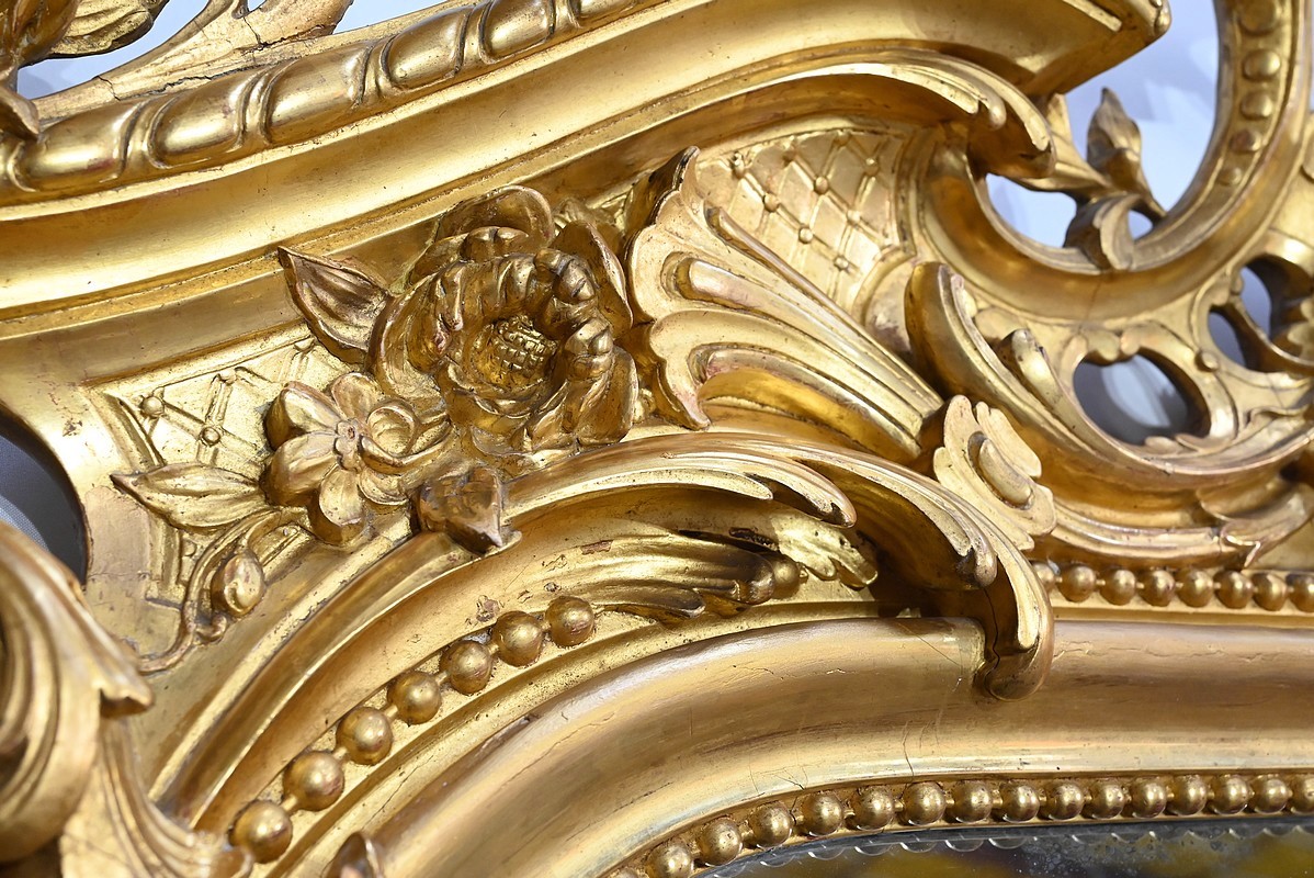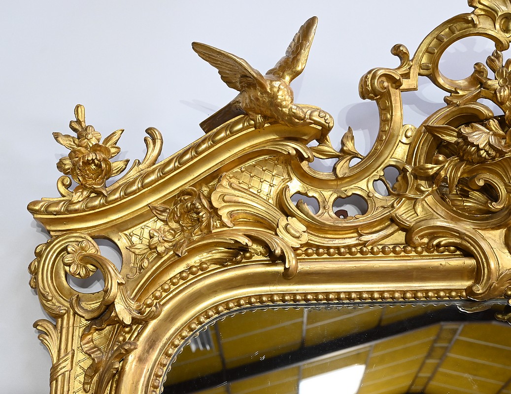 Le décor mouvementé présente des motifs de guirlandes de fleurs, de rinceaux, de feuilles d’acanthe et de coquilles rocailles. Le fronton majestueux est sommé de deux oiseaux déployant leurs ailes autour de magnifiques bouquets de roses et de pivoines. D’origine, le miroir au mercure est entouré d’une guirlande de perles élégante.