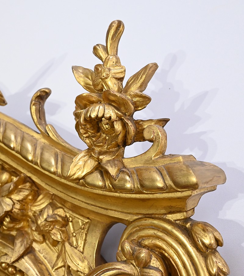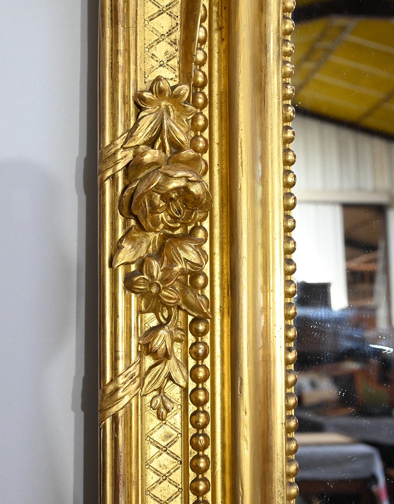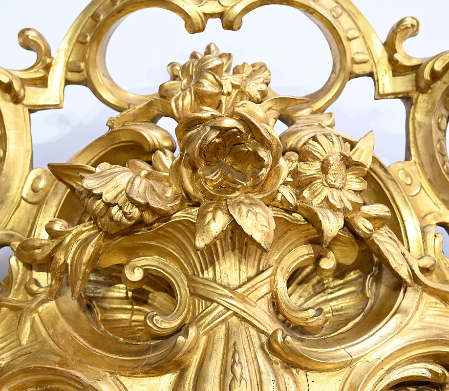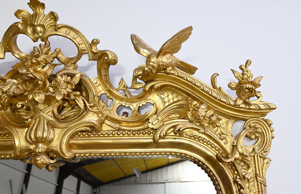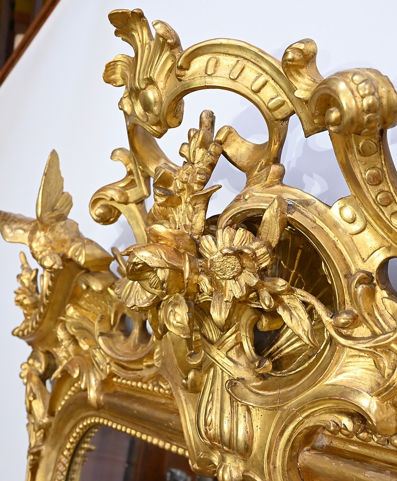Le décor mouvementé présente des motifs de guirlandes de fleurs, de rinceaux, de feuilles d’acanthe et de coquilles rocailles. Le fronton majestueux est sommé de deux oiseaux déployant leurs ailes autour de magnifiques bouquets de roses et de pivoines. D’origine, le miroir au mercure est entouré d’une guirlande de perles élégante.