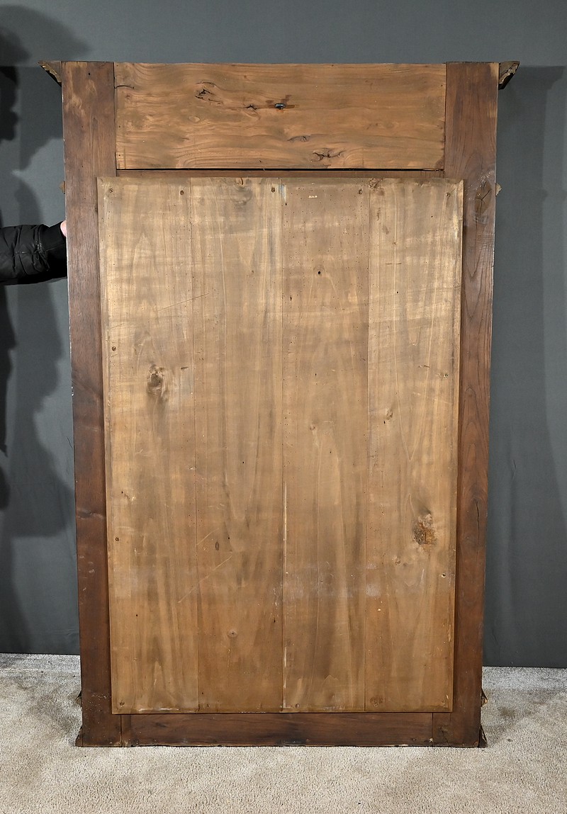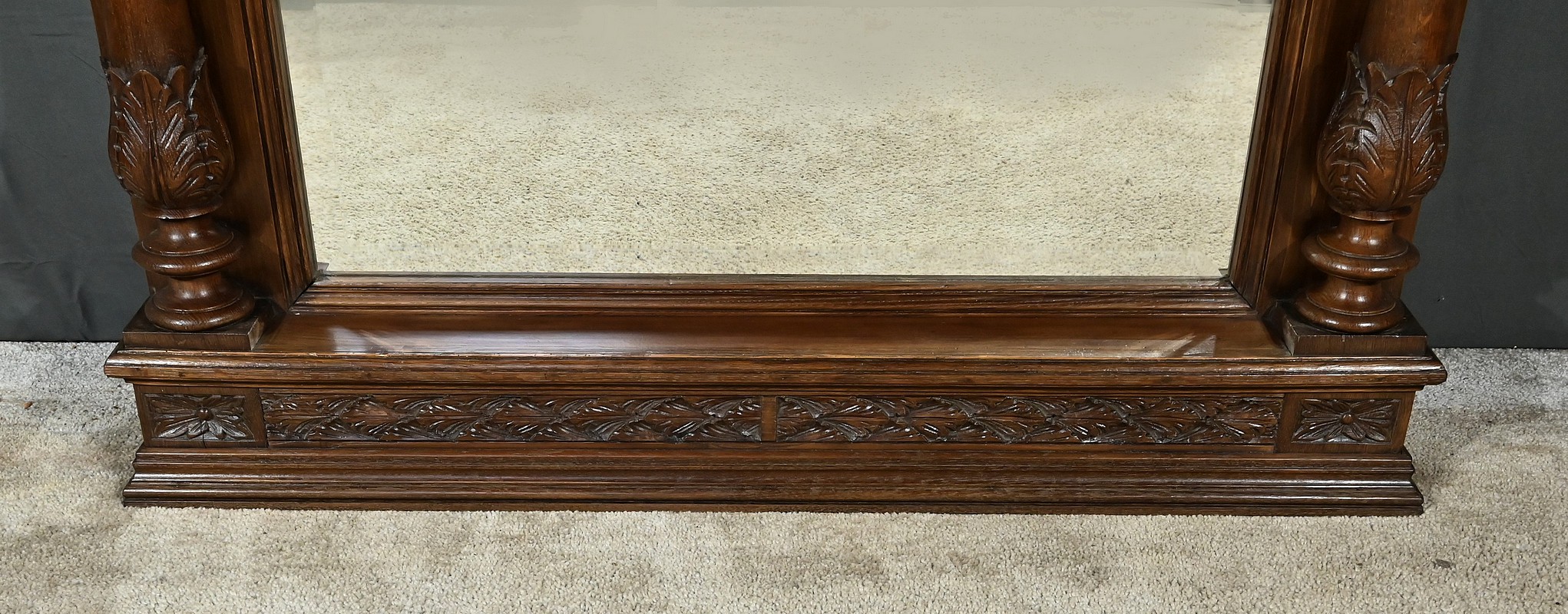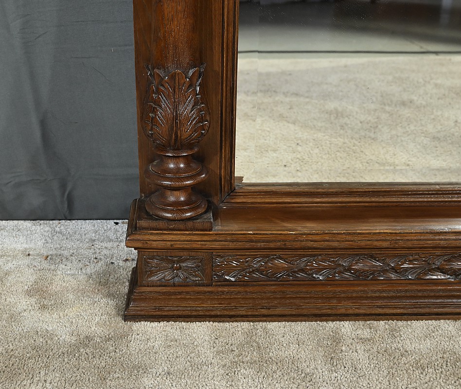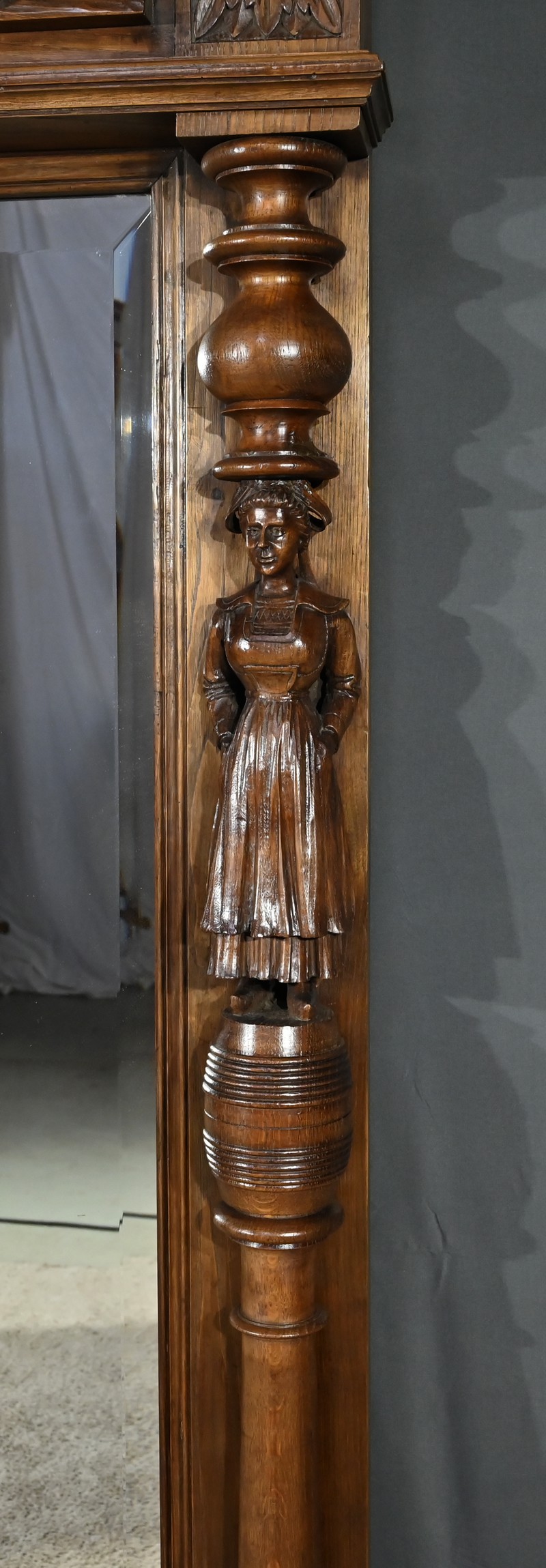 Grand Miroir Breton composé d’une glace d’origine biseautée et d’un important cadre sculpté. Ce dernier est sommé d’un fronton en relief figurant des personnages vêtus d’habits traditionnels, dansant au son du biniou breton sur un fond paysagé. Cette scène est surmontée d’une corniche moulurée et accompagnée de grandes fleurs sculptées à ses extrémités. De chaque côté du miroir, deux pilastres tournés sont sculptés, figurant une femme et un homme debout sur un tonneau. En partie basse, nous retrouvons une frise végétale et une base moulurée.