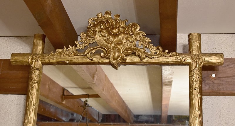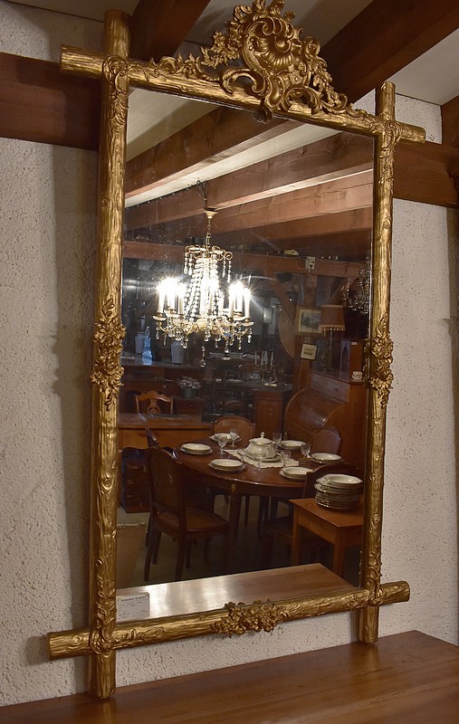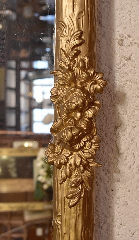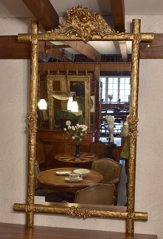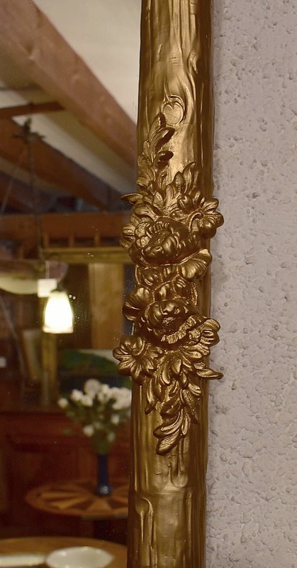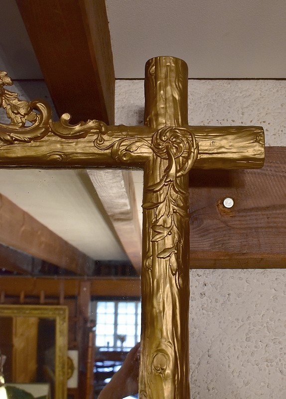 Miroir à entourage doré, les montants simulant des branches d’arbre avec décors de fleurs.