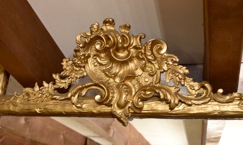 Le fronton est orné d’une coquille entourée de fleurs et de rinceaux