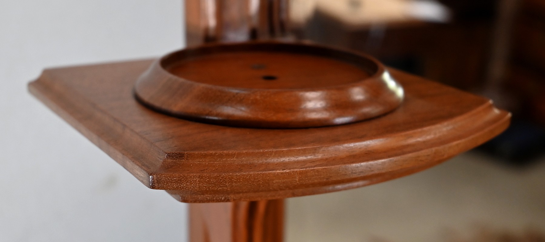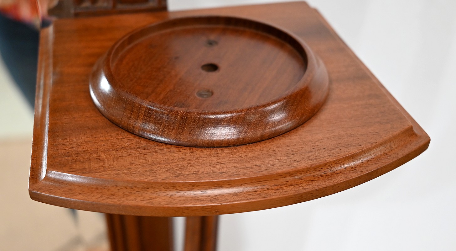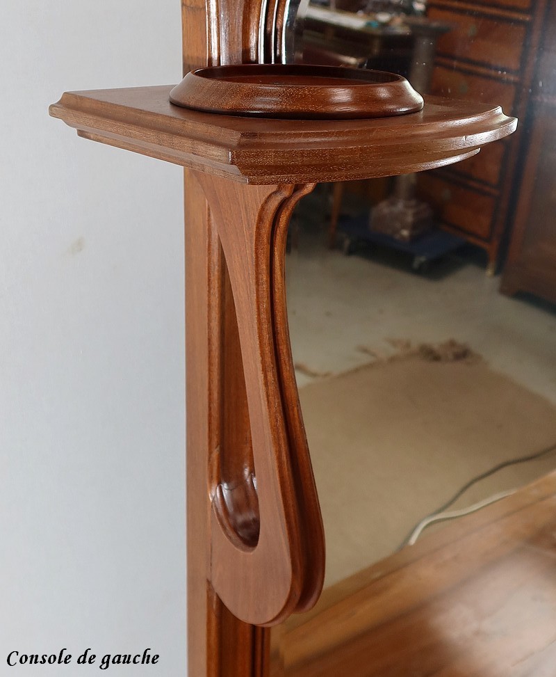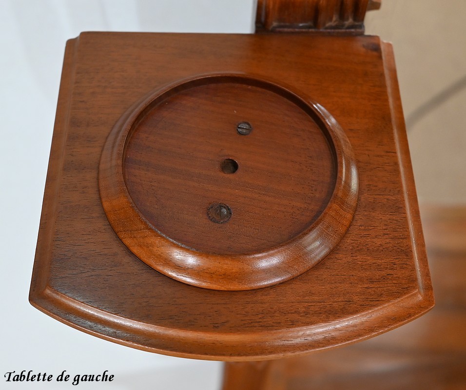 De part et d’autre, deux consoles en courbes supportent deux tablettes à bords en gorges. Deux ronds en acajou, vissés dans ces dernières, pourront servir de réceptacles à des bougies ou autres objets décoratifs.
