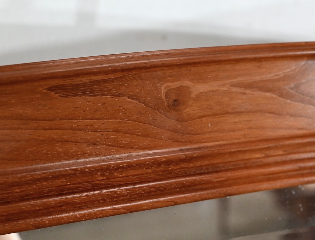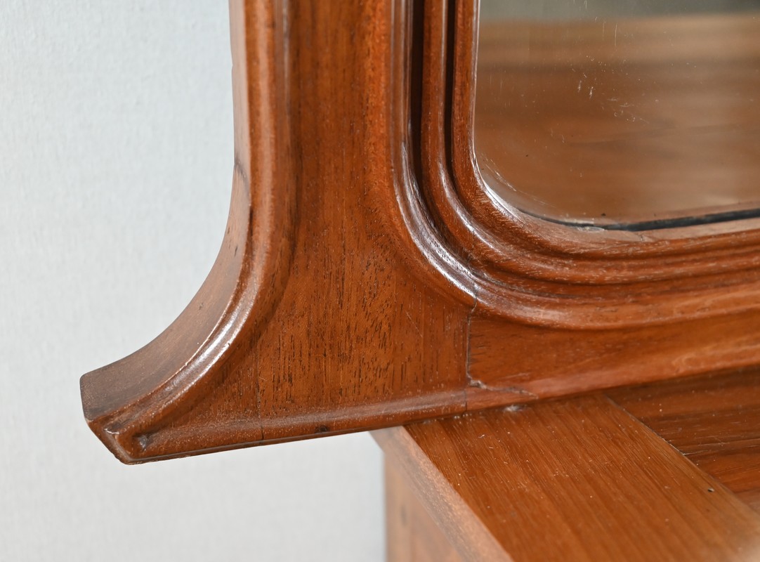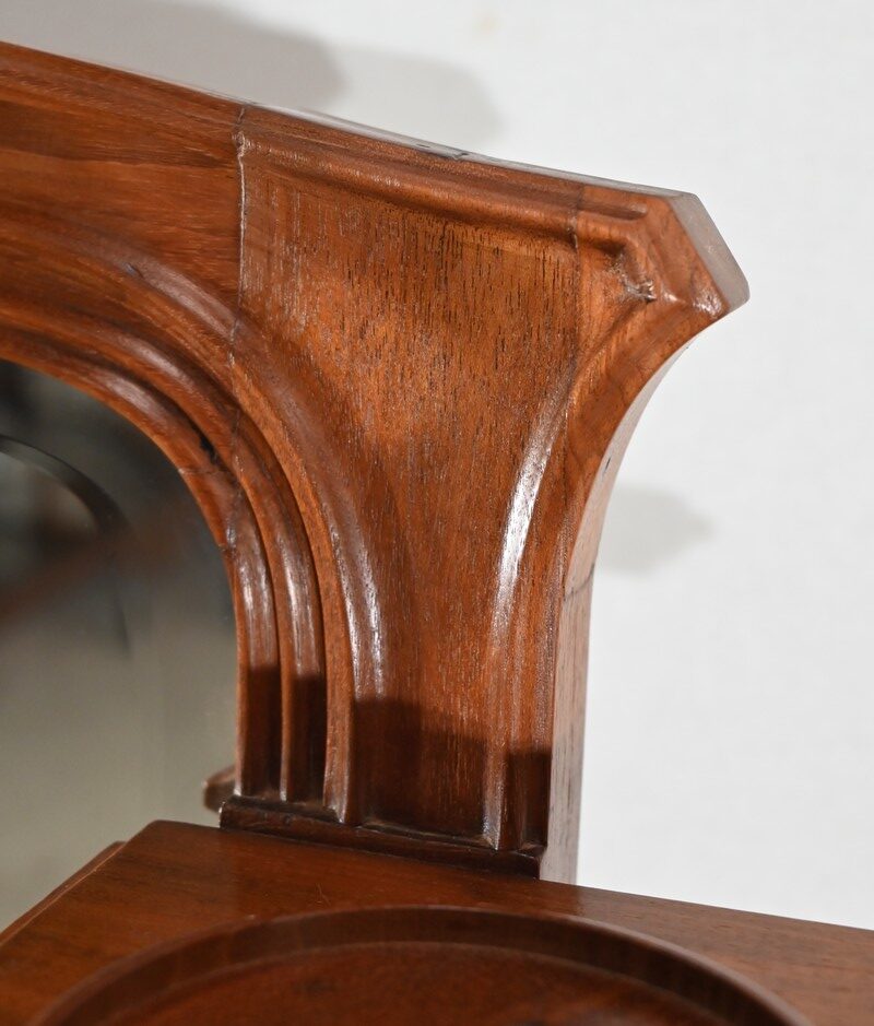 Miroir à encadrement en acajou massif, aux moulures formées par défoncement. La traverse haute est légèrement cintrée, et les quatre angles sont à ressaut.