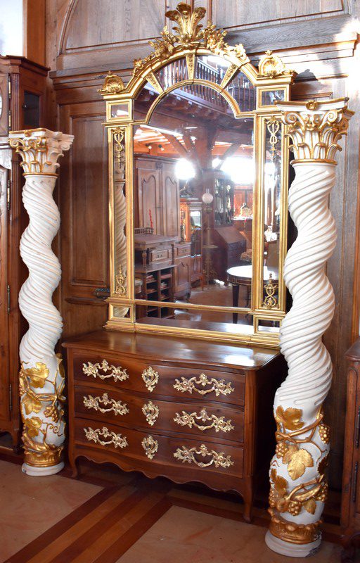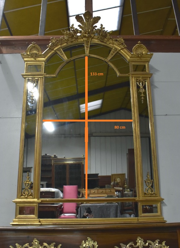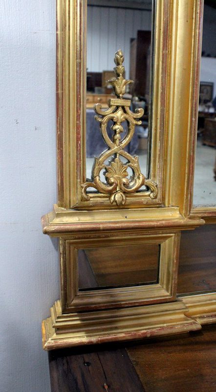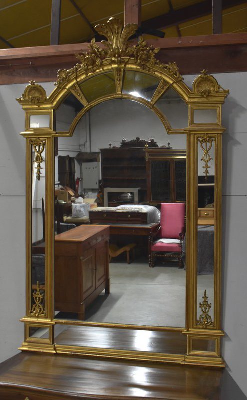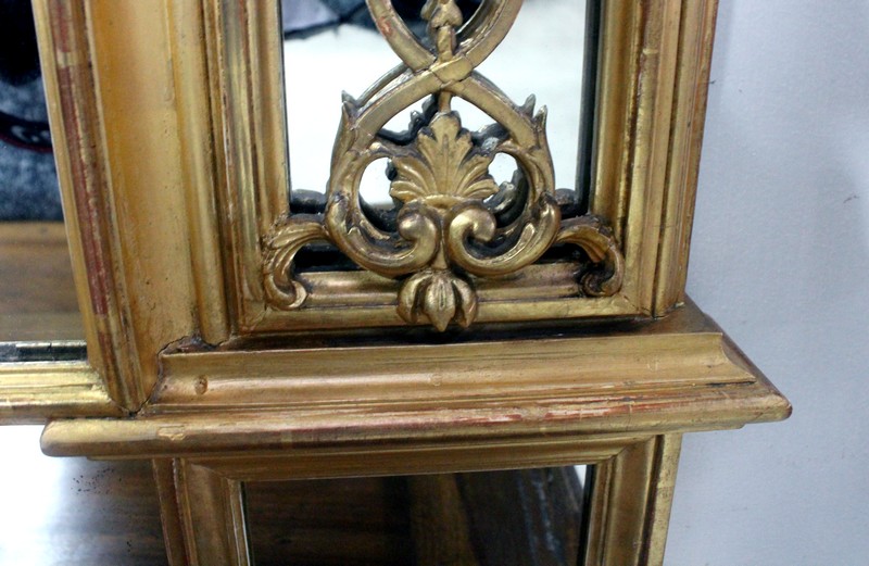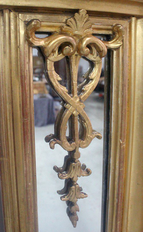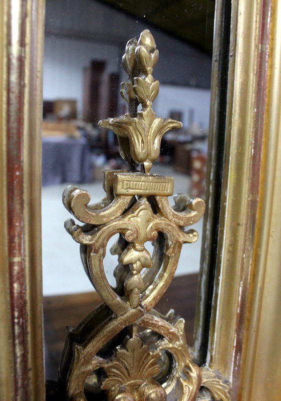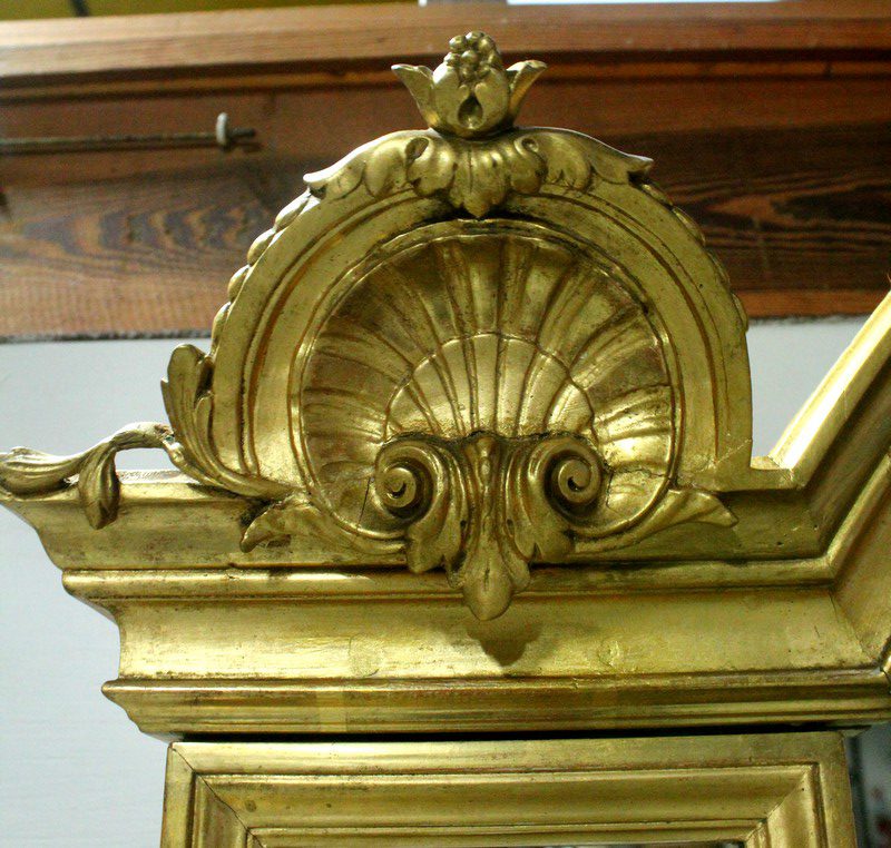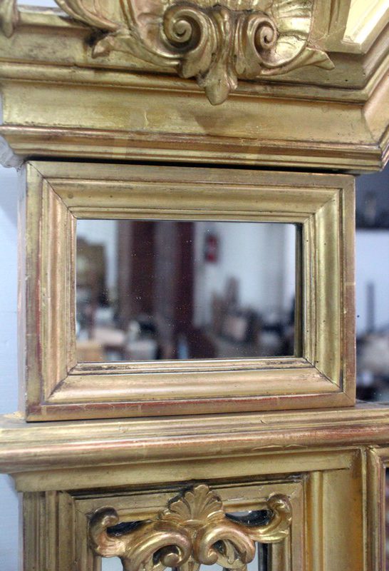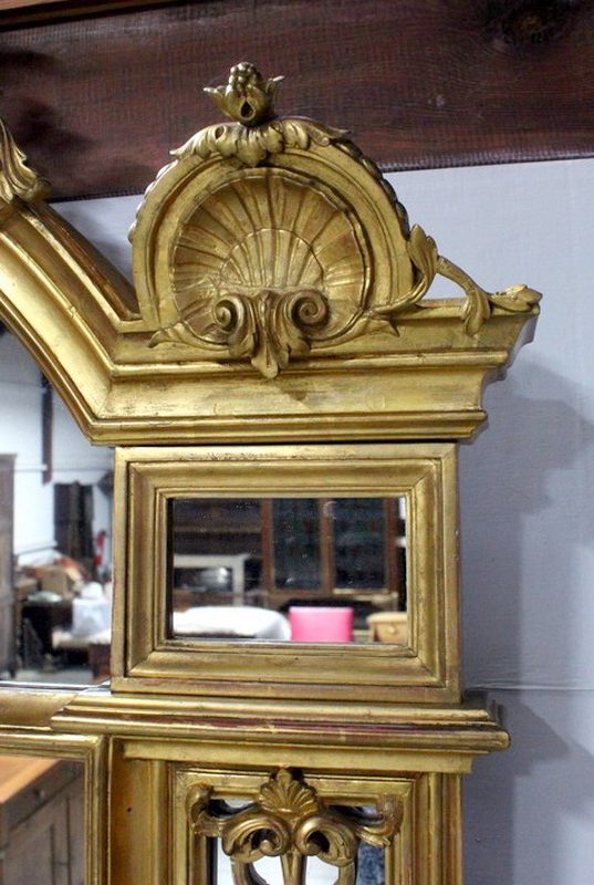 Il se compose sur chaque côté de Pilastres avec Verre Argenté au Mercure, habillés sur les parties hautes et basses de Sculptures Découpées en Motifs Fleuris. Ces Pilastres sont coiffés de Rectangles en Verre Argenté, eux-mêmes couronnés d’une belle Coquille avec Volutes.
