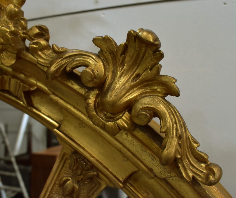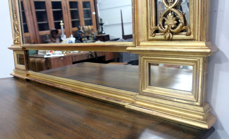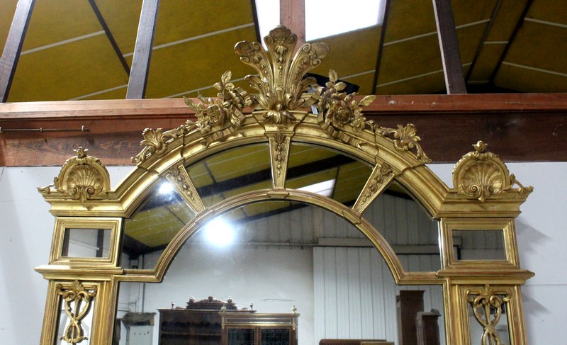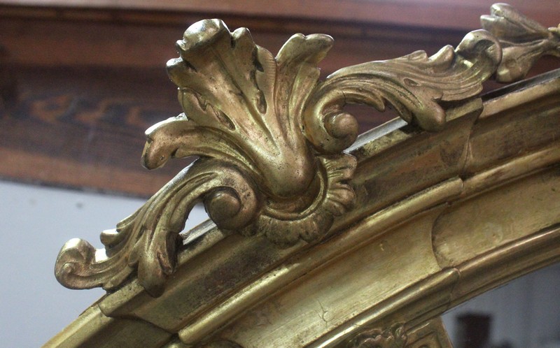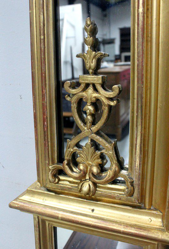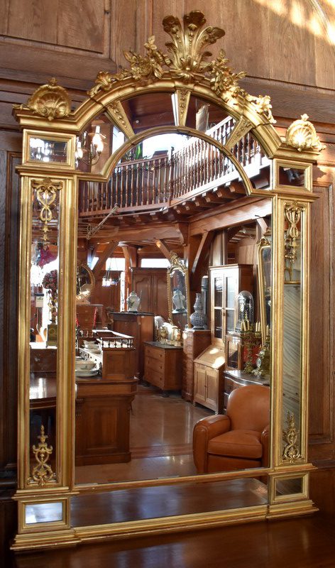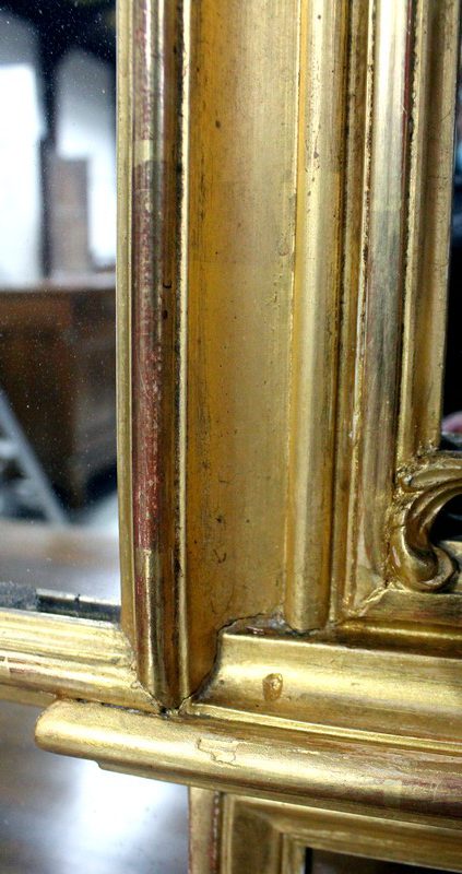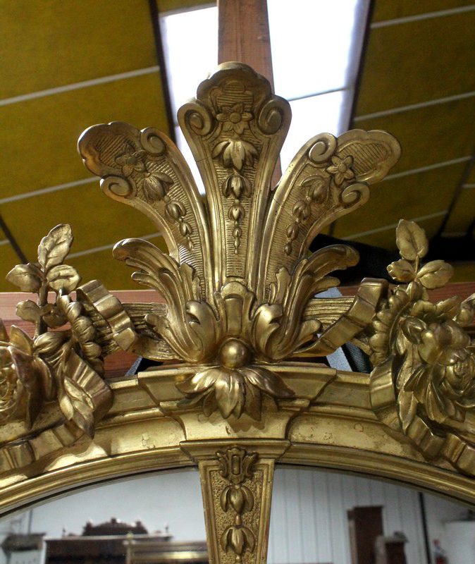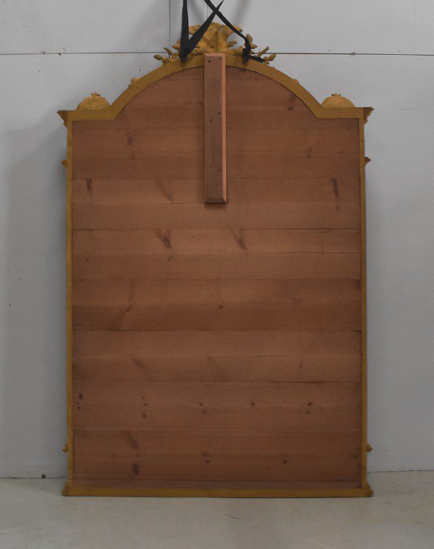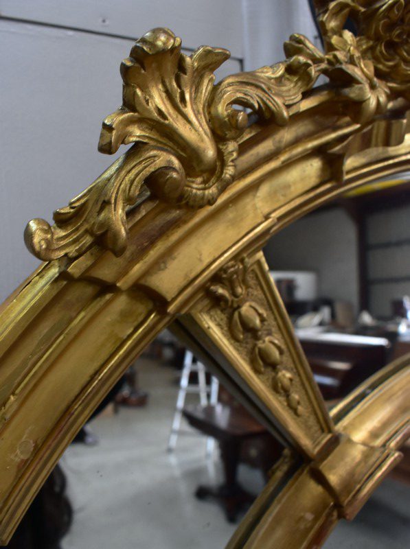 Il se compose sur chaque côté de Pilastres avec Verre Argenté au Mercure, habillés sur les parties hautes et basses de Sculptures Découpées en Motifs Fleuris. Ces Pilastres sont coiffés de Rectangles en Verre Argenté, eux-mêmes couronnés d’une belle Coquille avec Volutes.
