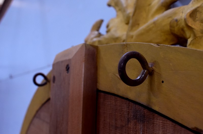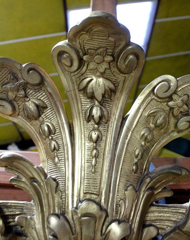 Sa partie supérieure présente une forme en « Chapeau de Gendarme », constituée de quatre Éléments de Verre. Ils sont séparé entre eux par des Éléments de Bois en Gaine avec Motifs à Saillie. Ce Fronton est agrémenté d’un Motif à trois branches Sculptées, entouré de chaque côté d’une Tombée de Fleurs et de Feuillage.