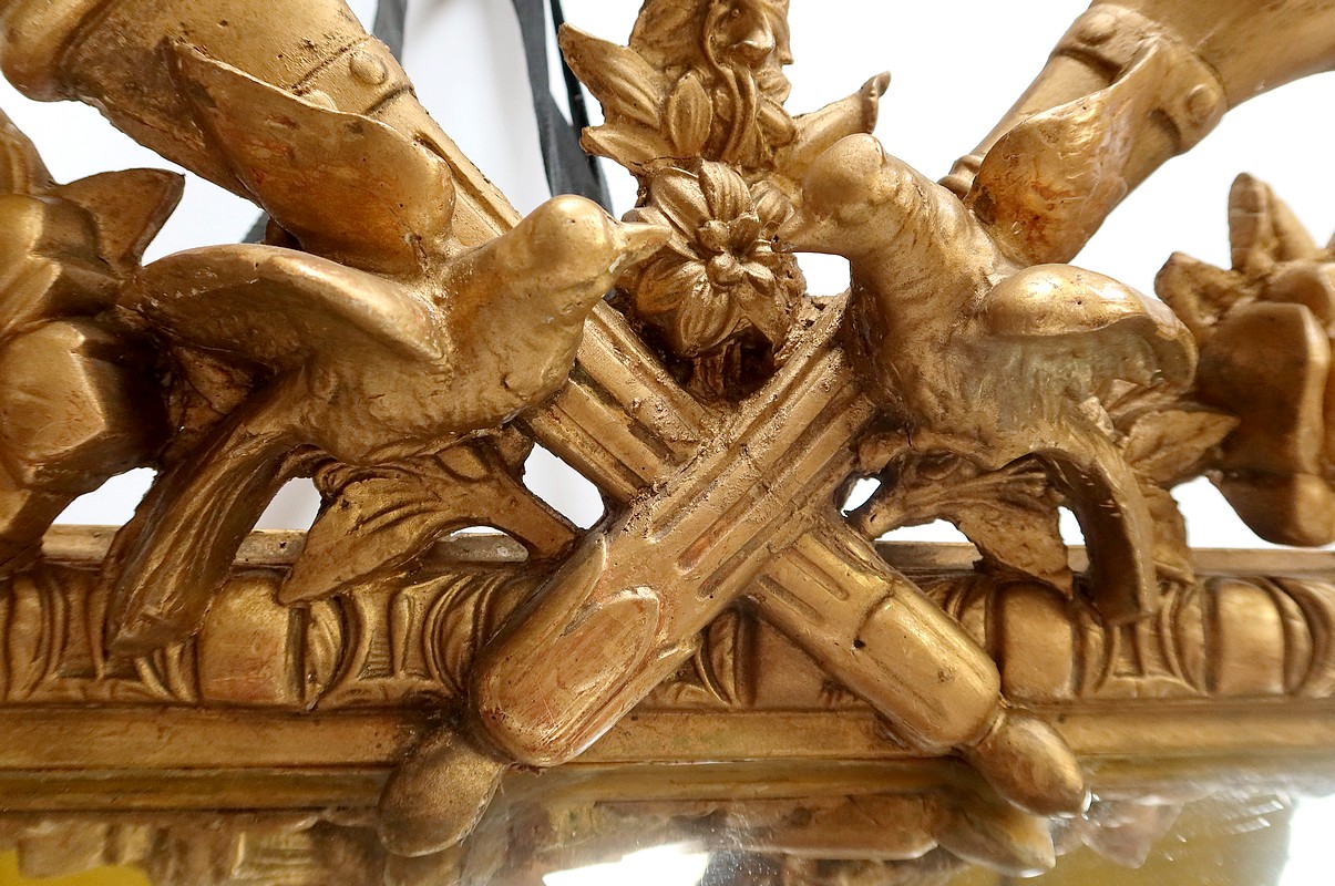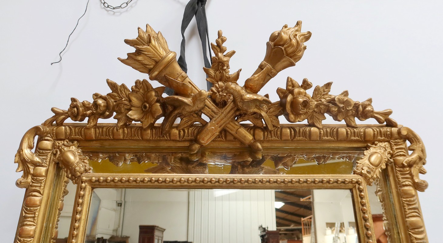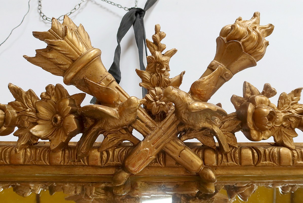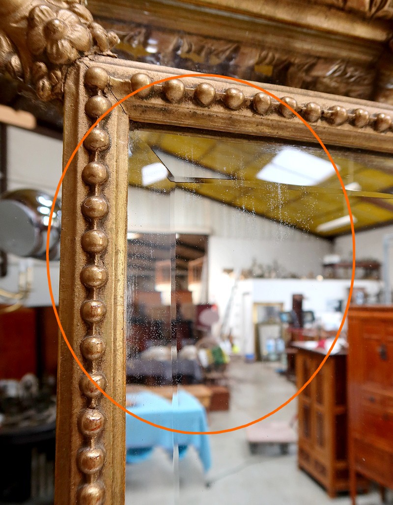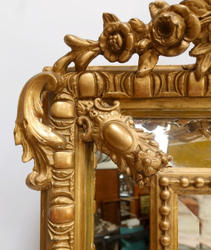 Grand Miroir à parcloses, constitué d’une glace principale rectangulaire, biseautée et saillante. Elle est complétée, par définition, de quatre secondaires, trapézoïdales. Ces glaces, au mercure, présentent des traces d’ancienneté qui, sans nuire à l’utilisation de ce Miroir, attestent de son authenticité.