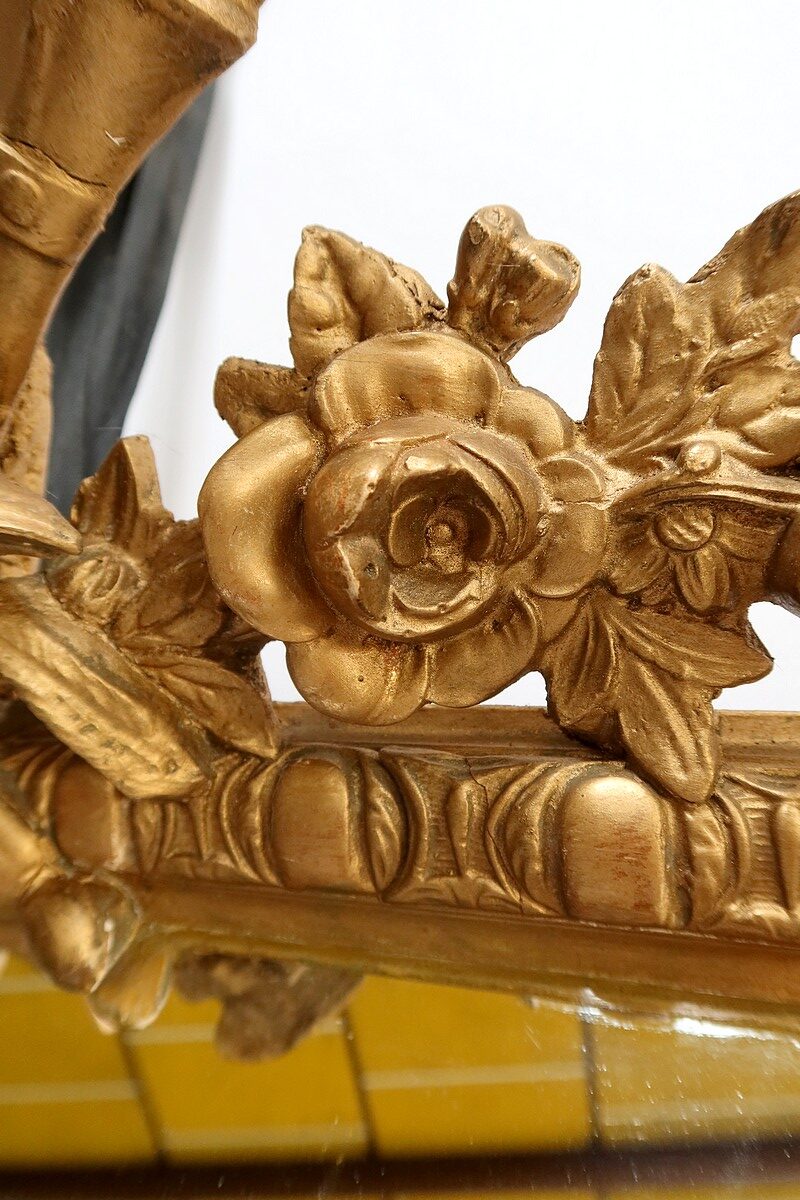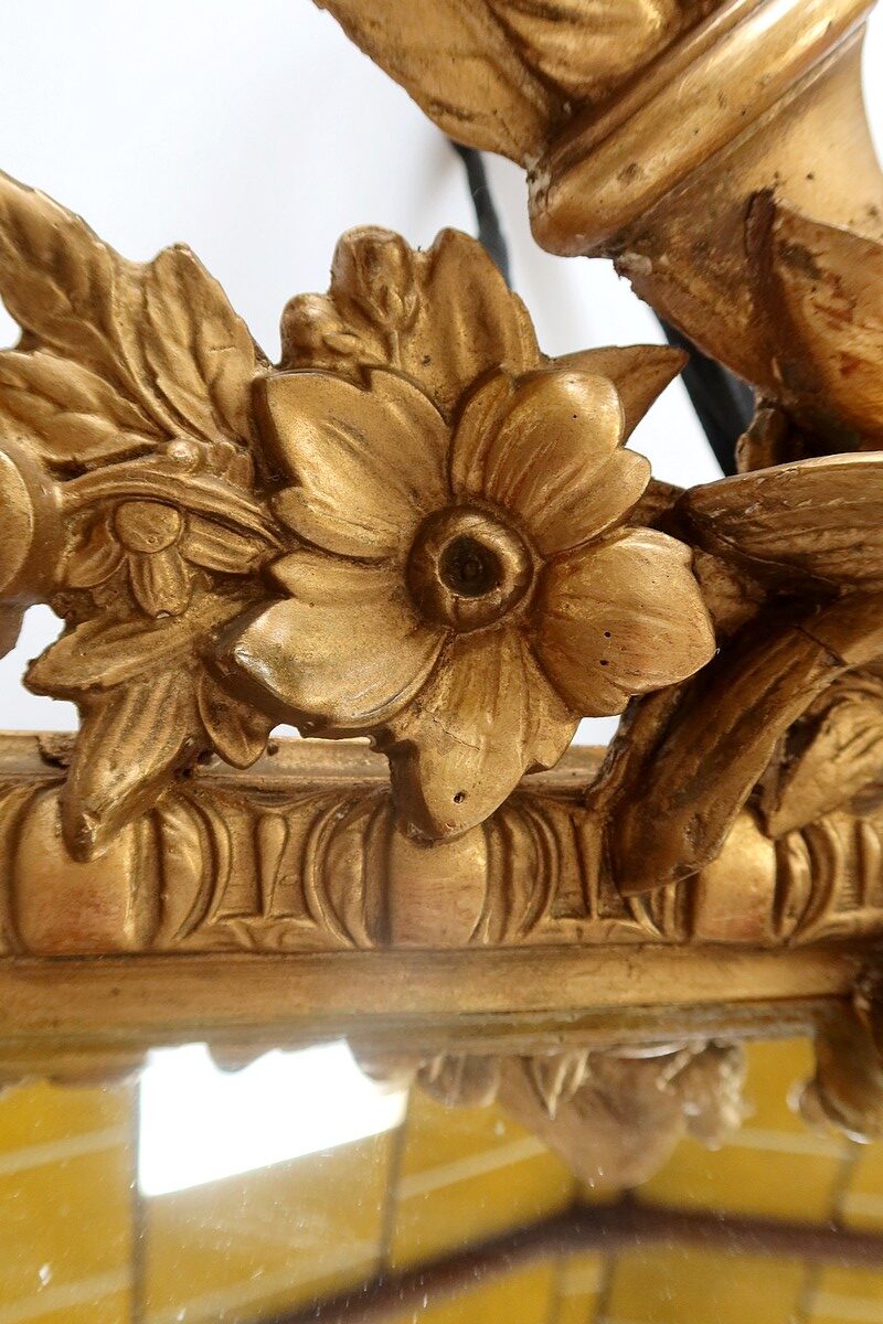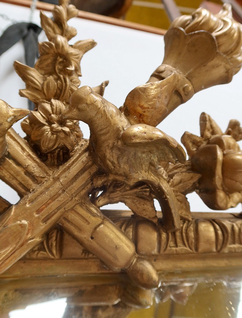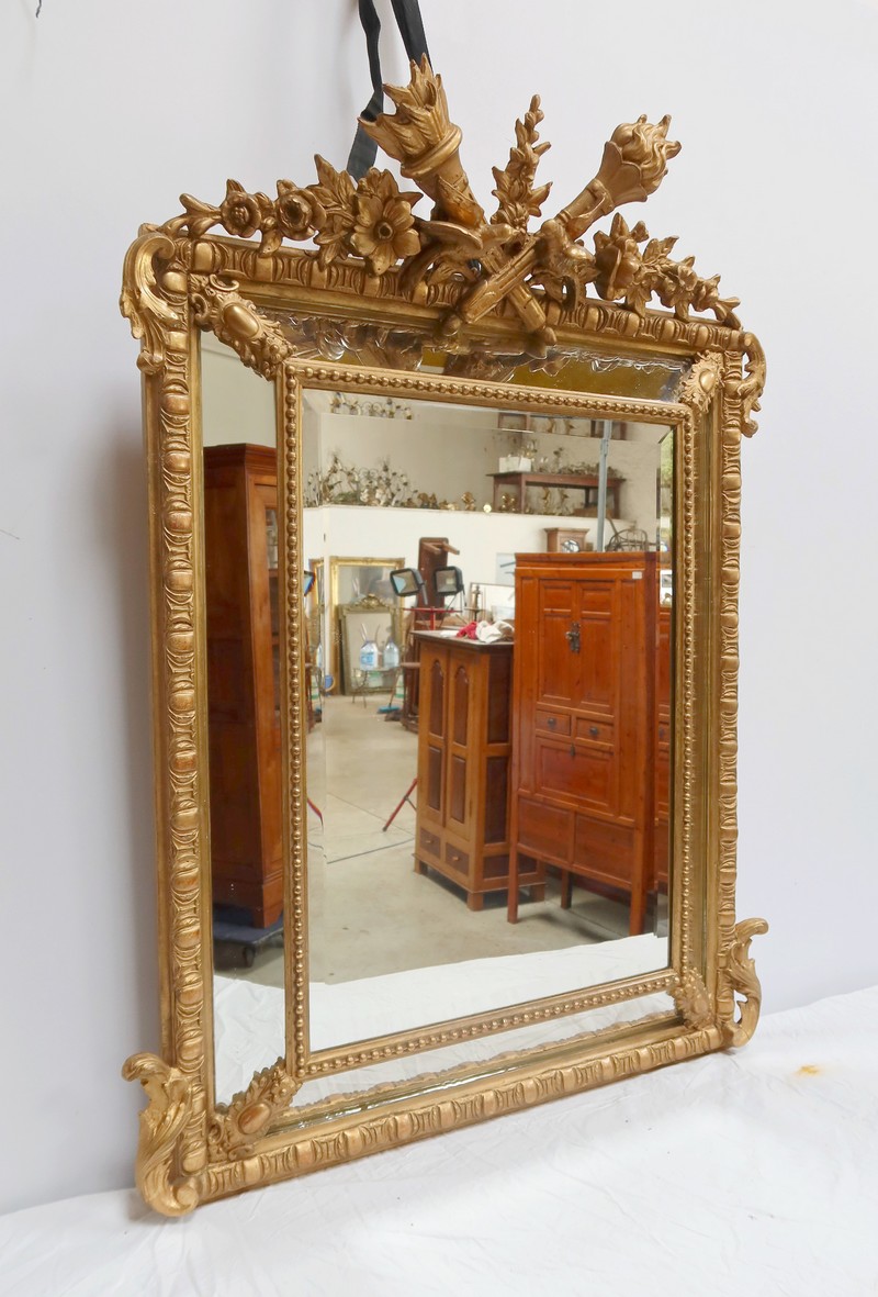 Grand Miroir à parcloses, constitué d’une glace principale rectangulaire, biseautée et saillante. Elle est complétée, par définition, de quatre secondaires, trapézoïdales. Ces glaces, au mercure, présentent des traces d’ancienneté qui, sans nuire à l’utilisation de ce Miroir, attestent de son authenticité.