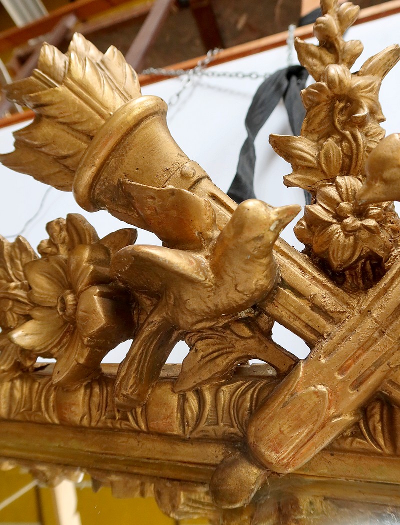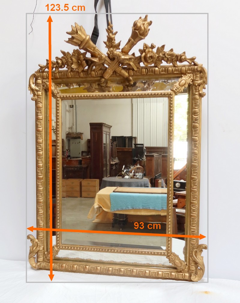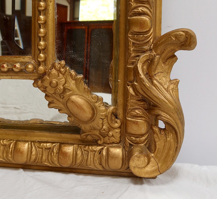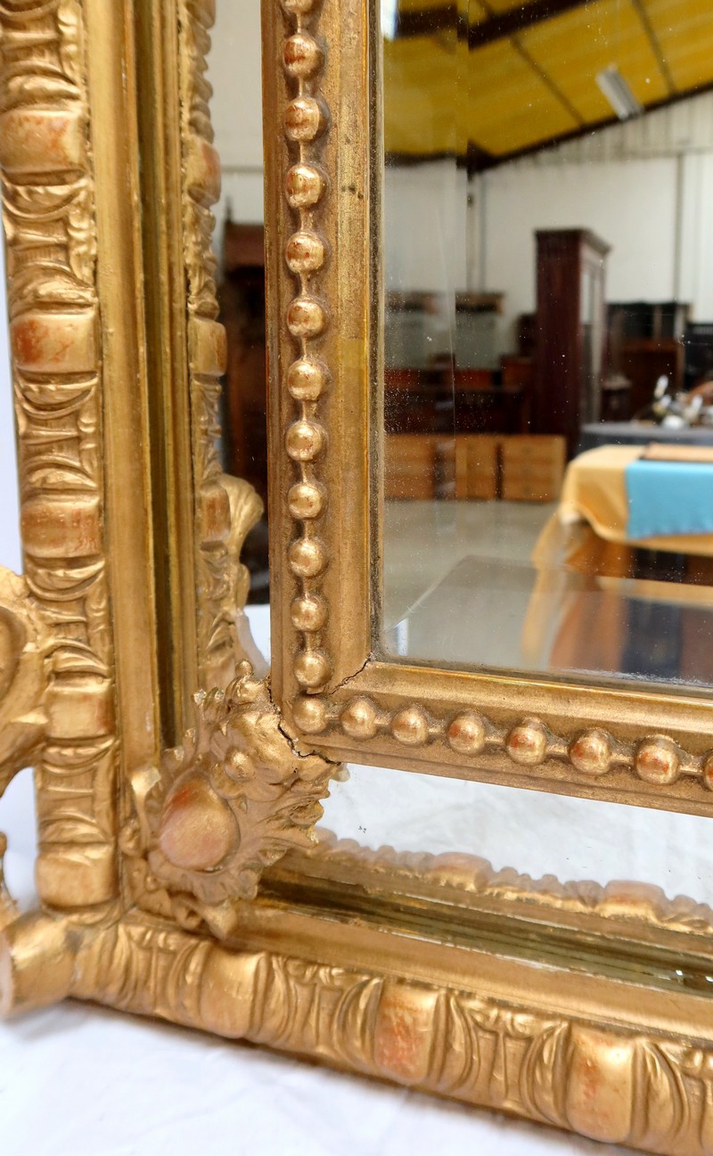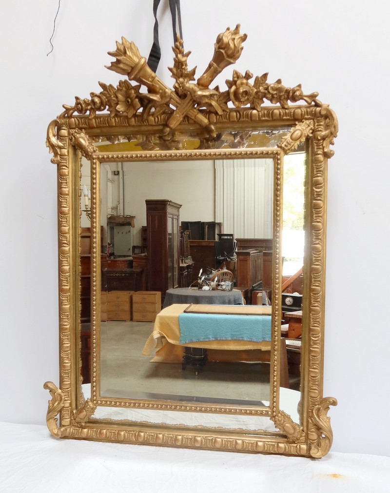 Grand Miroir à parcloses, constitué d’une glace principale rectangulaire, biseautée et saillante. Elle est complétée, par définition, de quatre secondaires, trapézoïdales. Ces glaces, au mercure, présentent des traces d’ancienneté qui, sans nuire à l’utilisation de ce Miroir, attestent de son authenticité.