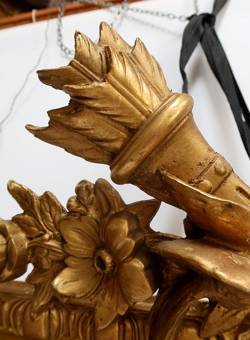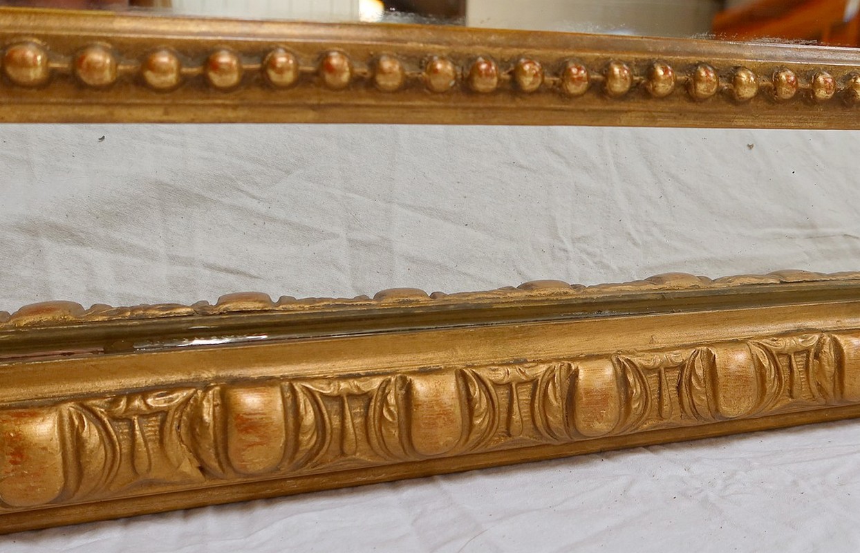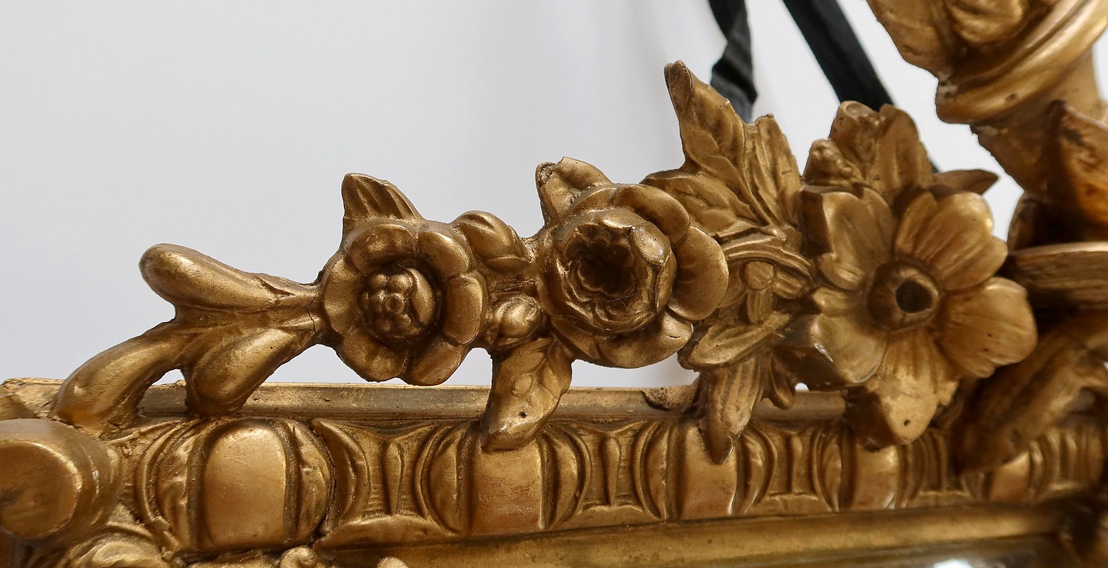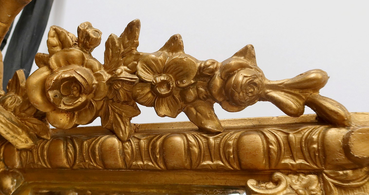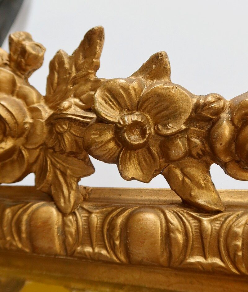 Les cadres en bois doré sont perlés pour celui de l’intérieur, festonnés pour celui de l’extérieur. Ils sont reliés par des ornementations sculptées.